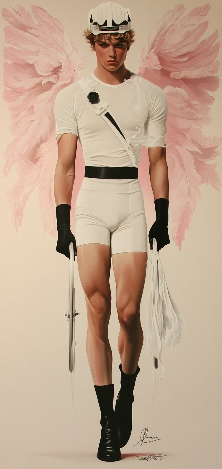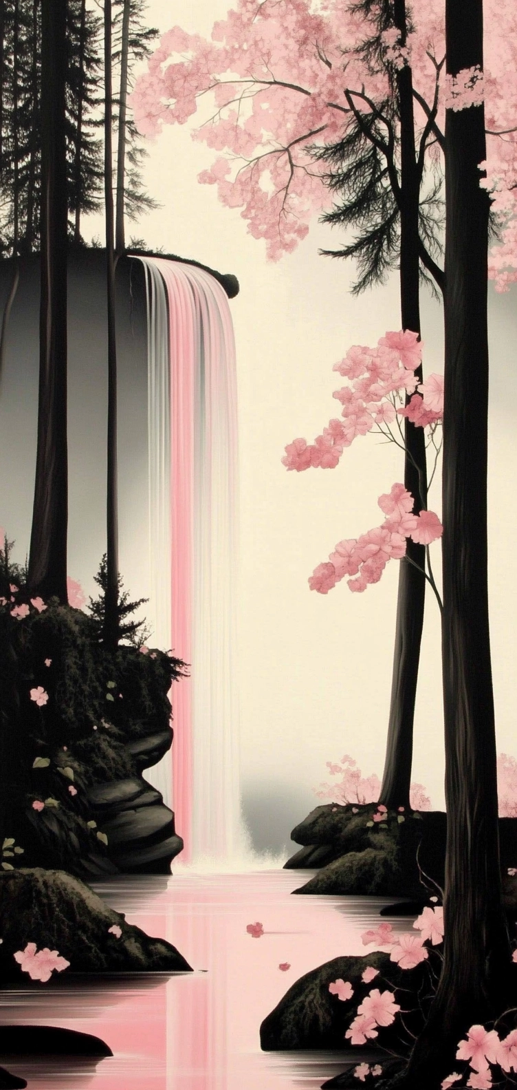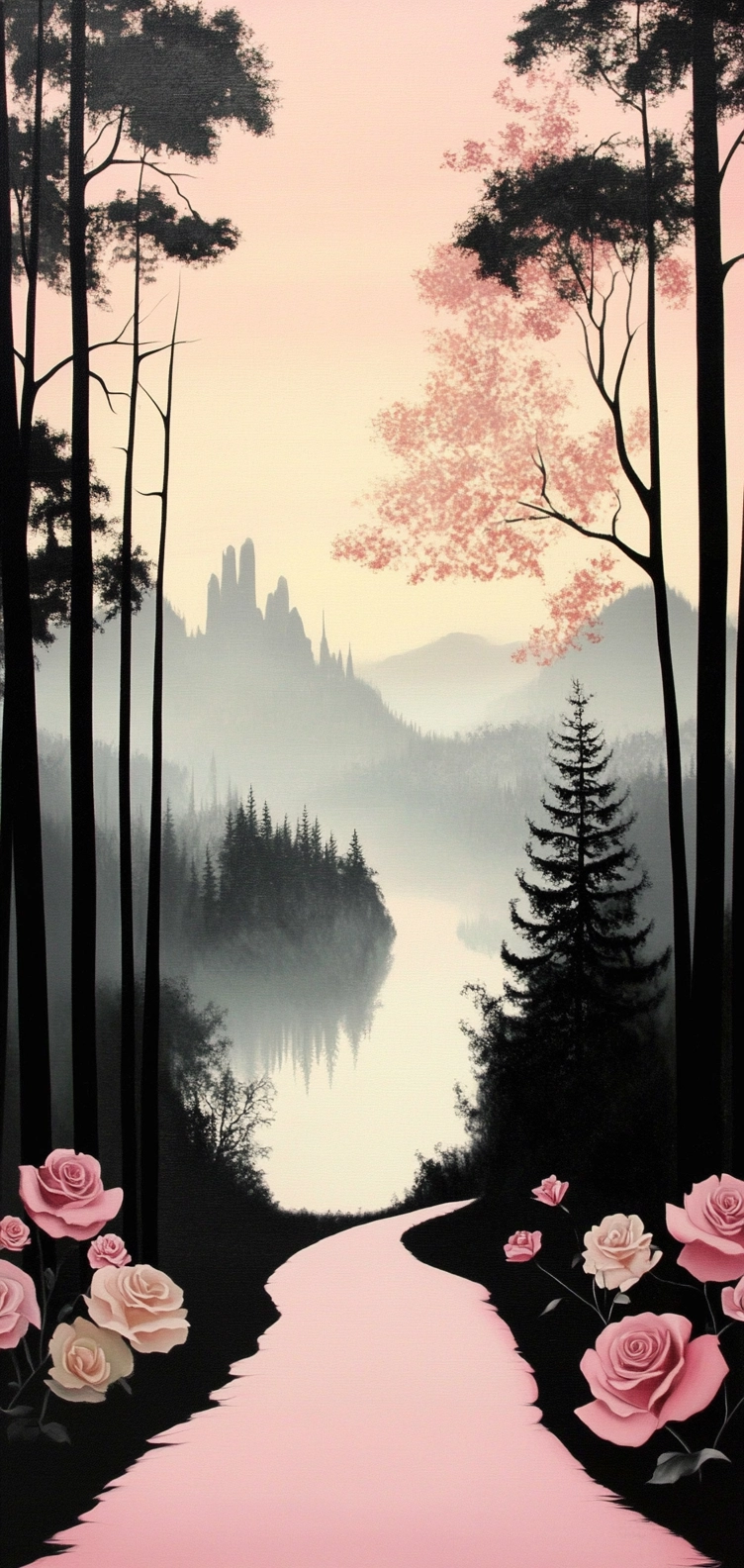 Soft pink tones contrast with stark black in a balanced composition.