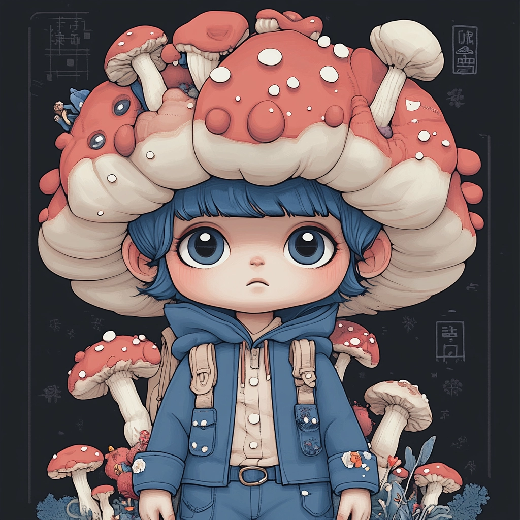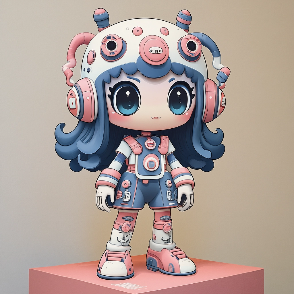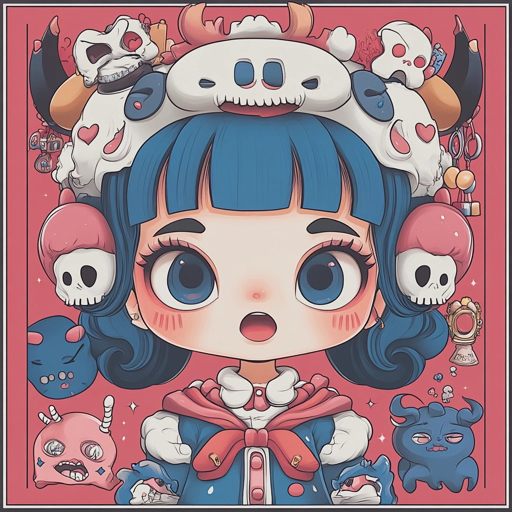 The composition uses vibrant pastel tones with a playful and structured layout, emphasizing detailed character design and thematic motifs.