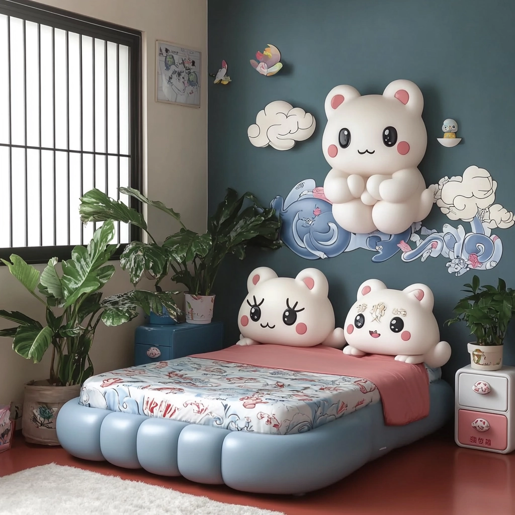 Lighting effects are soft, emphasizing contrast against vibrant colors, while spatial elements have a robust, yet smooth delineation. The textures are rendered to convey playful motifs with clarity and precision, utilizing consistent shading techniques.