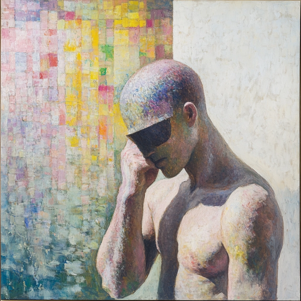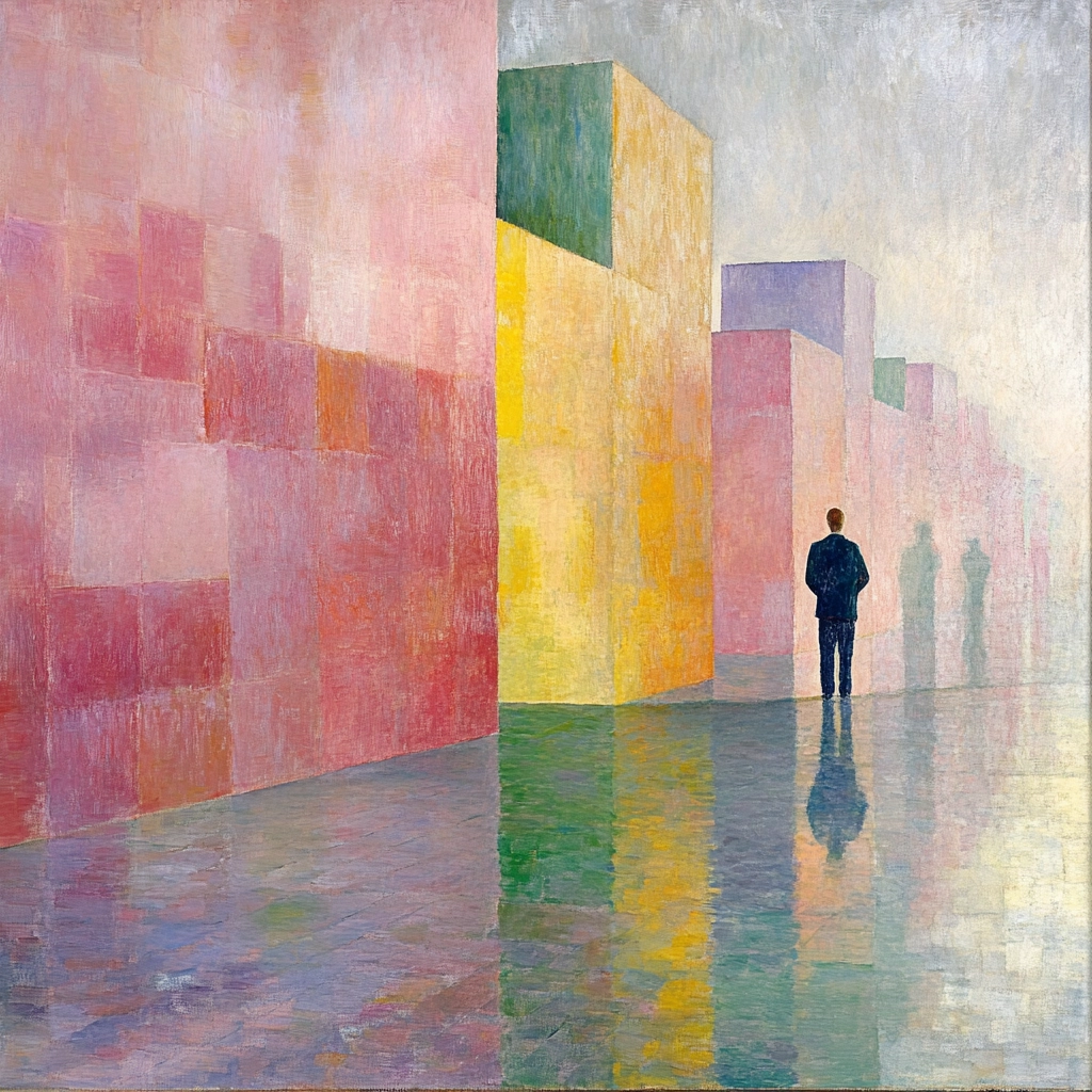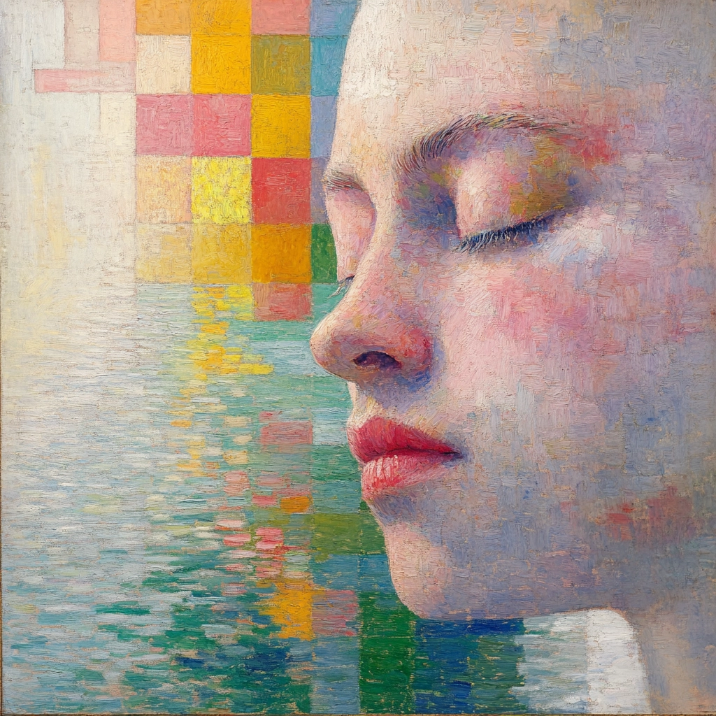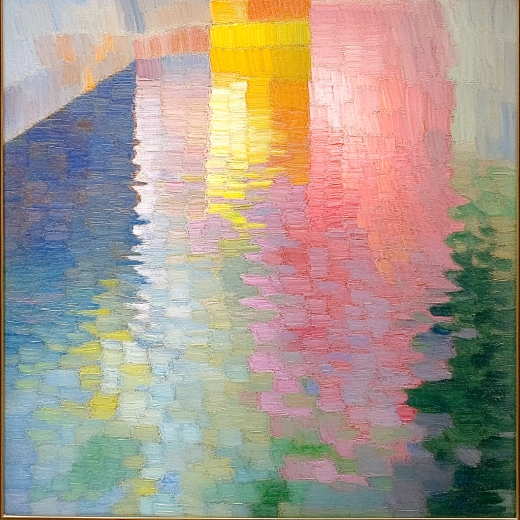 Delicate lighting highlights the gentle pastel tones, creating a soothing atmosphere. Colors transition smoothly, enhancing spatial depth and defining textures. The pixel block effect introduces an organized complexity that contrasts subtly with fluid reflective surfaces.