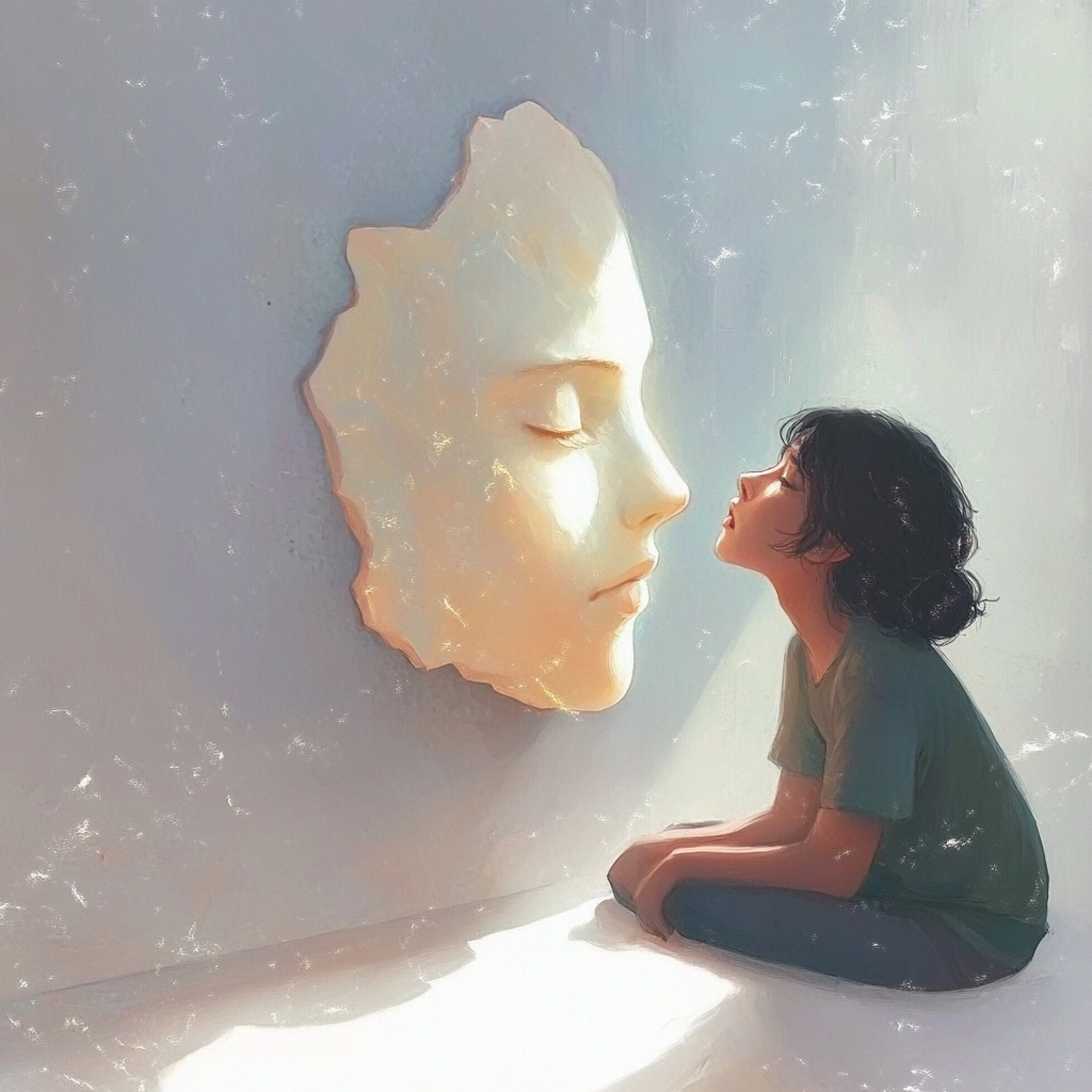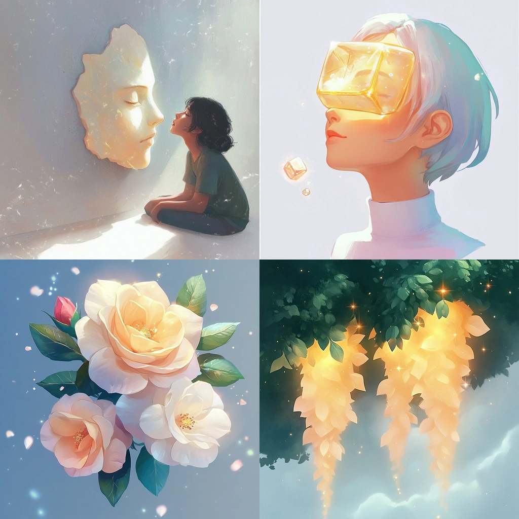 The light is diffused beautifully, enhancing soft edges and pastel colors. There is a subtle transition between foreground and background, with textures that evoke a sense of tenderness.