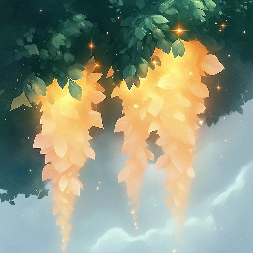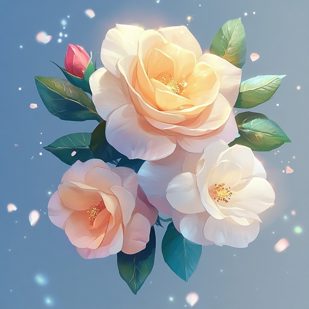 Soft, pastel palette with delicate lighting creates gentle and inviting scenes.