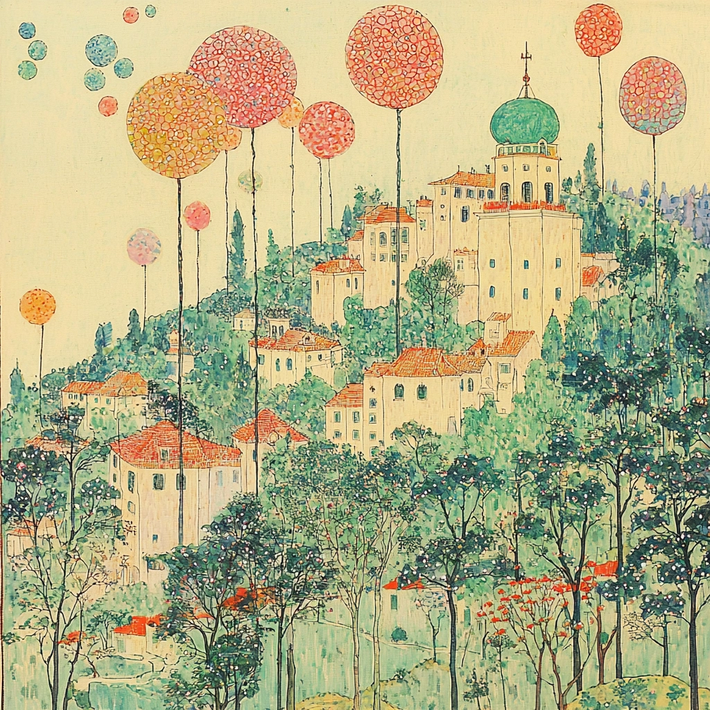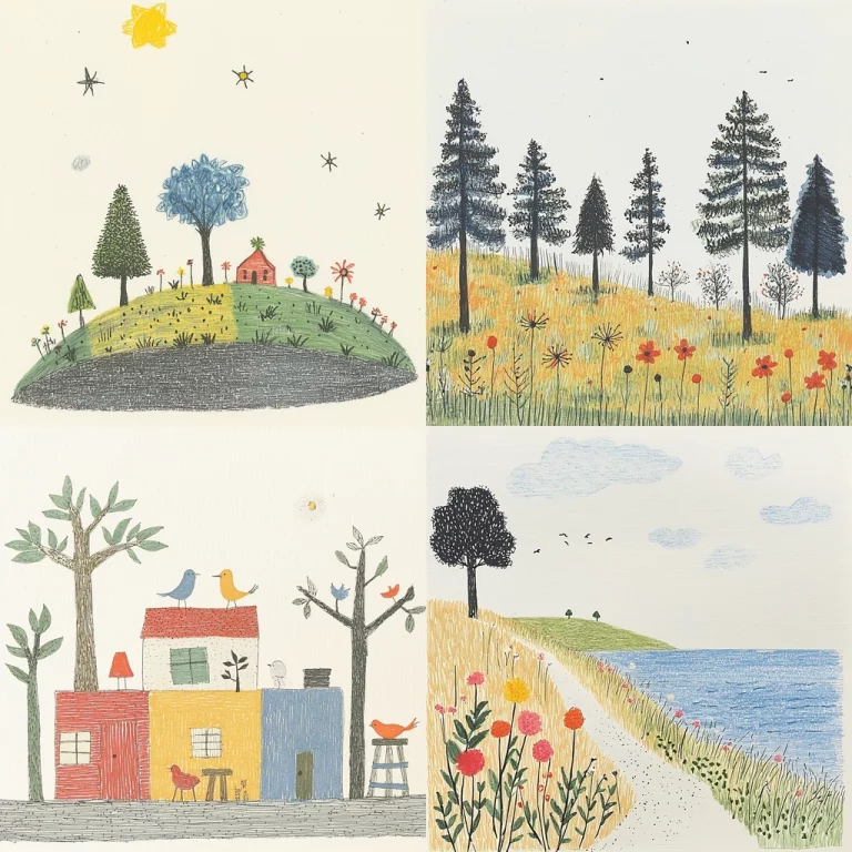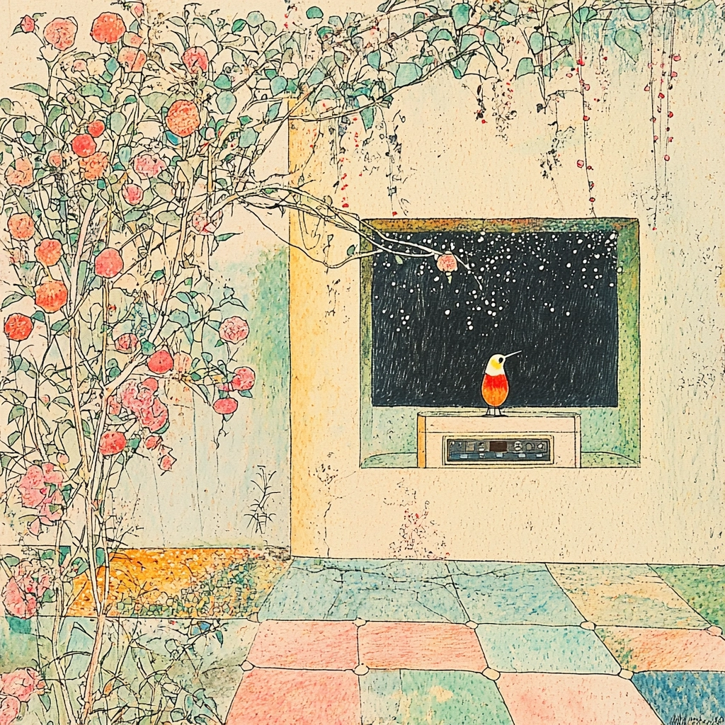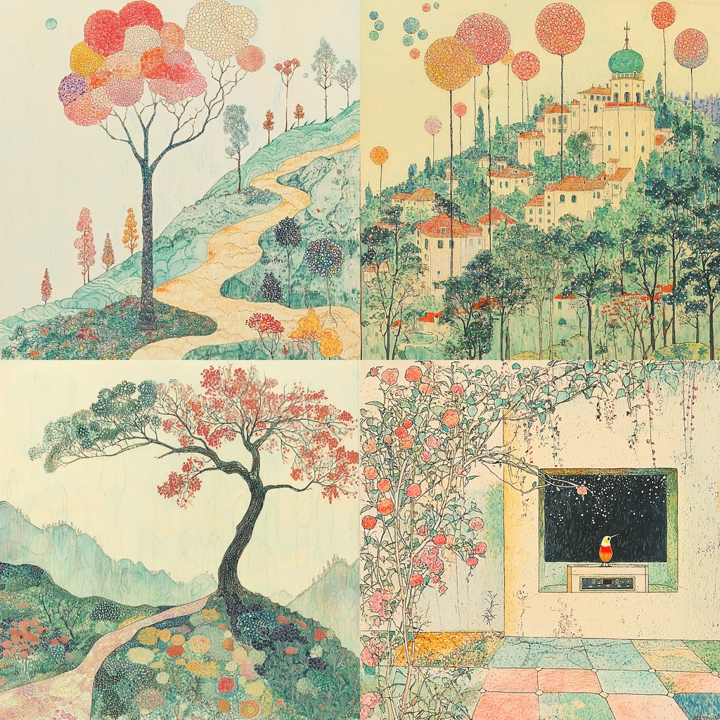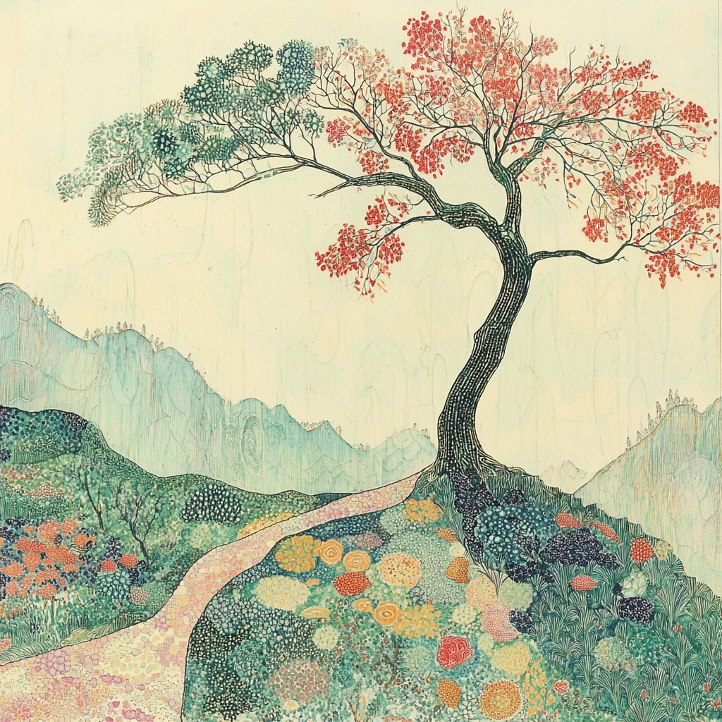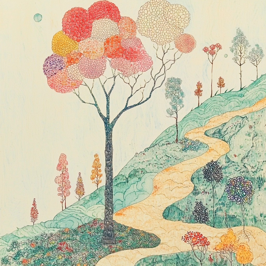 Gentle lighting with muted pastel tones forms a dreamlike quality. Colors are balanced and harmonized, enhancing a peaceful vibe. Fine textures and delicate outlines contribute to a subtle complexity, with an organic composition depicting a fluid natural scene.