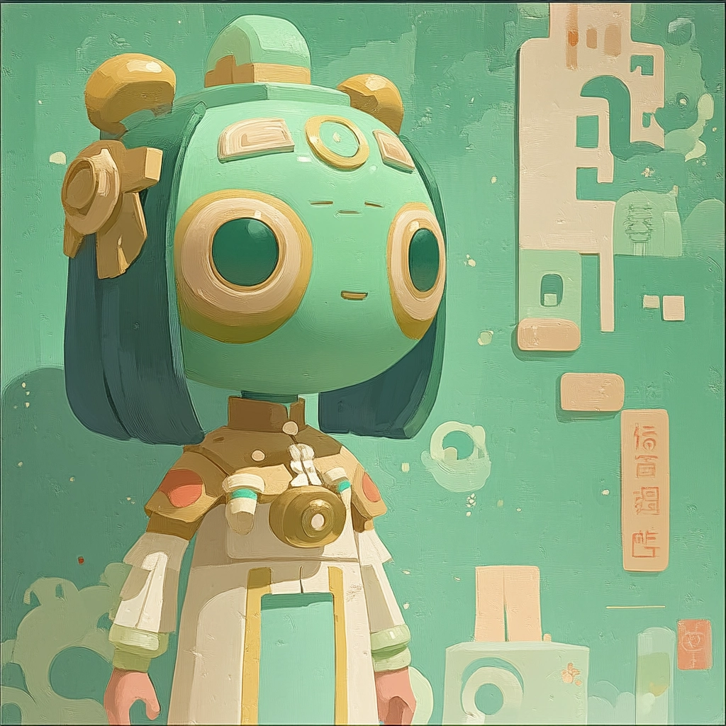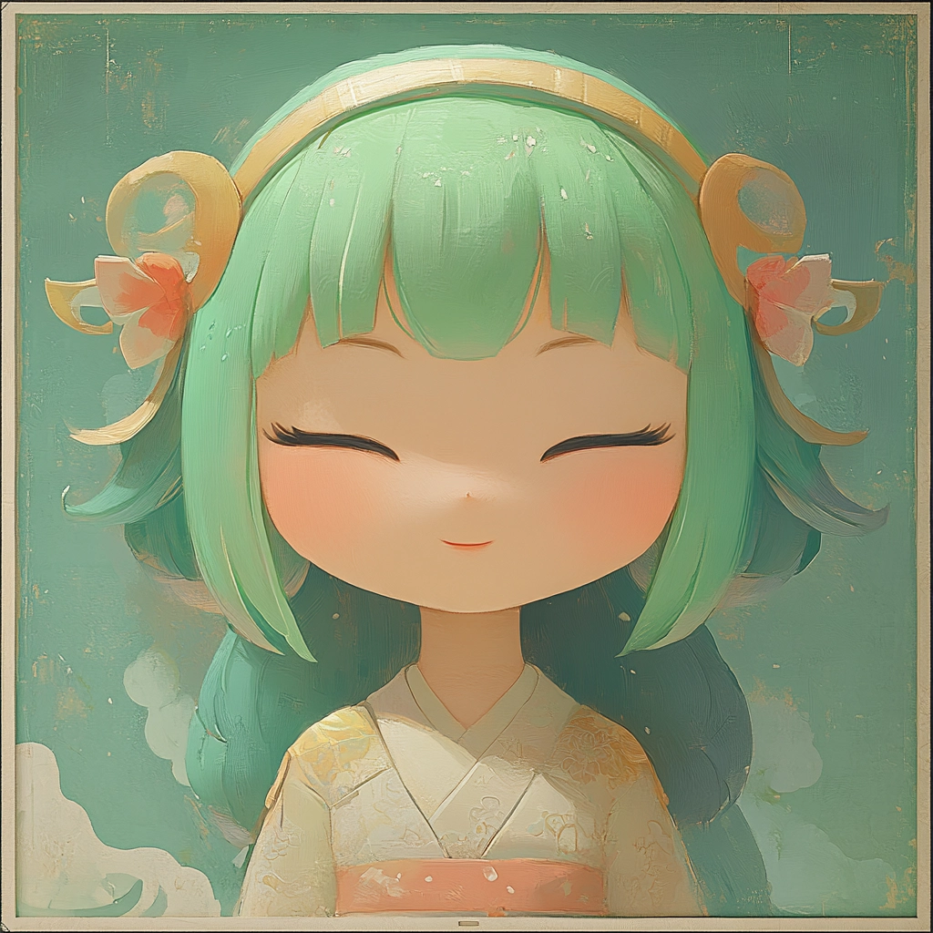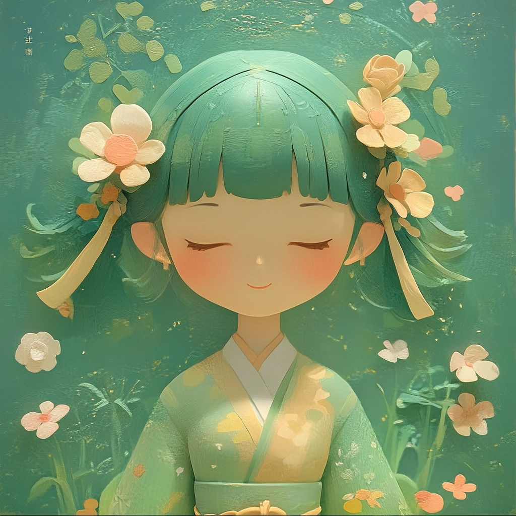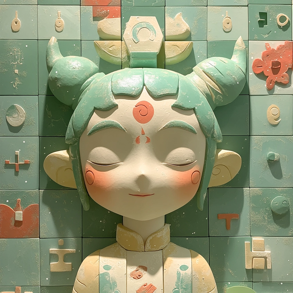 The lighting is even and subtle, enhancing the pastel color palette. Greens dominate the scene, contrasted with soft pinks and beiges. The spatial arrangement appears organized, with various shapes and forms adding depth. The textures are smooth and polished, contributing to an overall gentle tactile impression.
