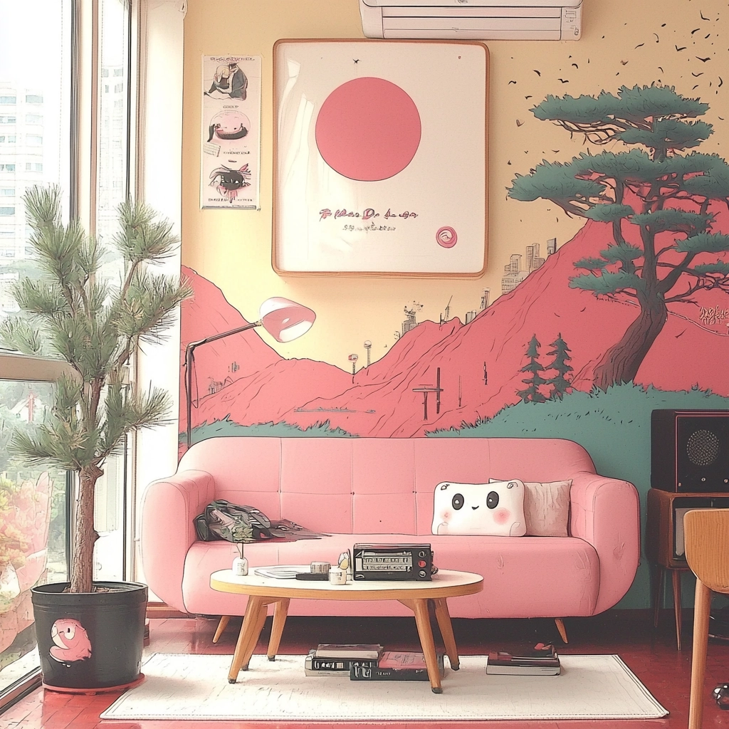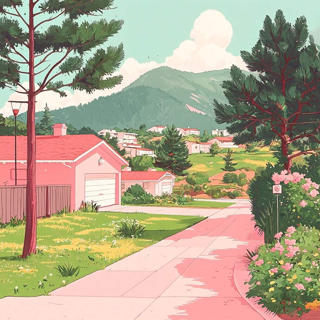 The lighting is evenly distributed, creating a gentle and inviting feel. The use of pastel colors, predominantly pink and green, results in a soft and playful aesthetic. The spaces are well-defined, with clear and precise lines adding a crisp texture to the overall appearance.