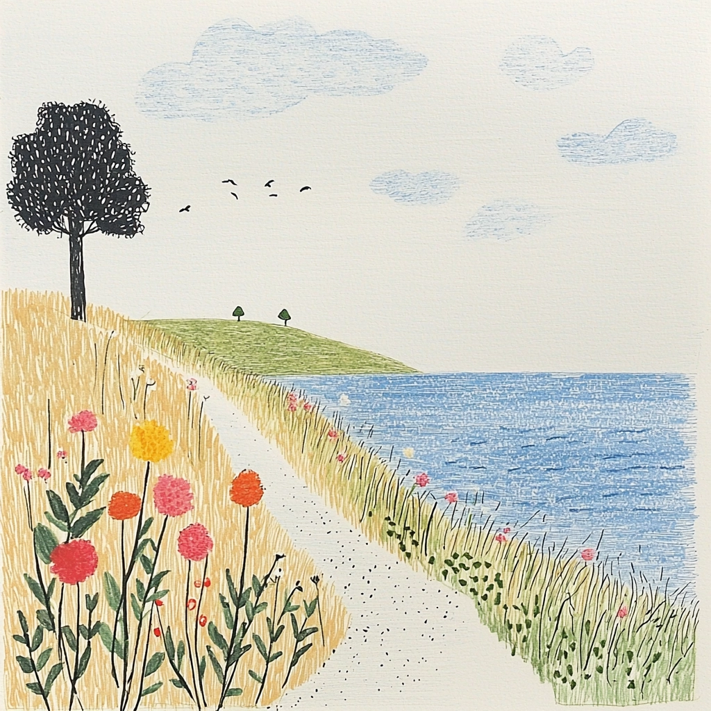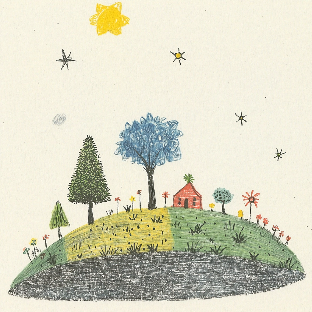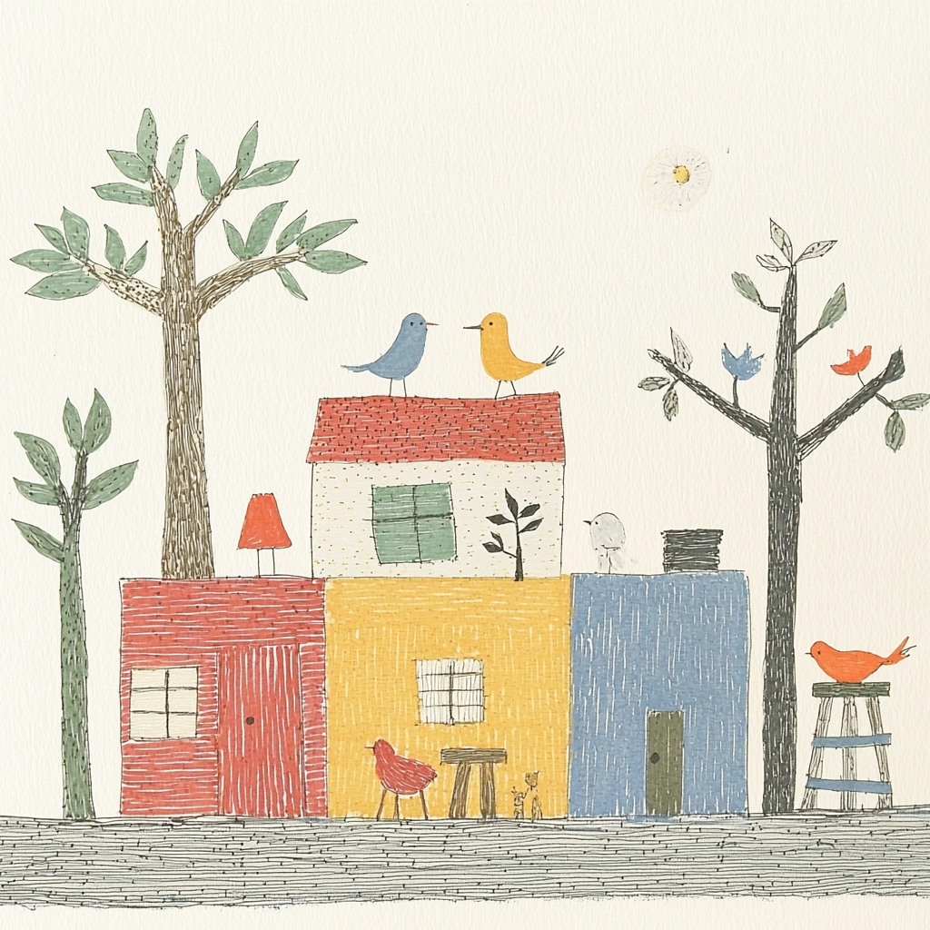 Soft lighting highlights pastel colors with a matte finish, creating a sense of open space with playful, simplified forms. Textures are delicately rendered, enhancing the charm without overpowering the gentle interplay of colors.