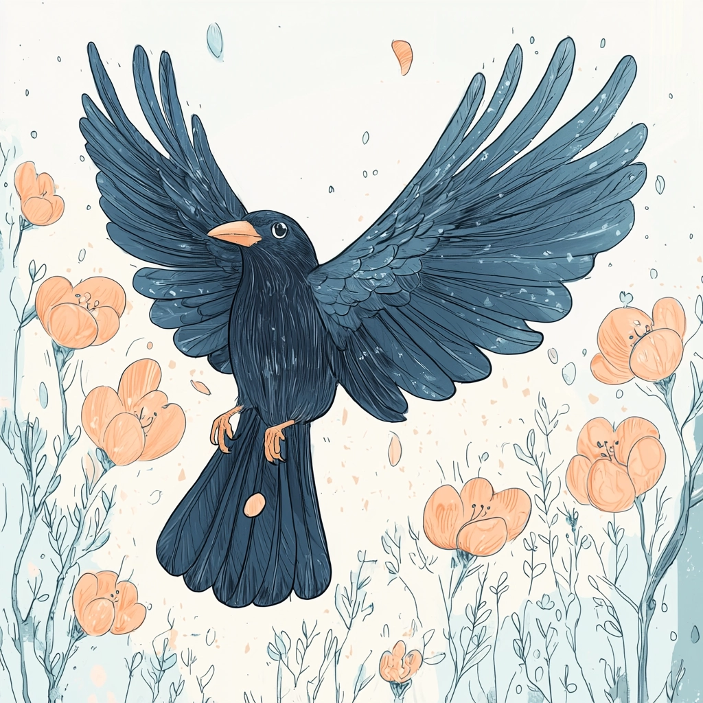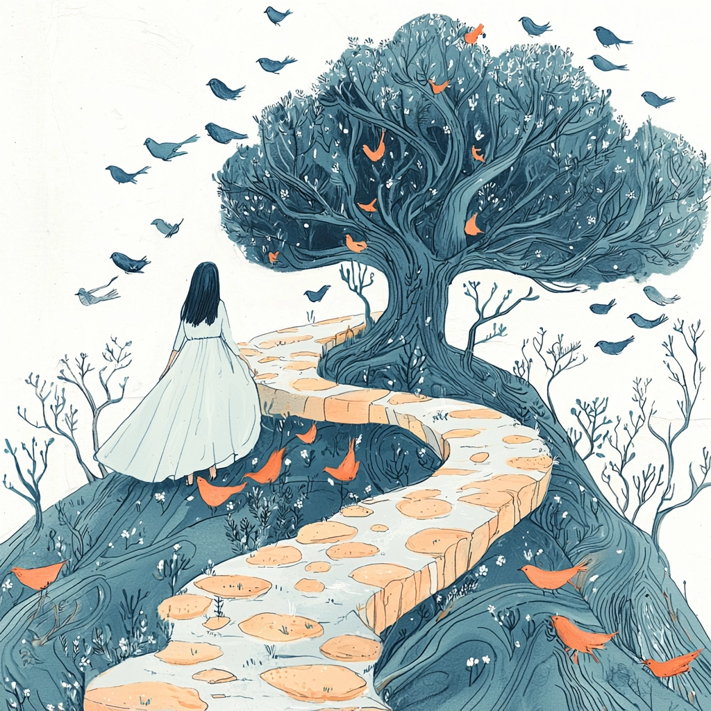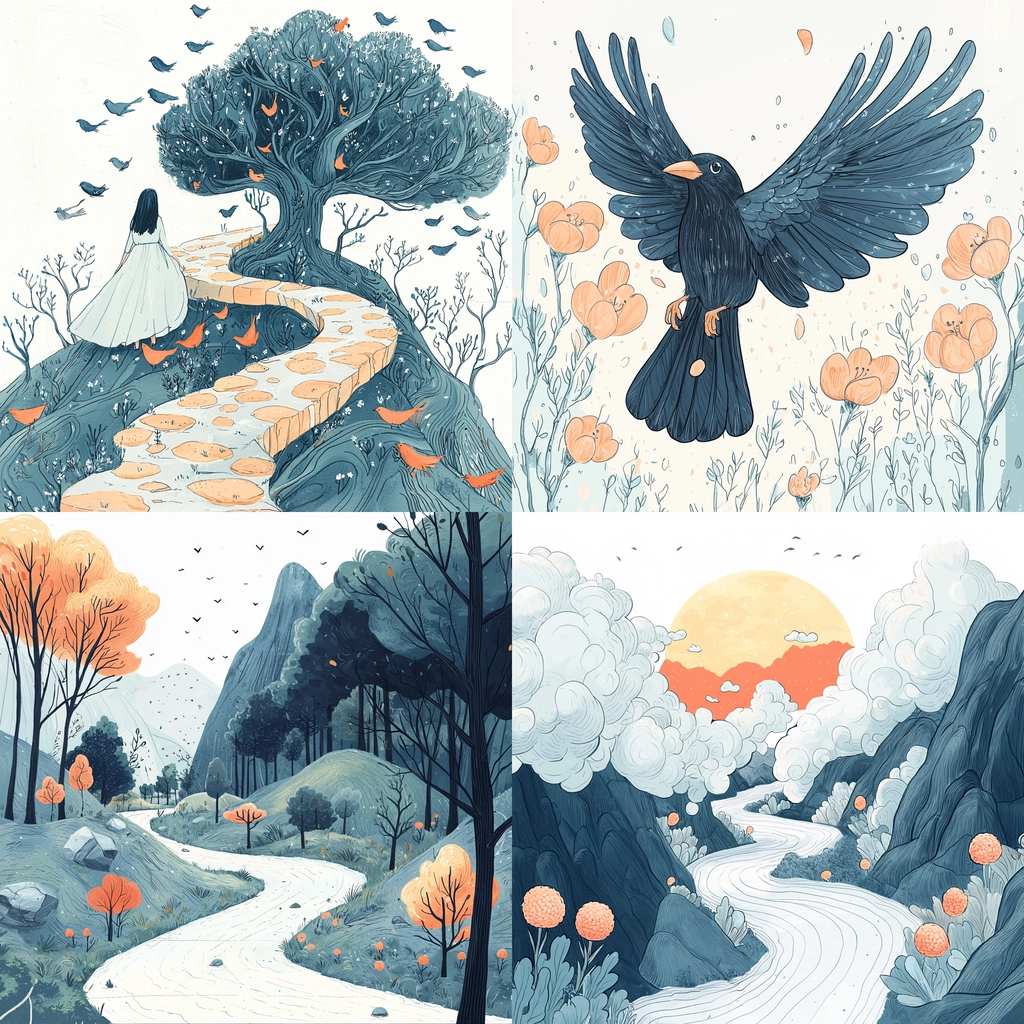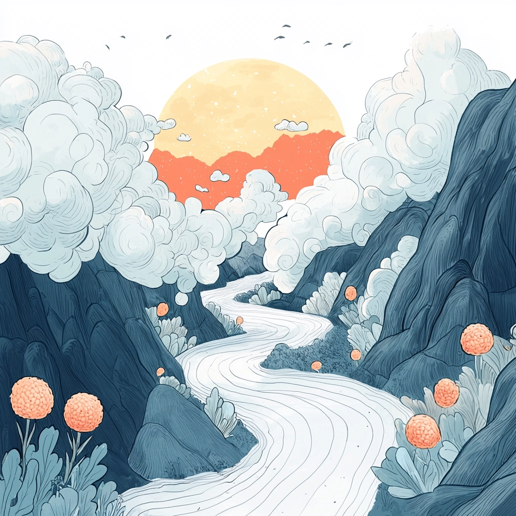 Lighting effects are subdued, contributing to an evenly lit scene. Colors are soft and complementary, with deep blues and warm oranges standing out against the light background. Spatial sense maintains clarity and depth through clean line work. Texture expression is smooth and simplified, emphasizing the gentle, flowing forms.