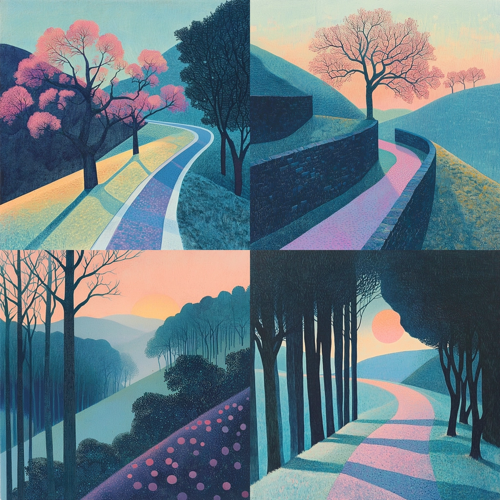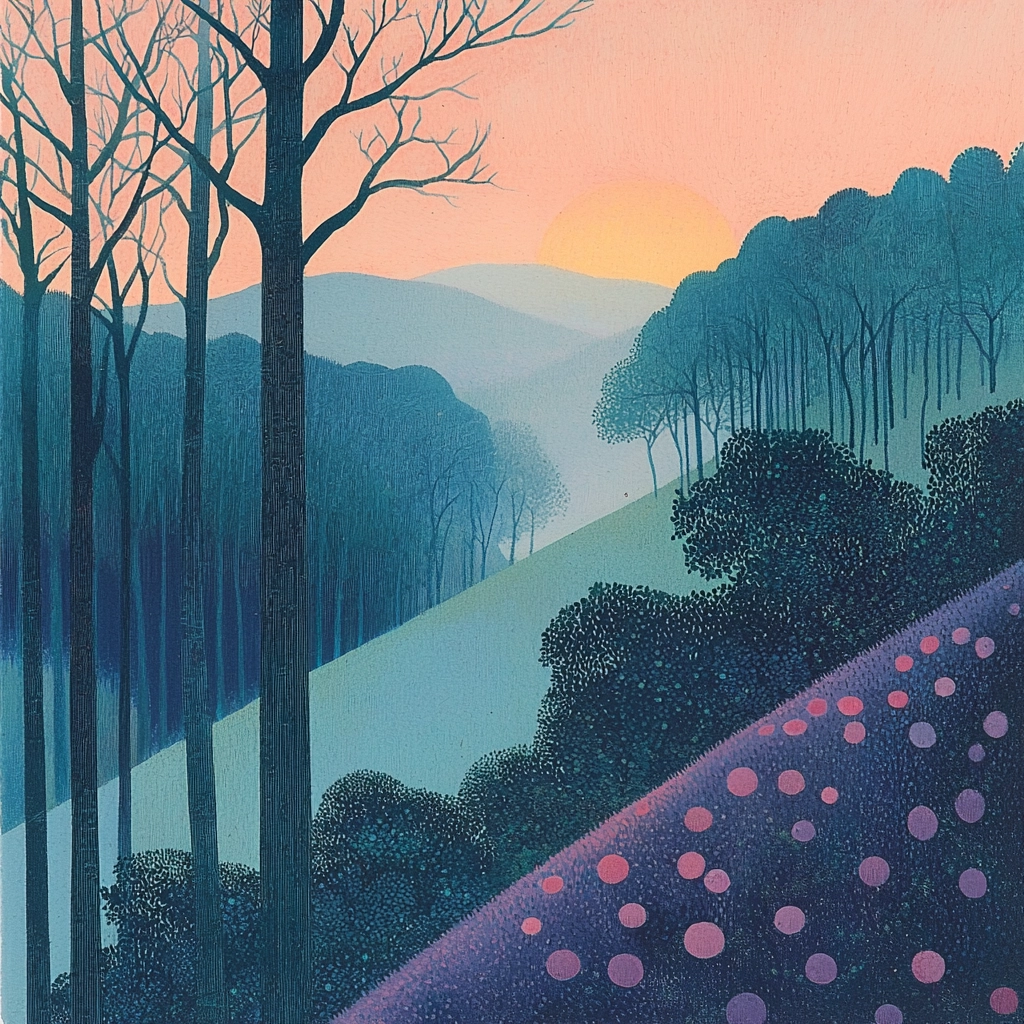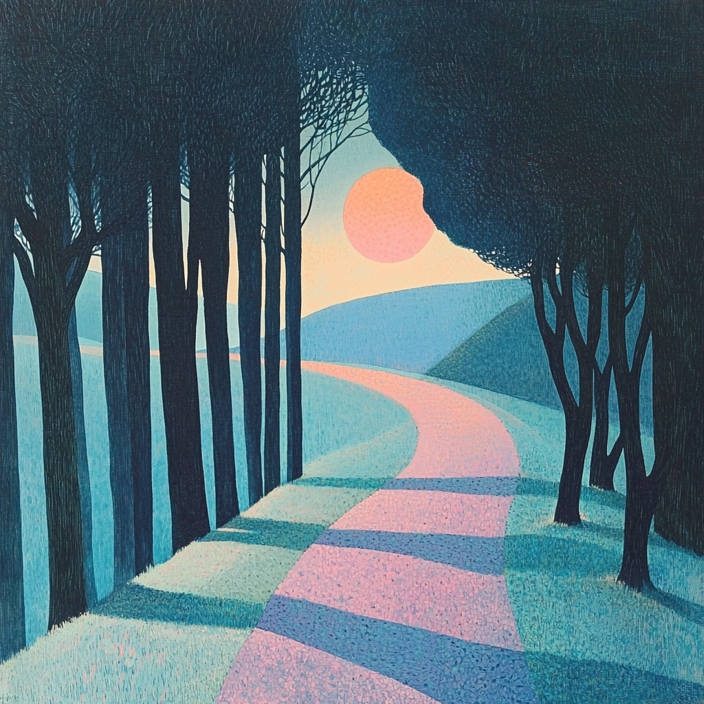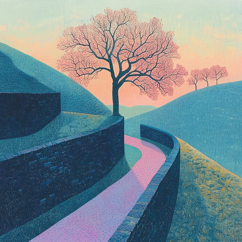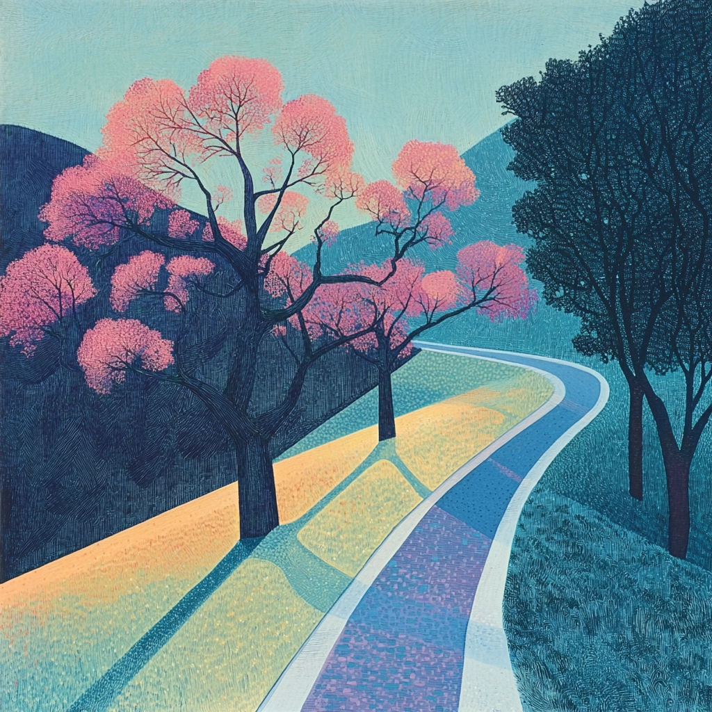 A harmonious blend of pastel hues and bold outlines creates a vivid landscape depiction.