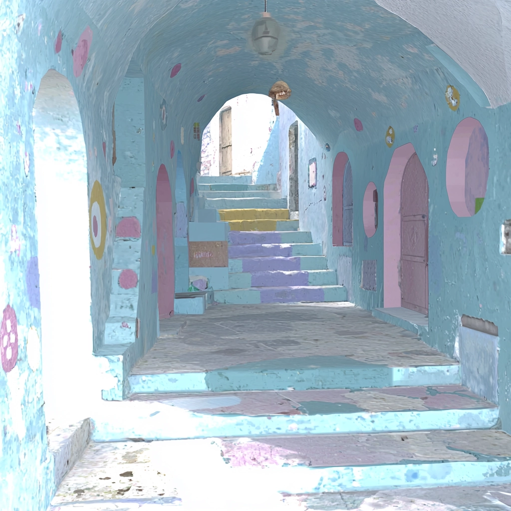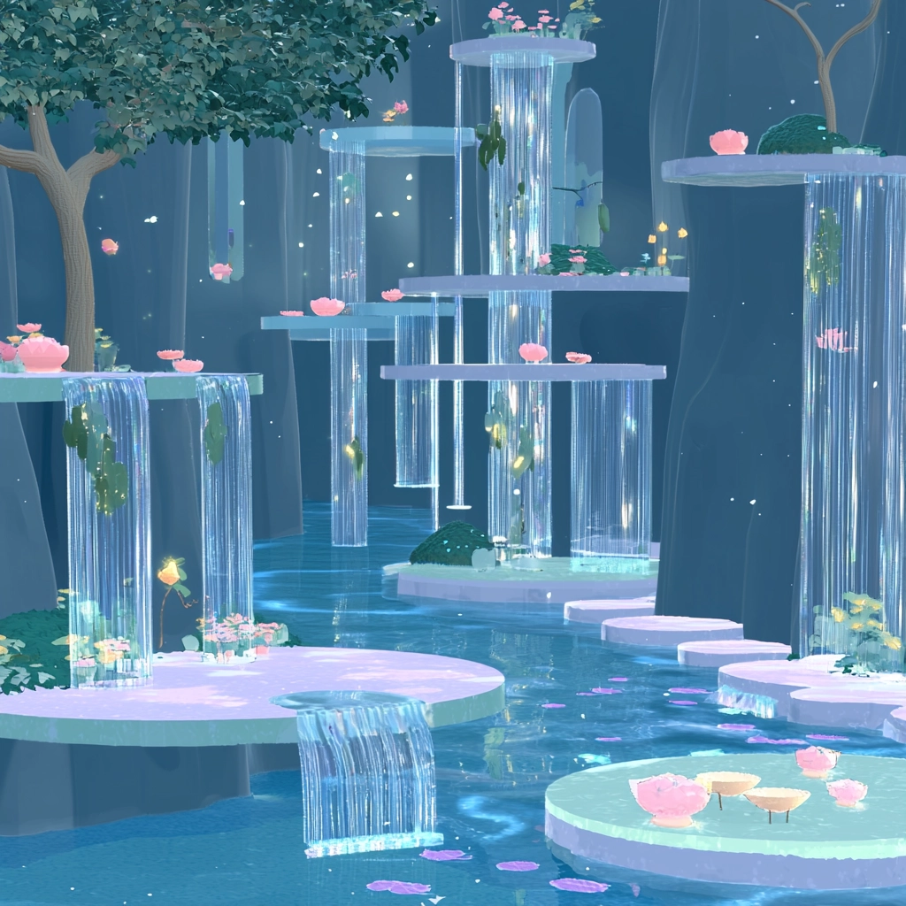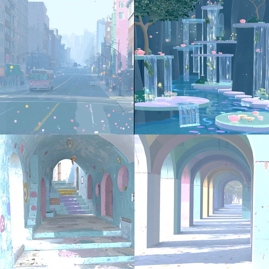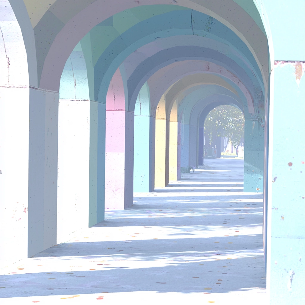Gentle lighting enhances soft textures and pastel hues, giving a weightless feeling. Subtle gradient transitions create depth, while reflected light on surfaces adds a sense of movement and fluidity. Shadows are minimal and diffuse.