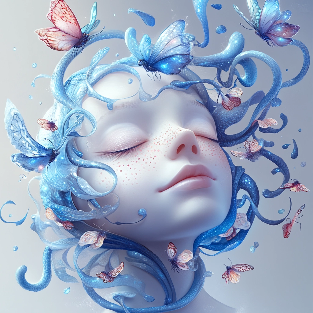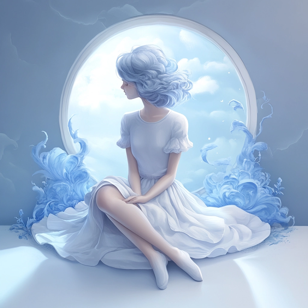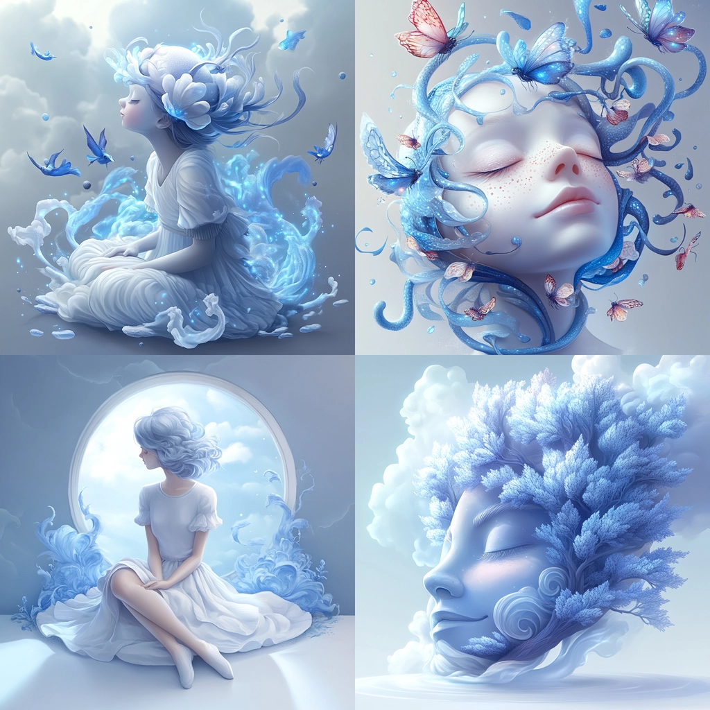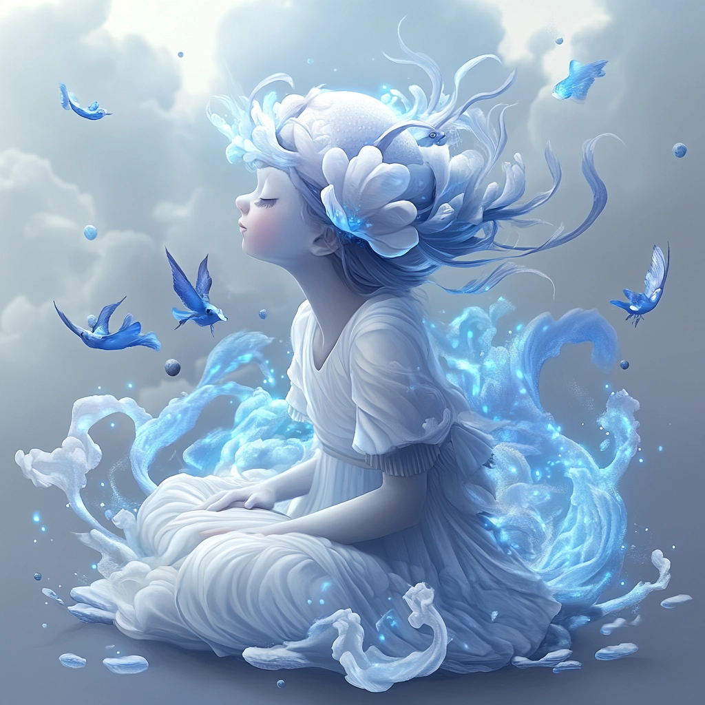 Soft lighting effects enhance the delicate color palette of blues, whites, and purples. The composition uses a gentle spatial arrangement and fluid textures to evoke a light and airy feel, highlighted by intricate detailing and smooth gradients.