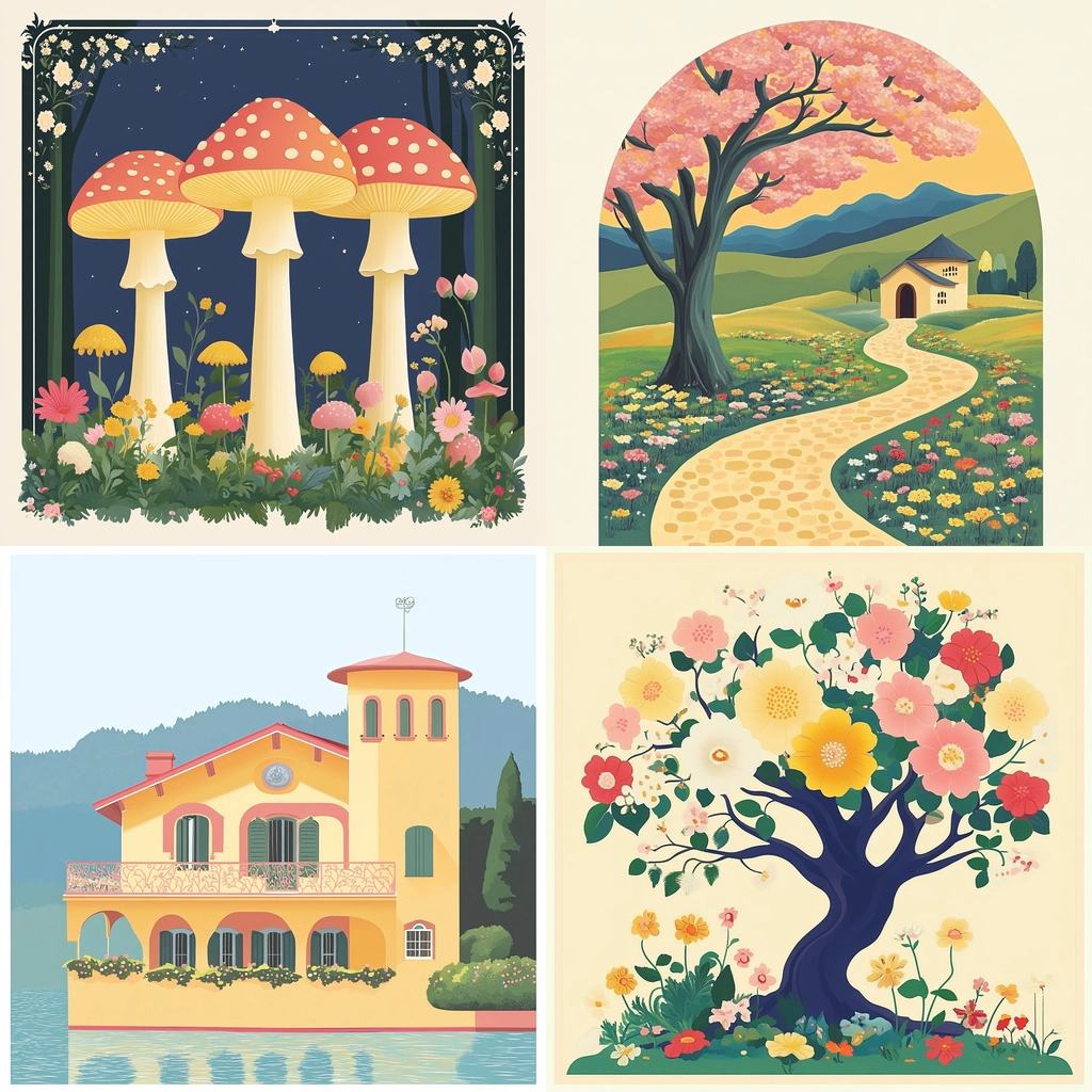 A vibrant use of pastel tones and playful compositions creates a lively harmony.