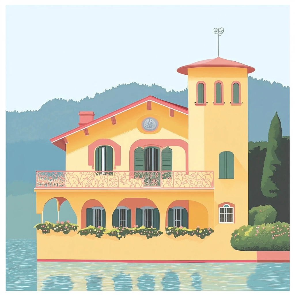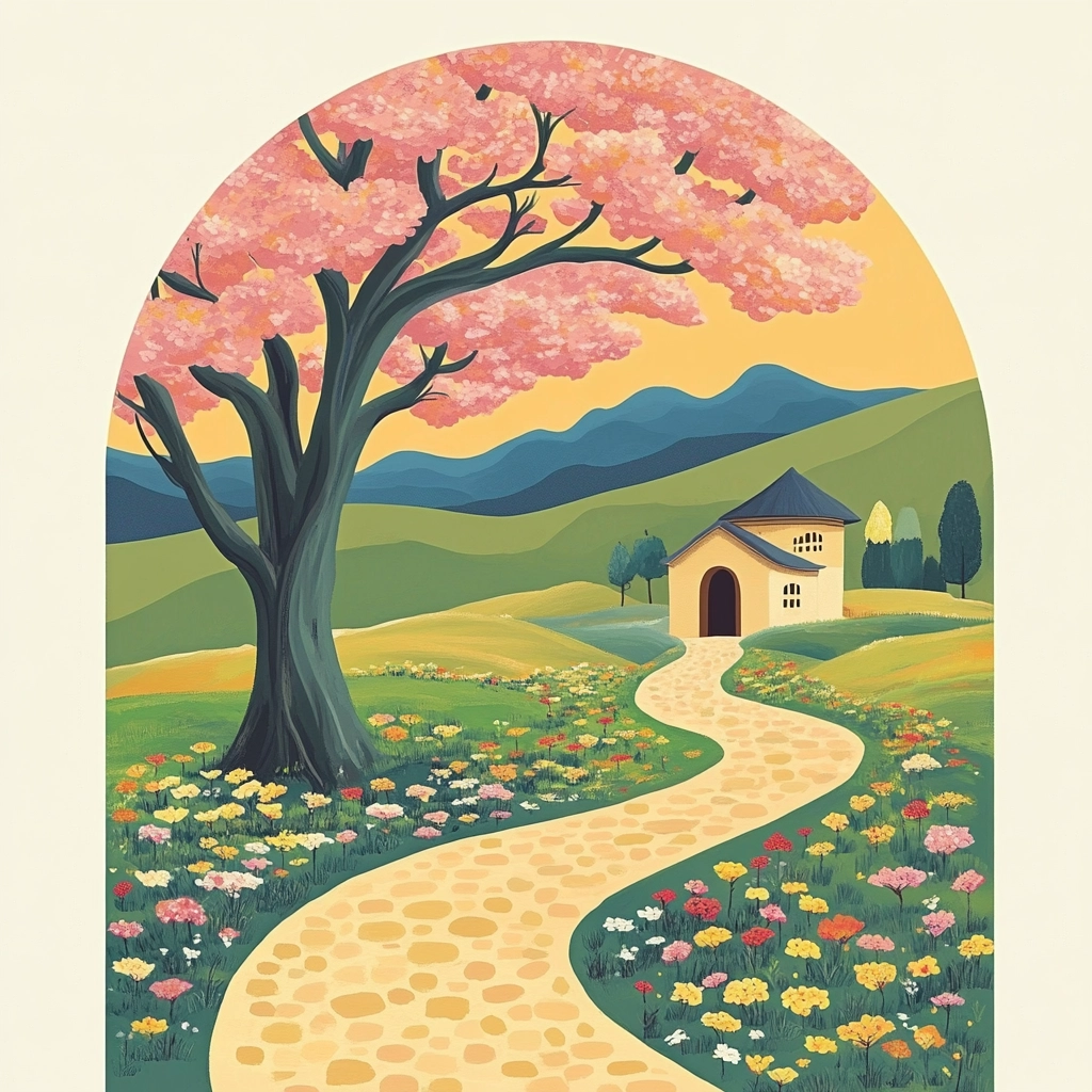 The lighting is softly diffused, enhancing the gentle pastel palette. The colors are bold yet harmonious, creating a balanced spatial arrangement. Texture is implied through flat, solid areas contrasted with intricate details.