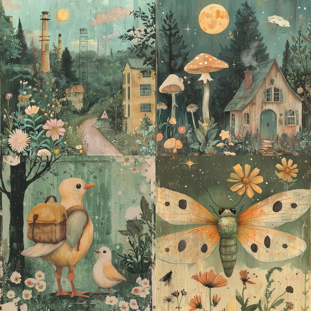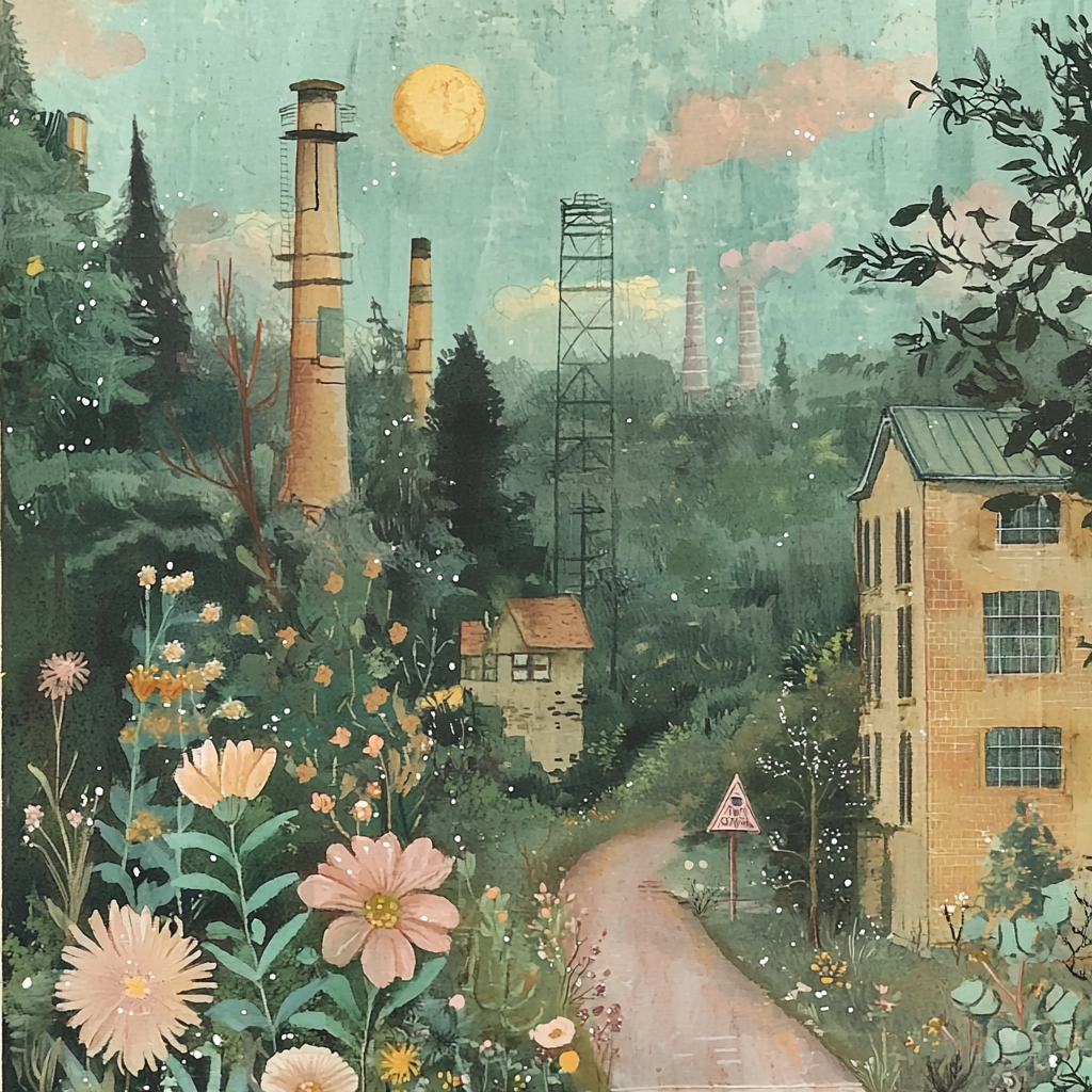 The use of soft hues blends nature and industrial motifs harmoniously.