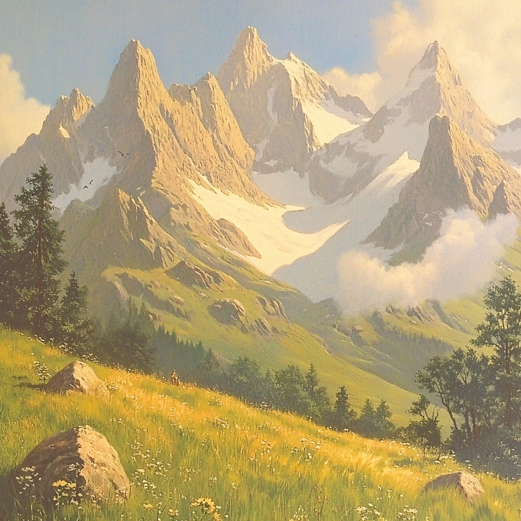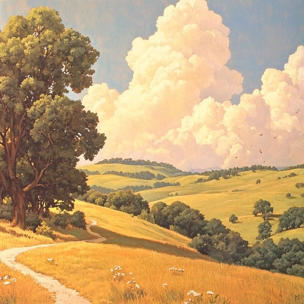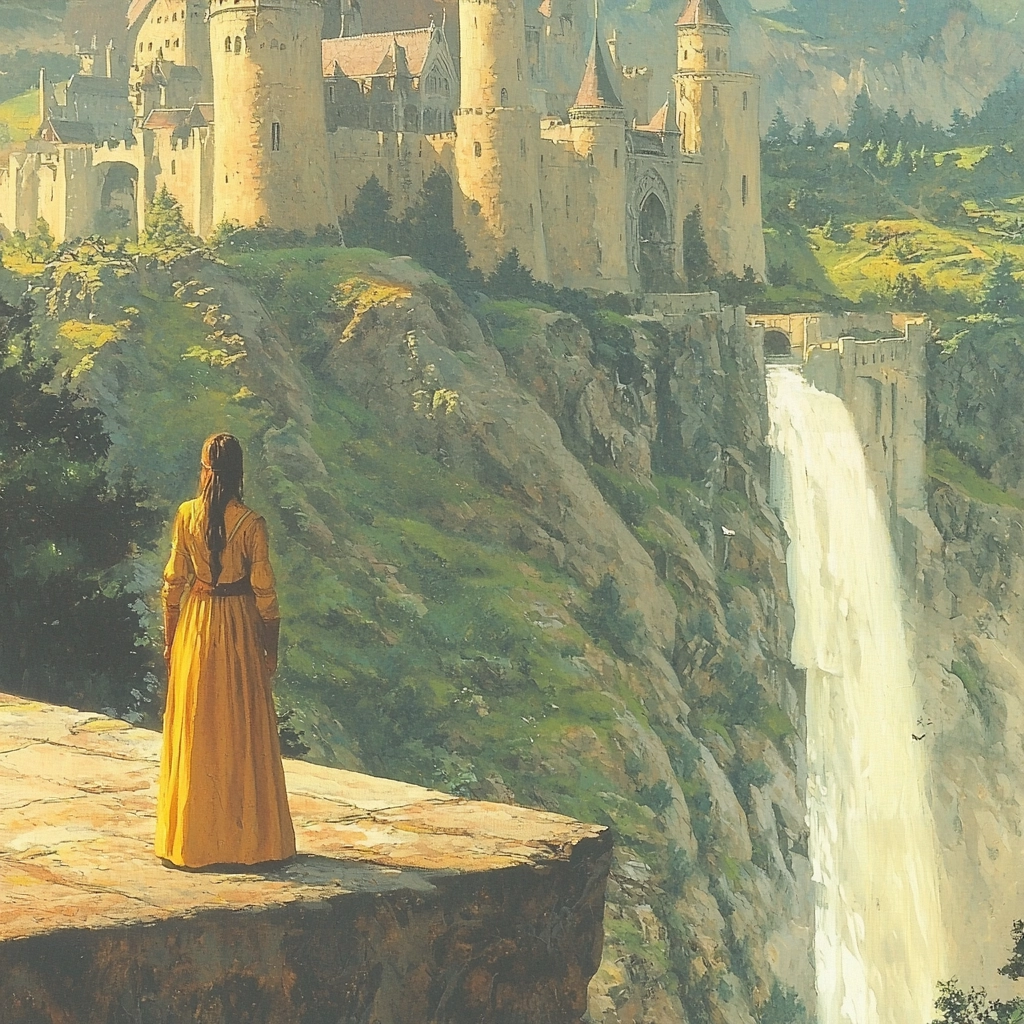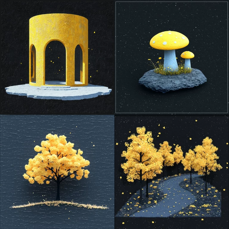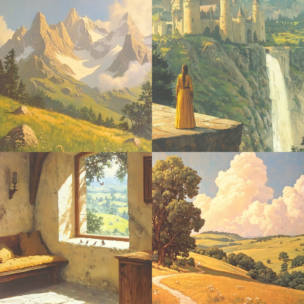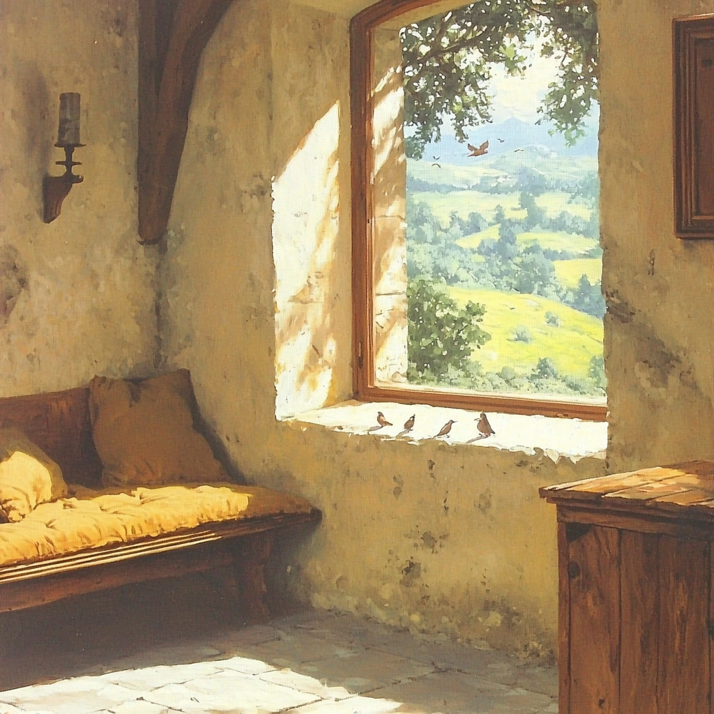The lighting produces sharp contrasts, enhancing the depth of the composition. The rich yellows and greens create a vibrant atmosphere, with a meticulous depiction of natural textures and intricate details that convey a realistic sense of space.