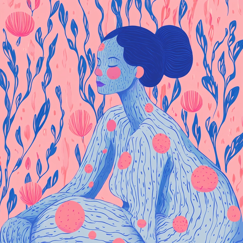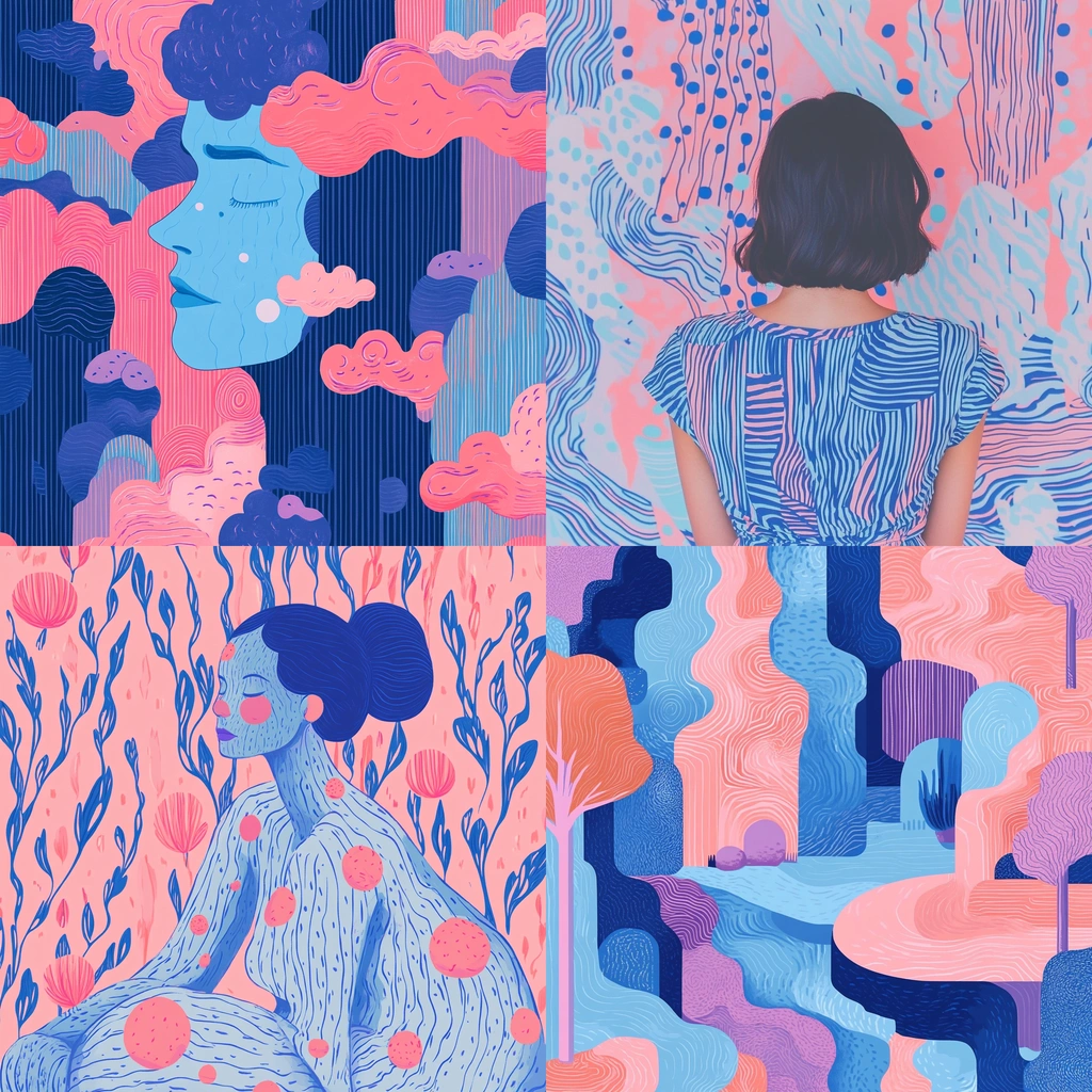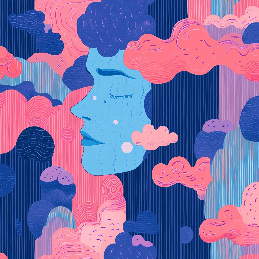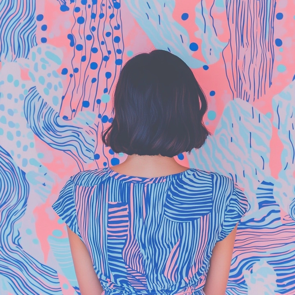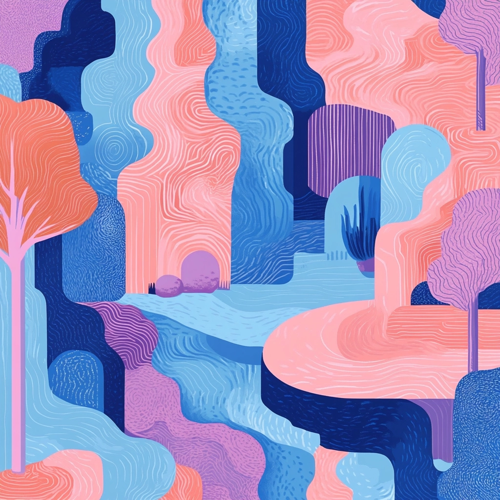 Vibrant pink and blue hues create whimsical geometric patterns.