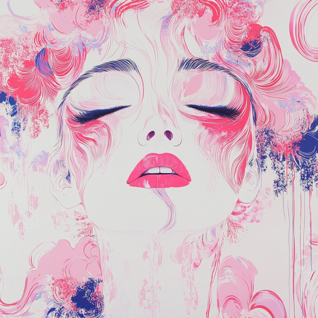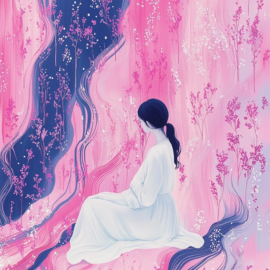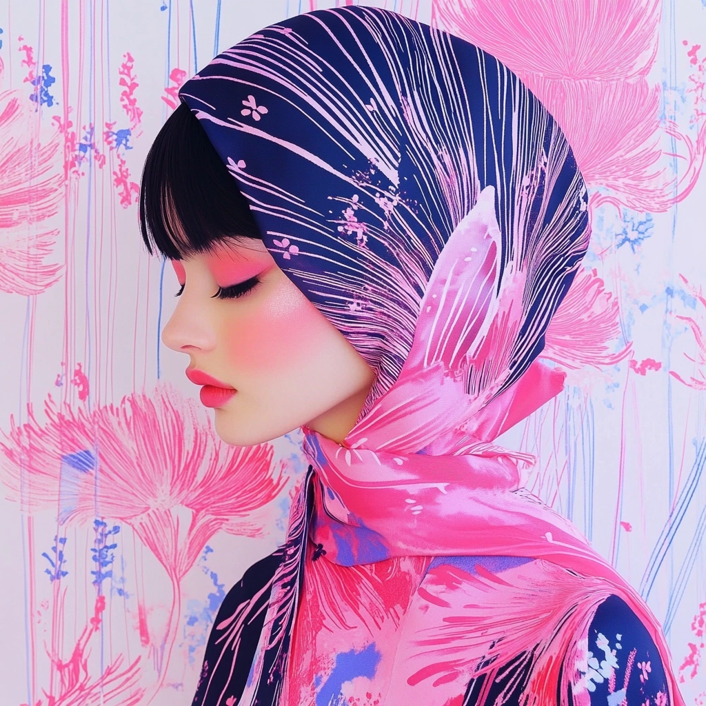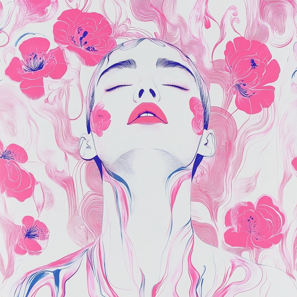 The use of pastel pinks and blues with delicate line work creates a fluid dynamic across the composition. Light is diffused softly across the elements, blending colors gracefully. Textures exhibit a smooth silk-like quality, emphasizing flowing patterns and organic shapes.