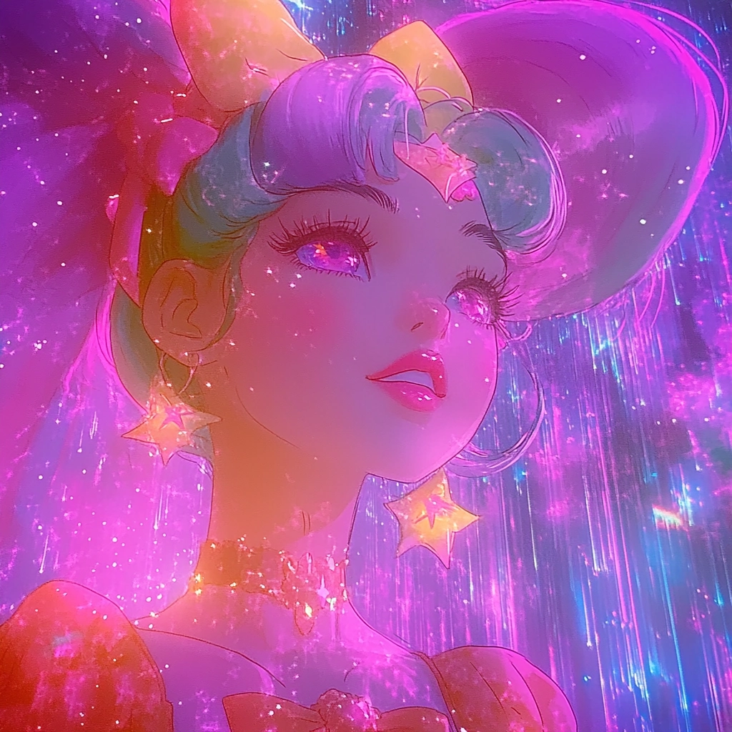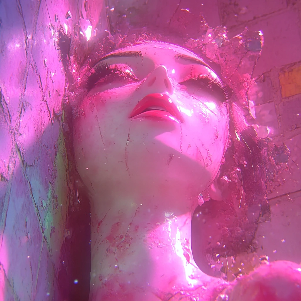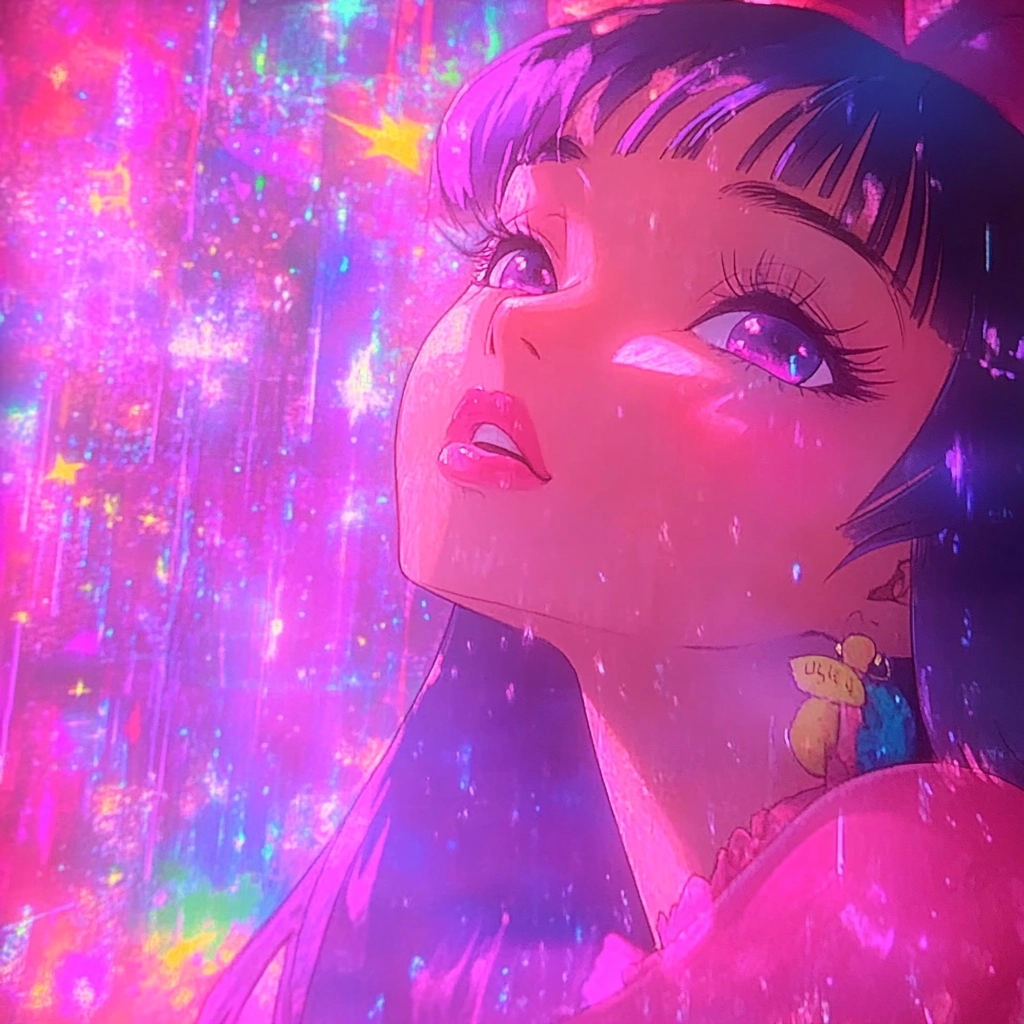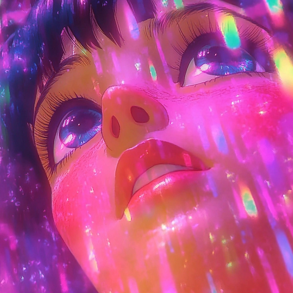 Strong fluorescent lighting creates an intense glow effect, accentuating the bright, saturated colors. The sense of depth is emphasized by layered textures that interact with lighting, creating a visually captivating interplay between background and foreground.