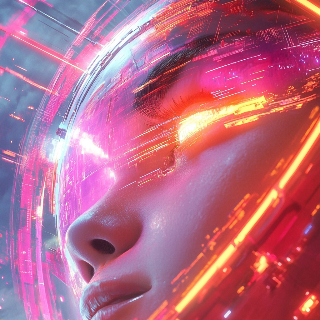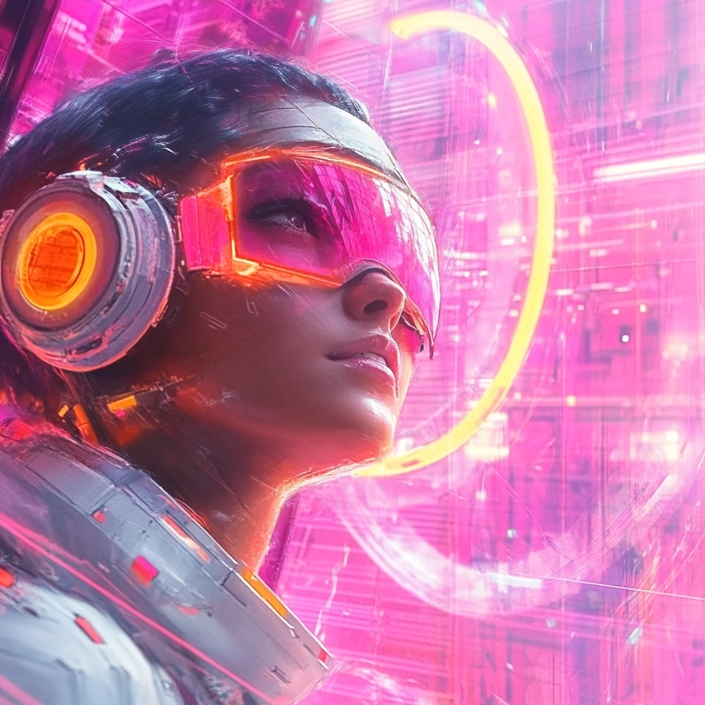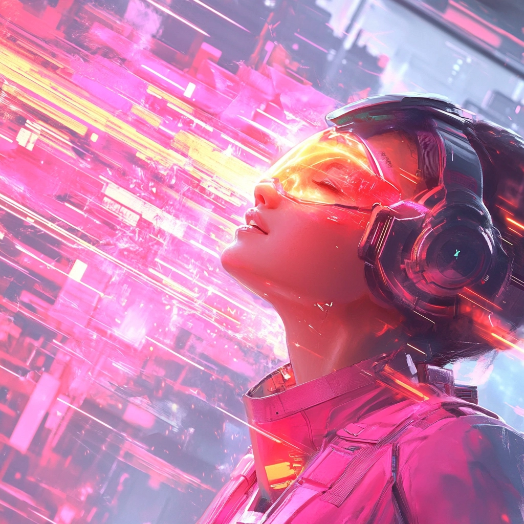 Fluorescent pinks create sharp contrasts against cooler silver tones, enhanced by intricate lighting effects that elicit a futuristic sense of depth. The gleaming surfaces emphasize texture with vibrant reflections, offering an advanced spatial illusion.