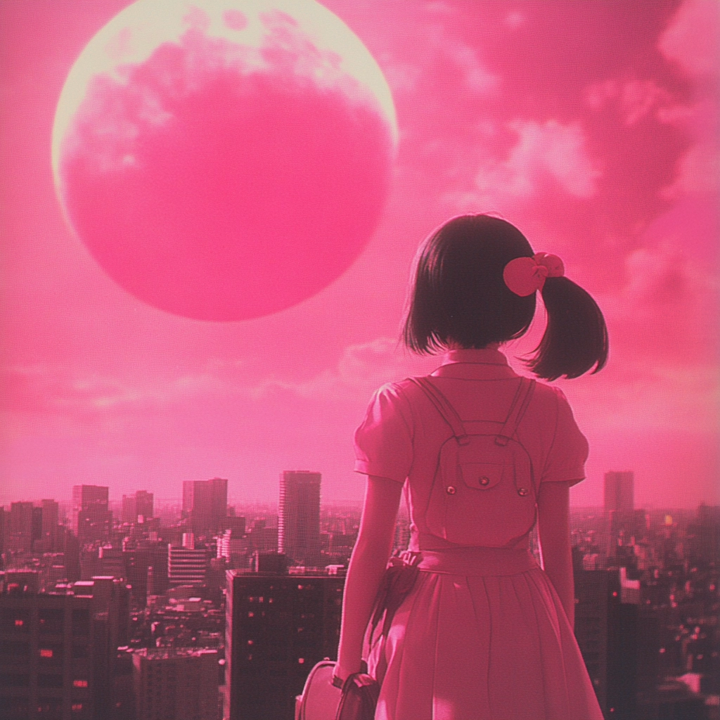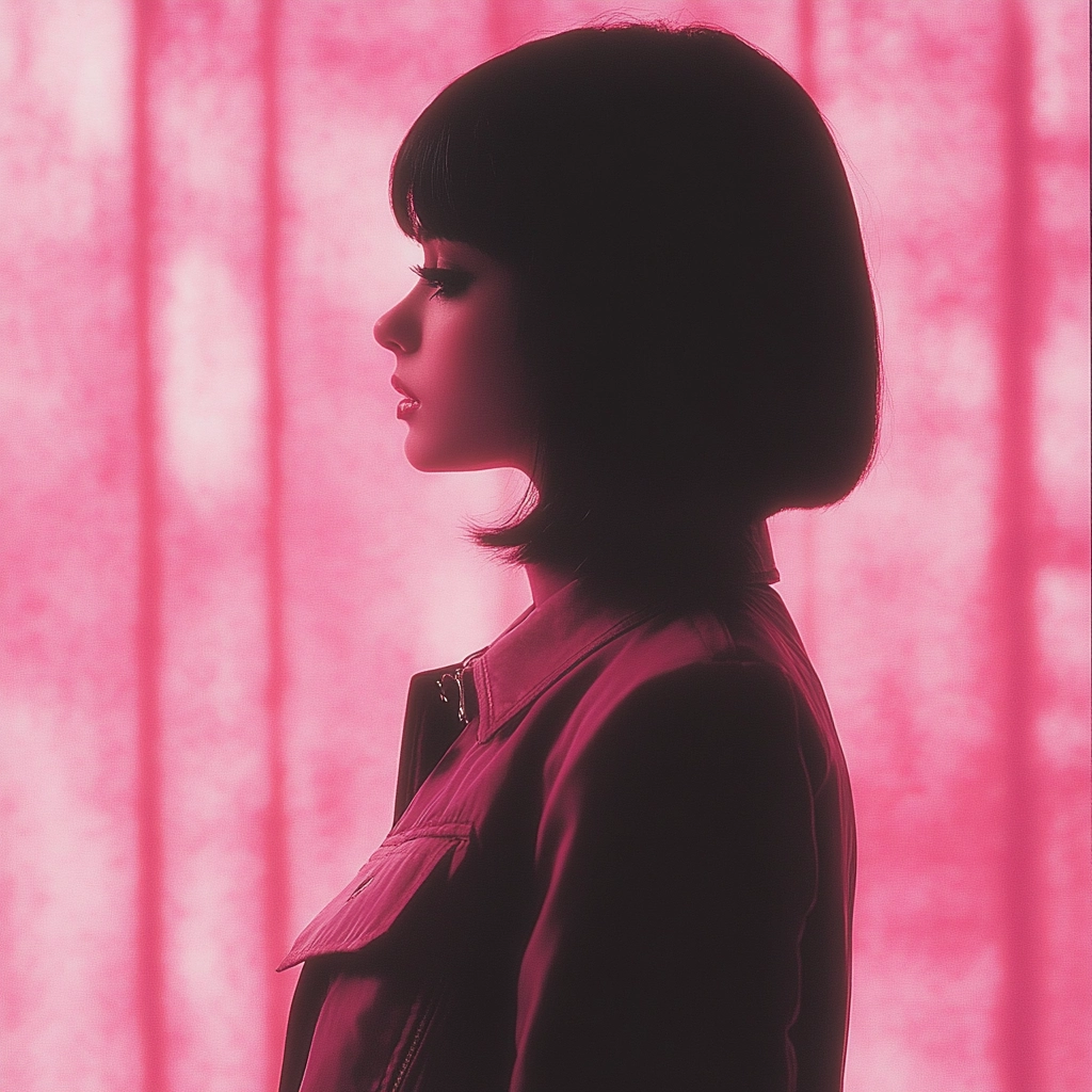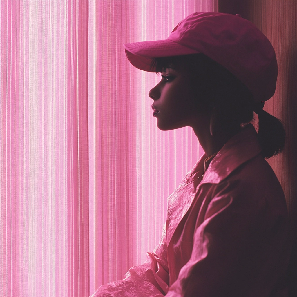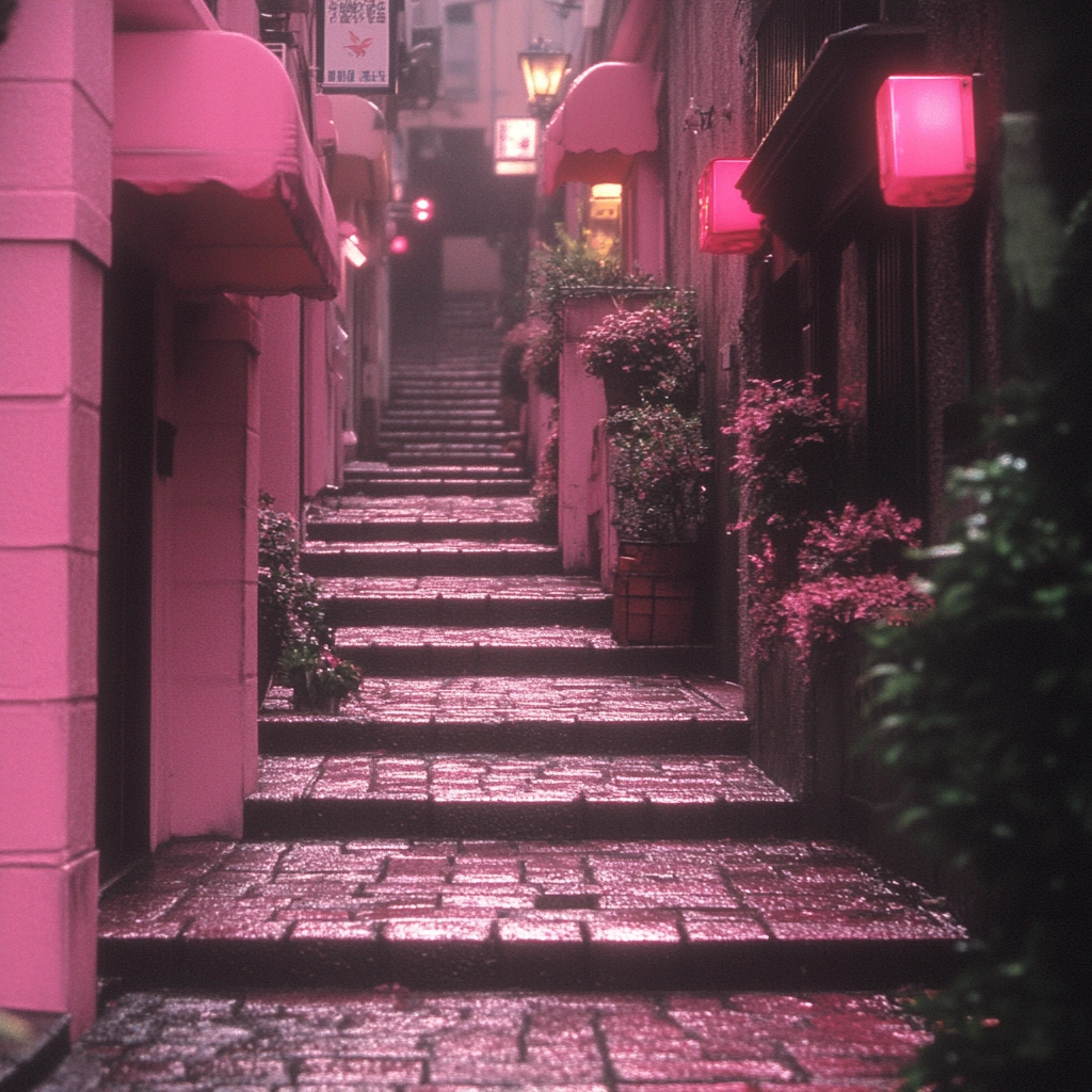 Strong neon lighting creates a contrasting and immersive feel, saturating the scene with vibrant pink hues. The cityscapes are detailed with subtle textures and shadow play, offering depth. The high saturation lends a modern, atmospheric quality to the environment.