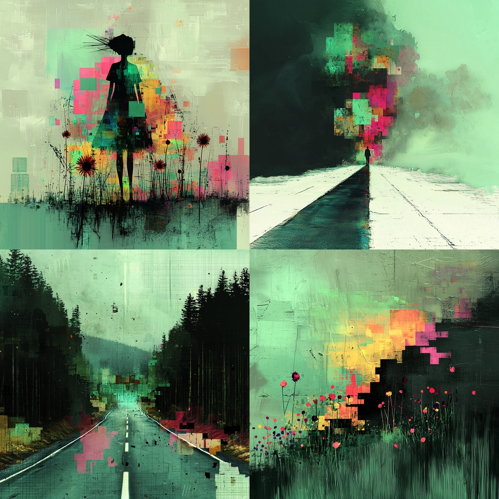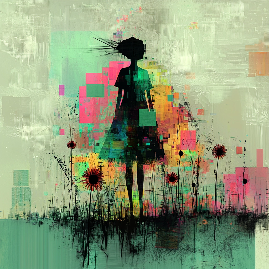 The use of lighting effects generates depth while highlighting key areas, and the interplay of bright green and contrasting dark shades adds dramatic impact. Texture comes through as rough, stylized brushstrokes and pixelated overlays, producing dynamic compositional elements.