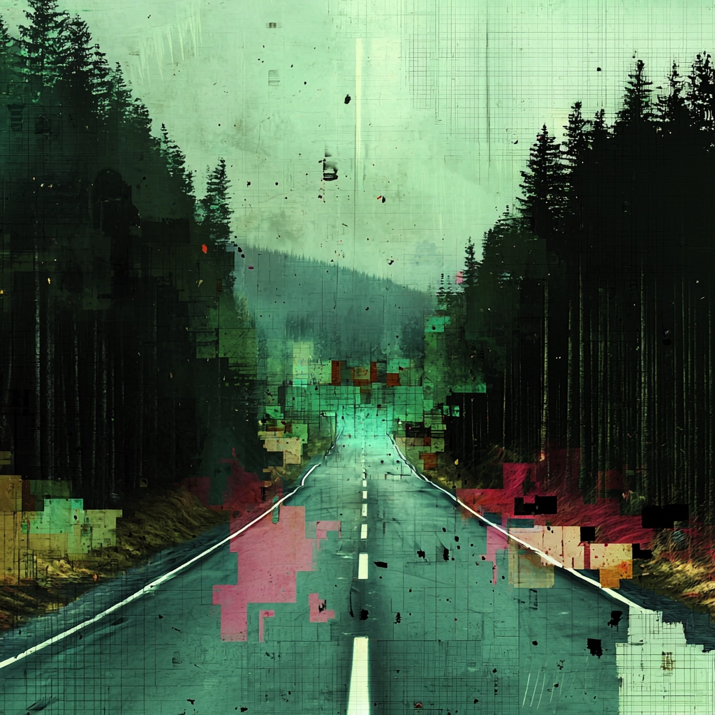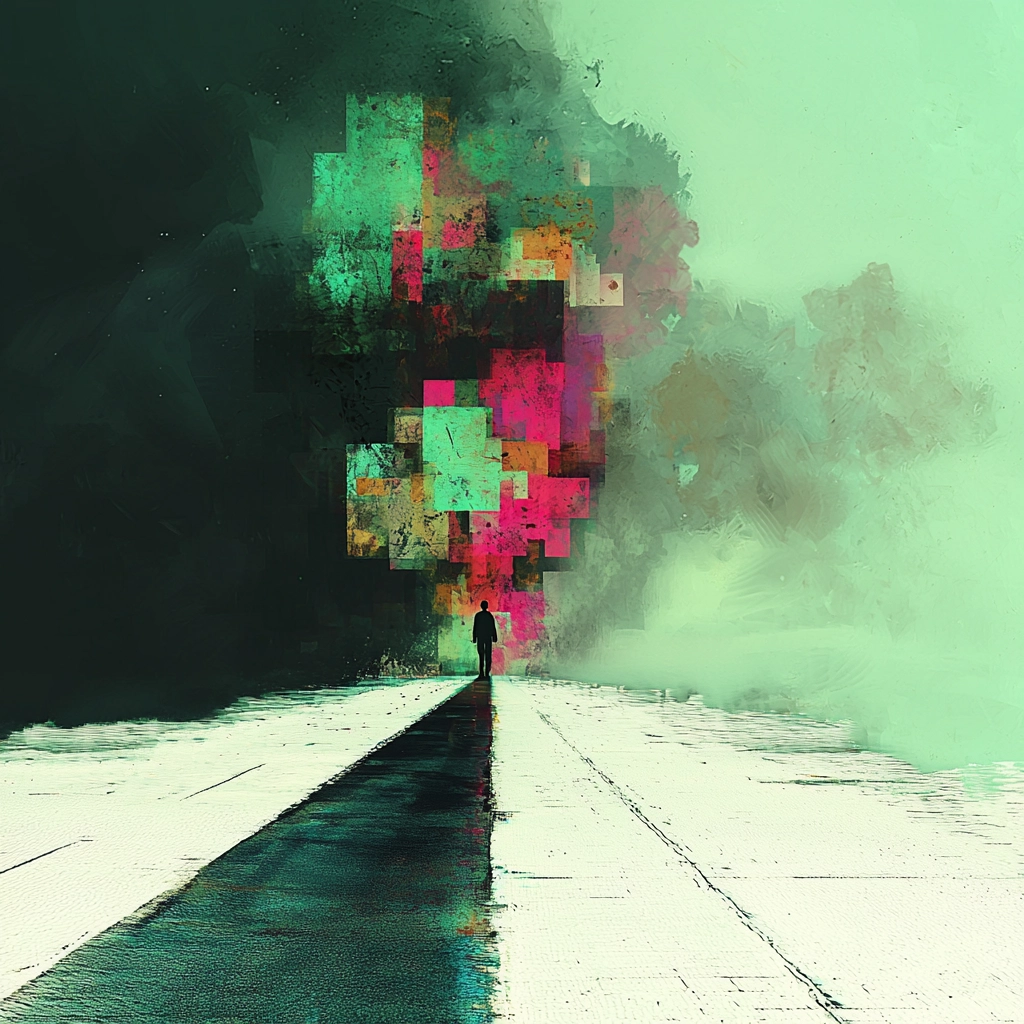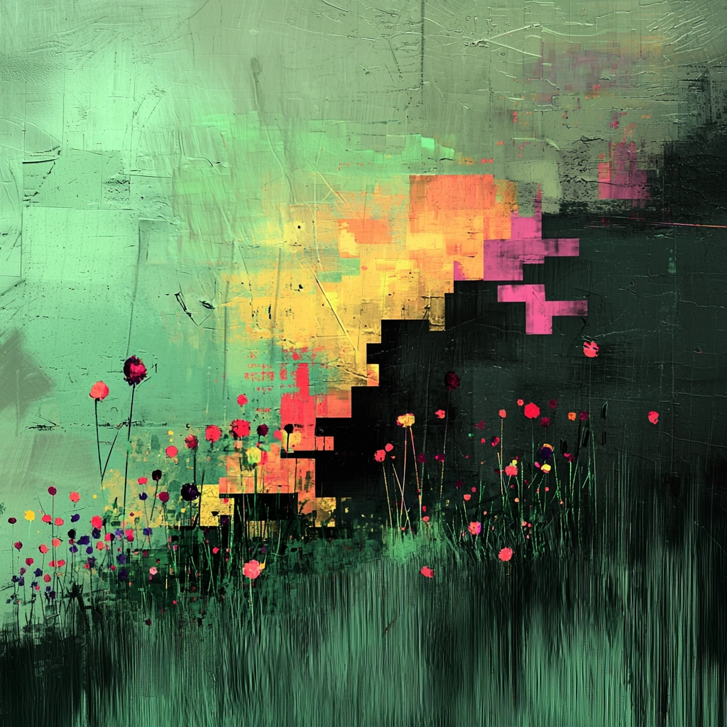 Bright green tones disrupted by pixel-like blocks create a fragmented landscape.