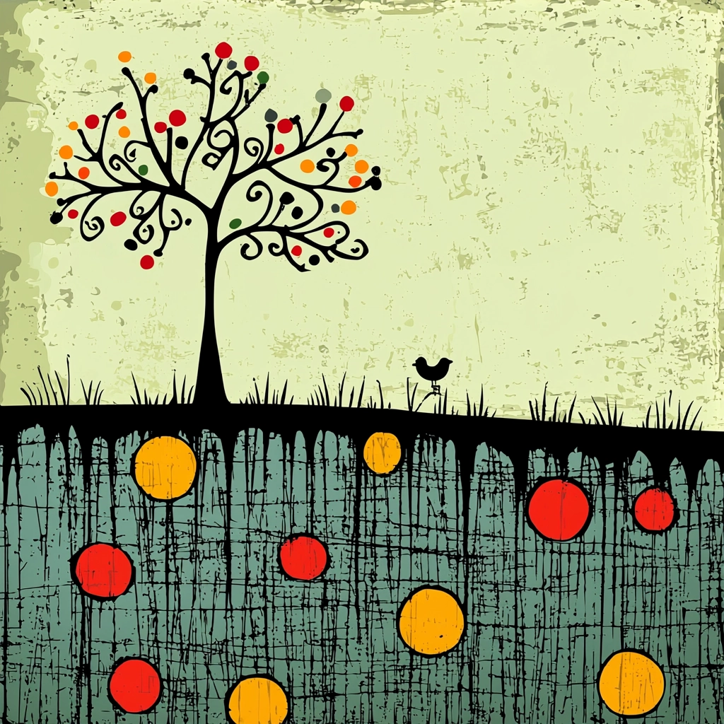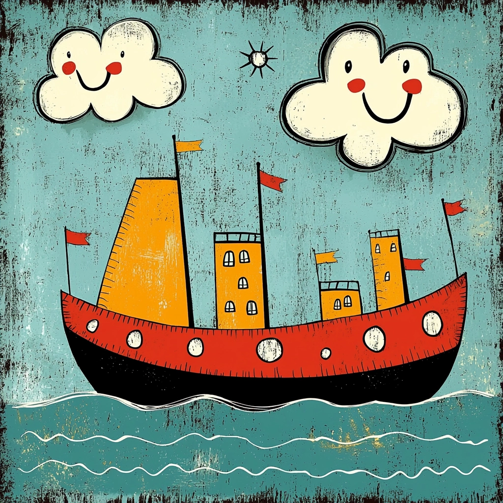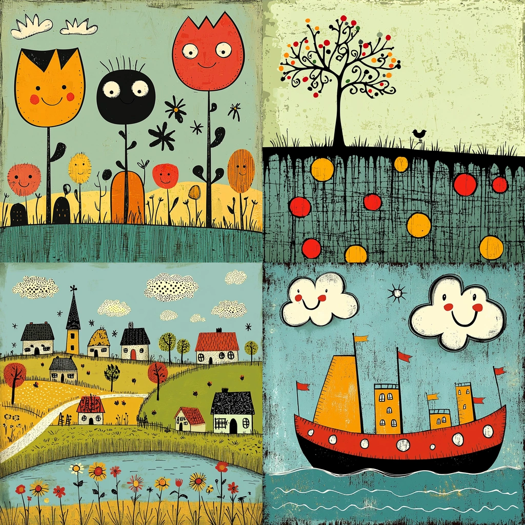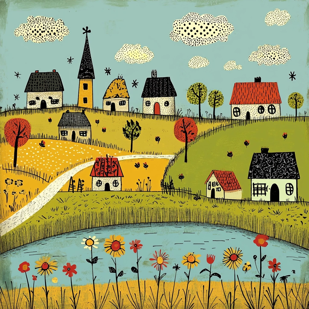 Bold, vibrant palettes and simplified forms create a whimsical and playful scene, emphasizing lively storytelling through strong contrasts and vivid tones.