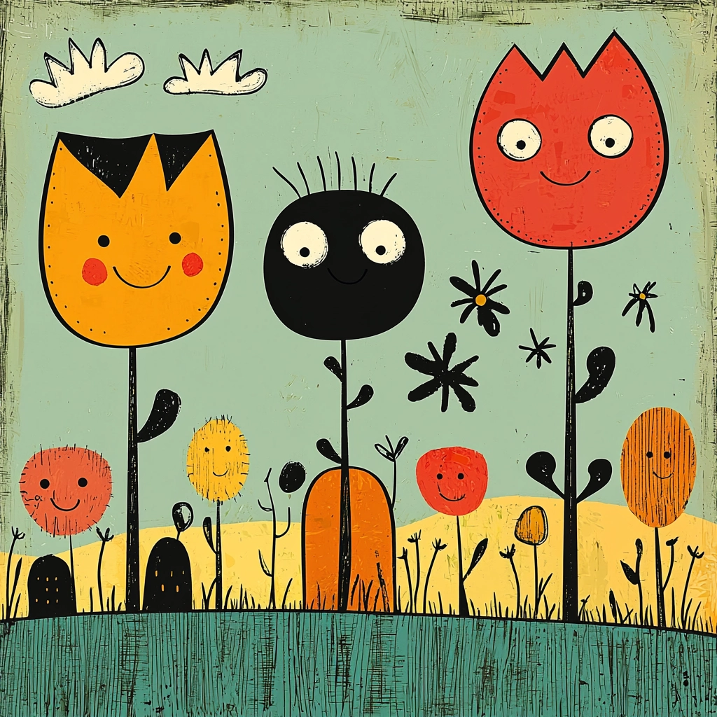 The use of bold colors brings out a cheerful vibrancy, with strong contrast created through the interplay of bright yellows, reds, and contrasting dark outlines. A flat spatial quality gives a sense of naive simplicity, with playful linework adding texture and whimsy.