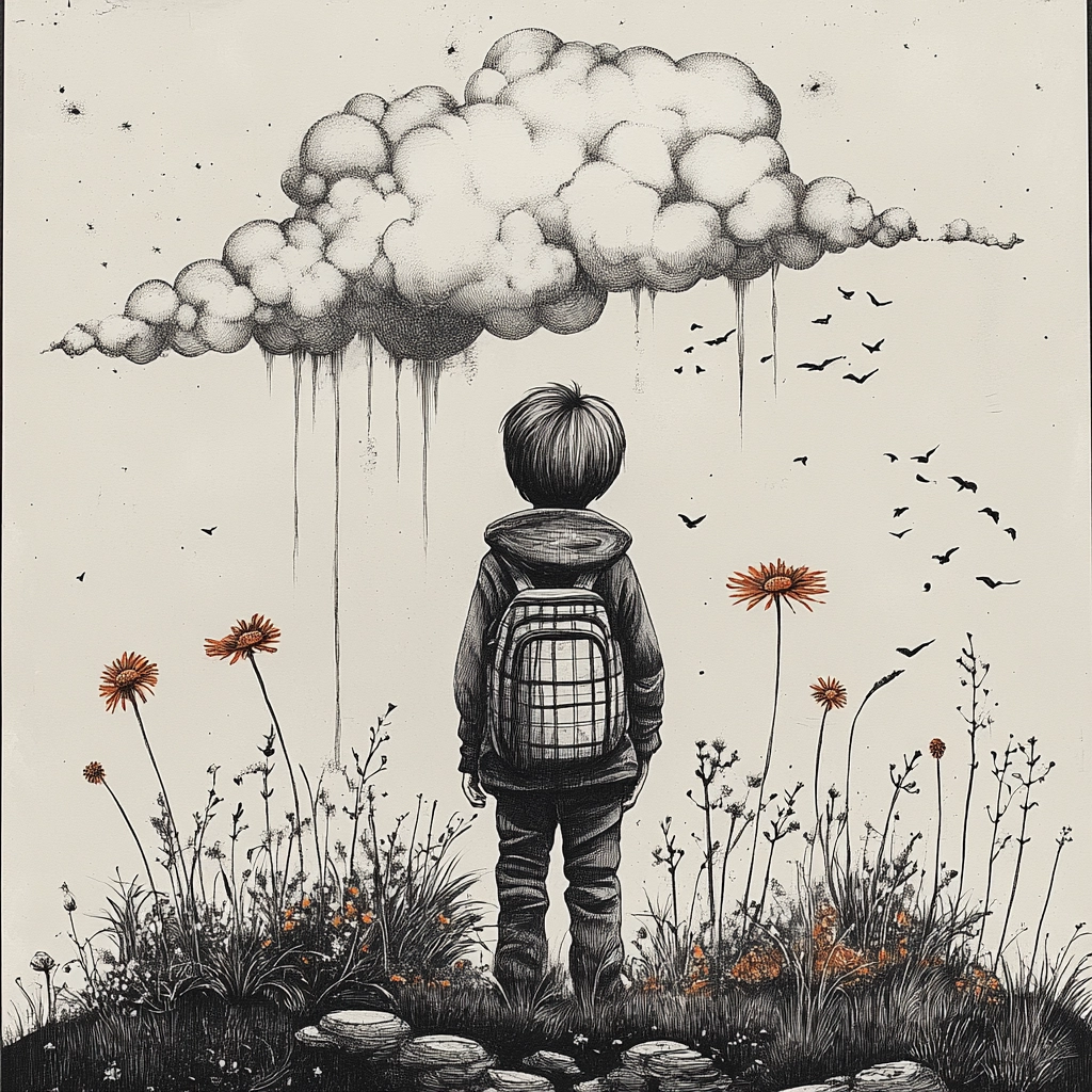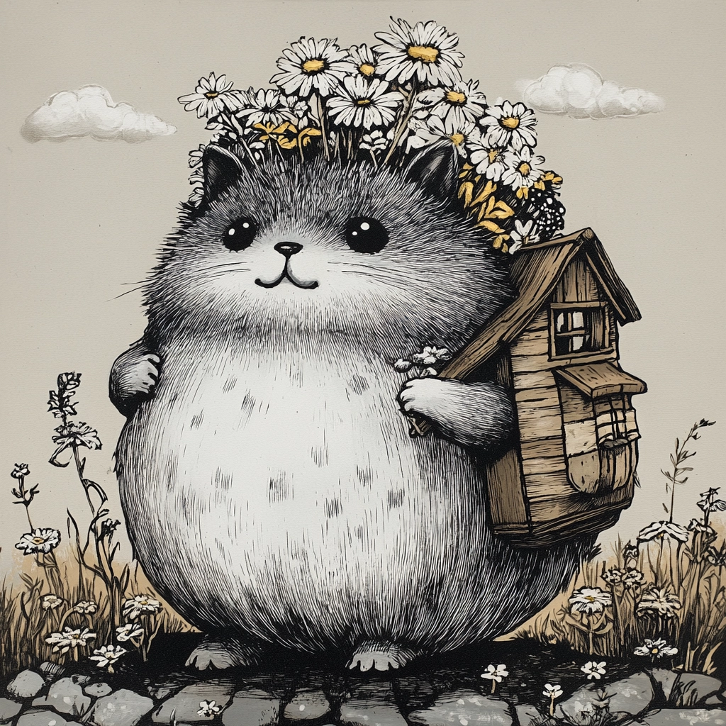 The composition features playful contrasts in black and white with beige highlights, creating a detailed illustrative effect.