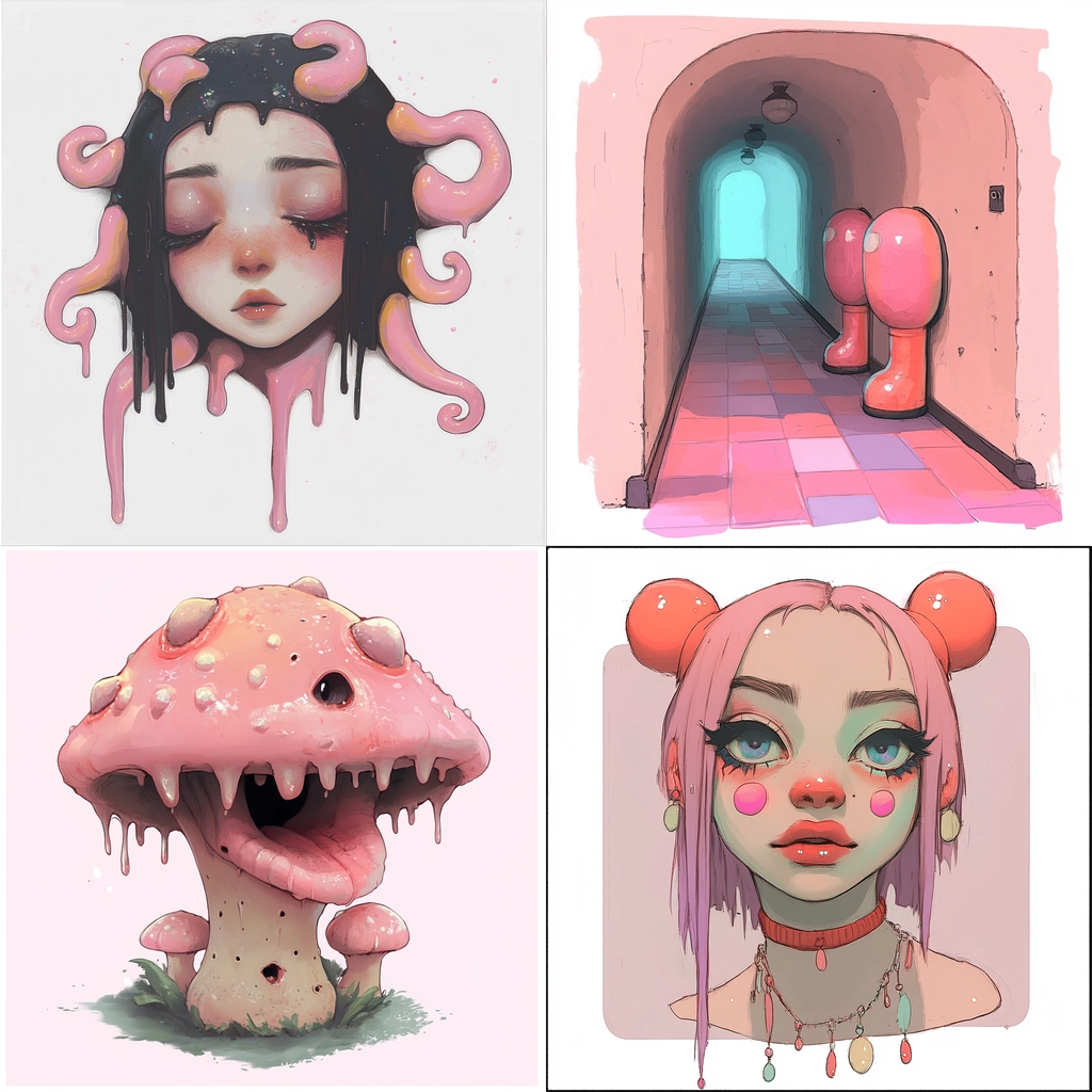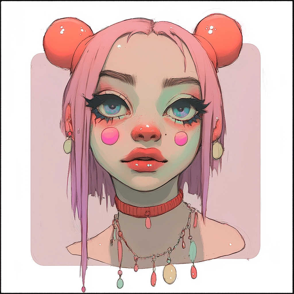 This style combines soft pastel tones with playful and bold contrasts creating a quirky yet harmonious visual effect.