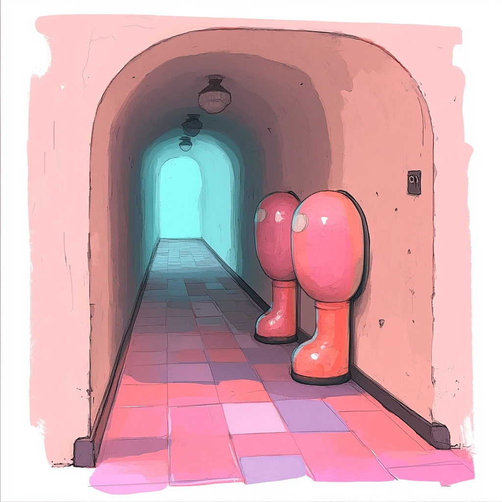 Lighting effects emphasize smooth surfaces and glossy textures, enhancing the soft pastel color palette. The use of space creates depth through perspective, while textures are subtly applied to highlight detailed elements and smooth transitions.