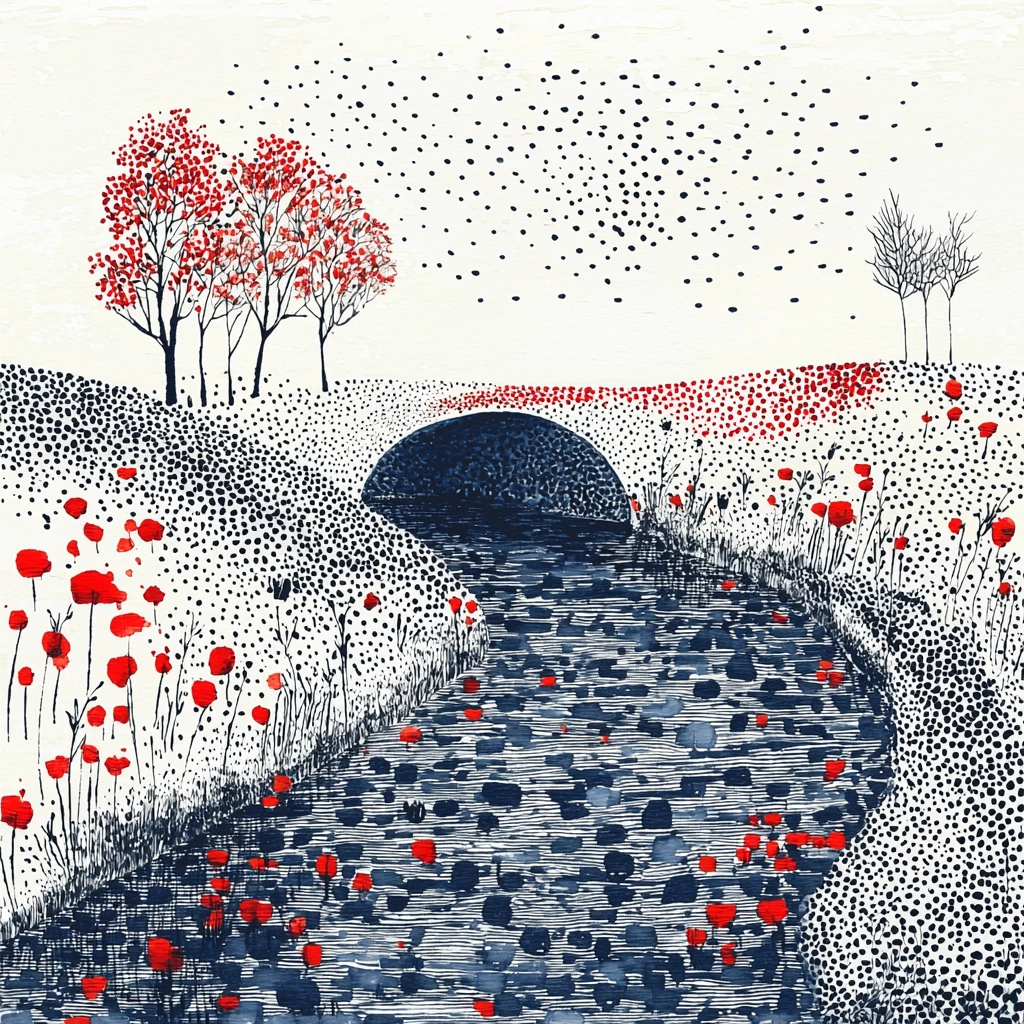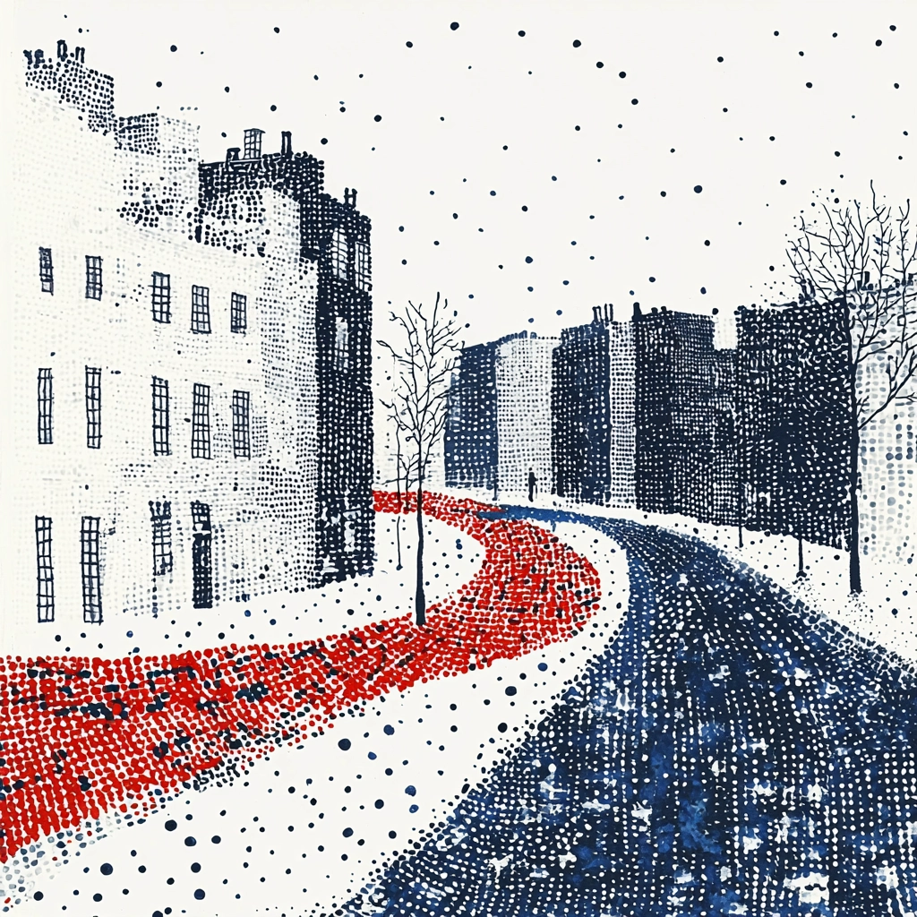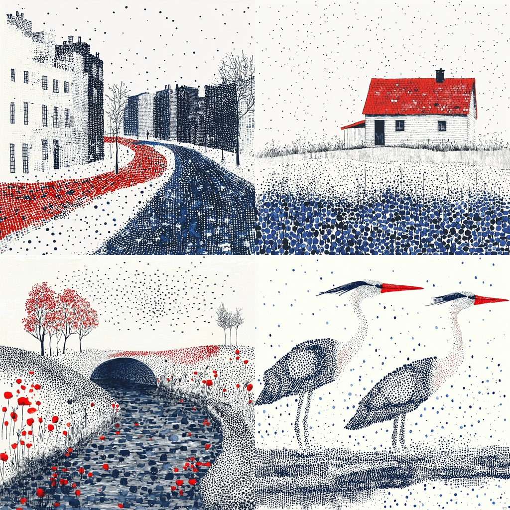 The composition blends urban and natural scenes with a focus on contrasting colors and dotted detailing.