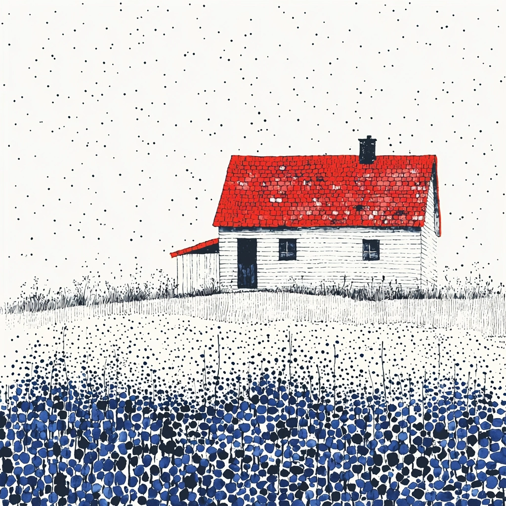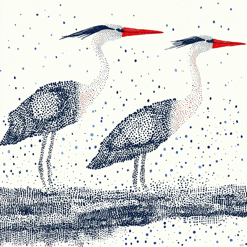 The use of vibrant red and deep blue against a white backdrop results in striking visual contrasts, with intricate dot patterns creating a texture that adds depth. The spatial arrangement balances openness with structured elements, enhanced by the precise dot application.