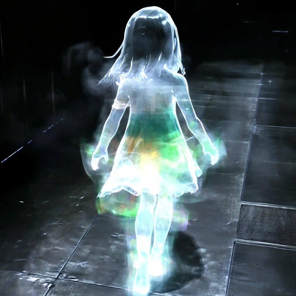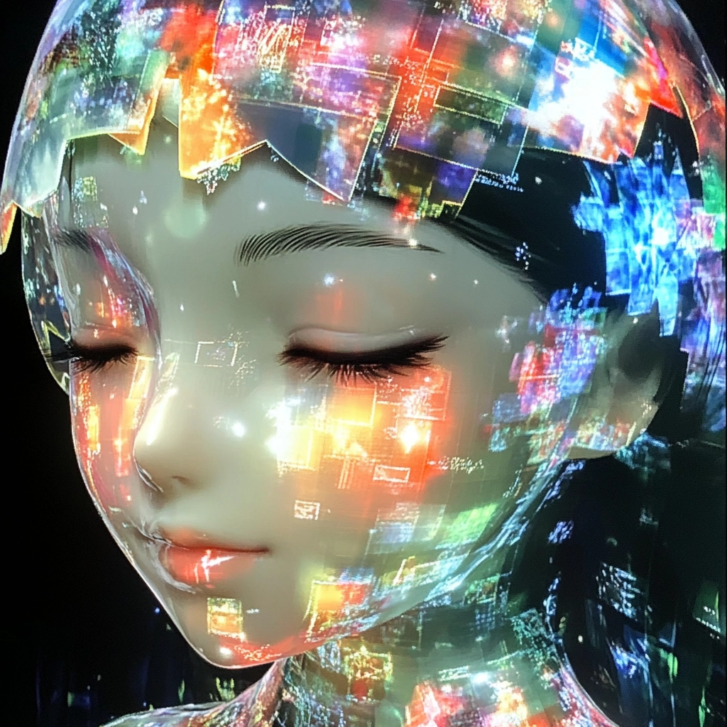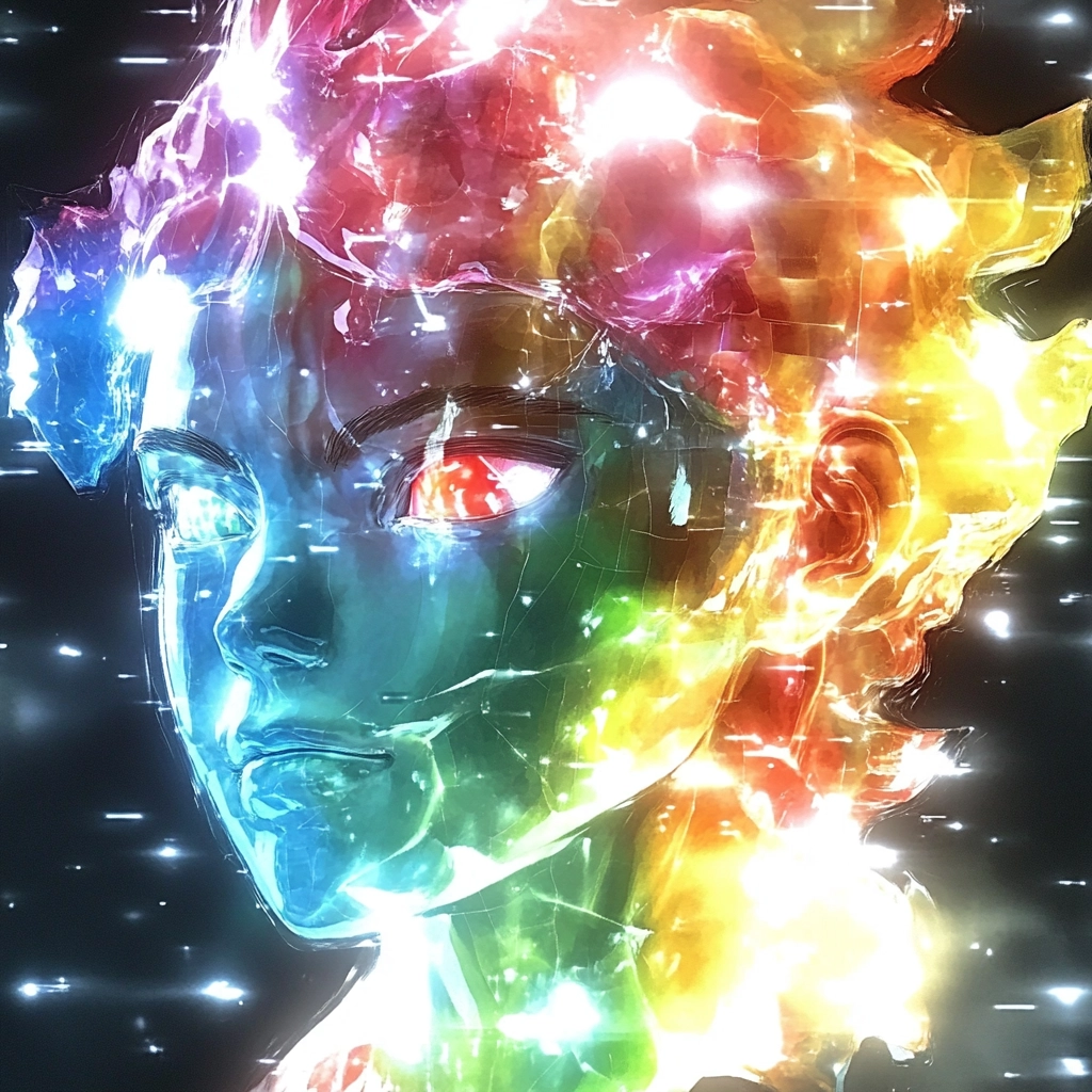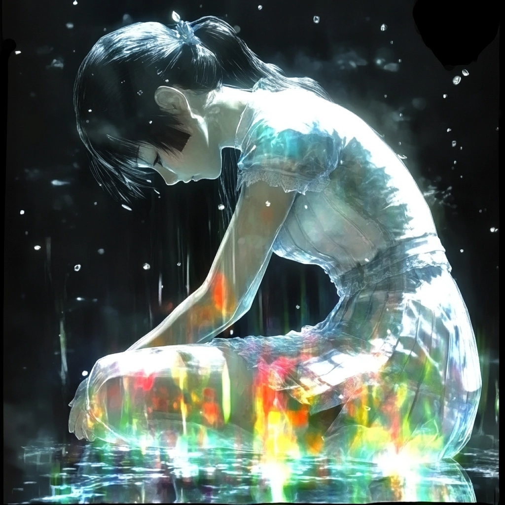 The interplay of high-contrast lighting highlights color transitions, creating an otherworldly palette that shimmers against a dark backdrop, presenting an ethereal glow and reflective textures that suggest fluidity and depth.