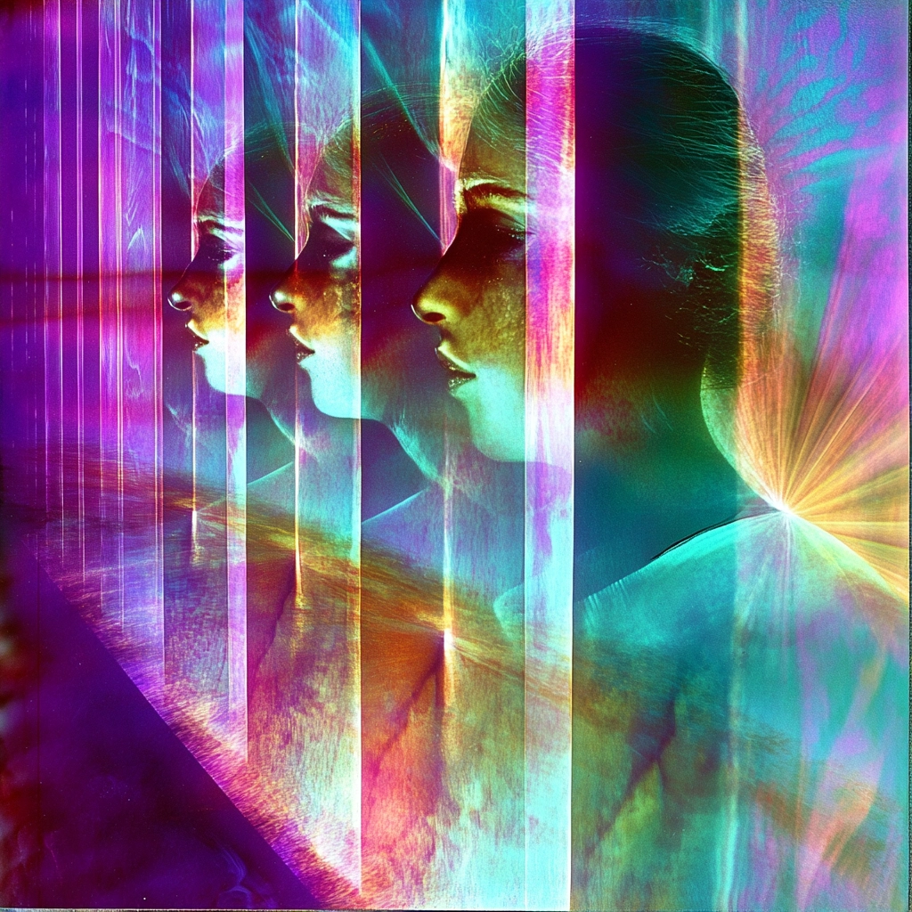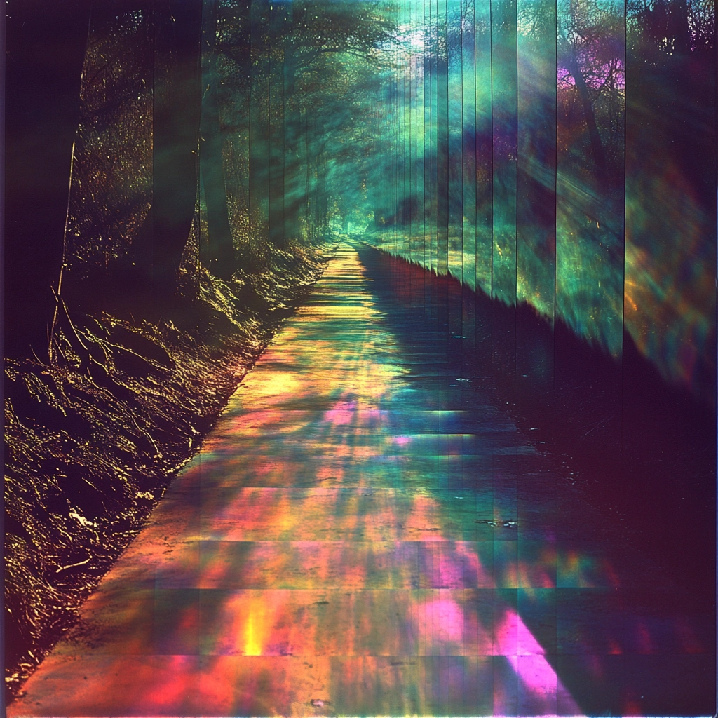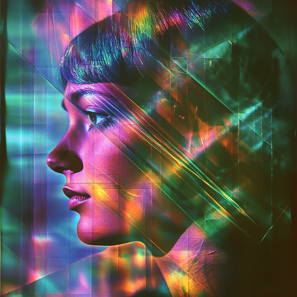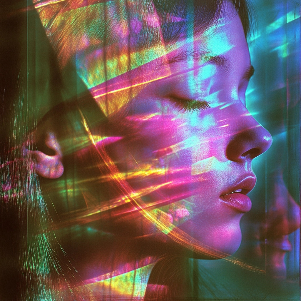 Brilliant lighting cast through prism effects creates dynamic color shifts and reflections, establishing a deep sense of space with layers of light enhancing depth and movement.