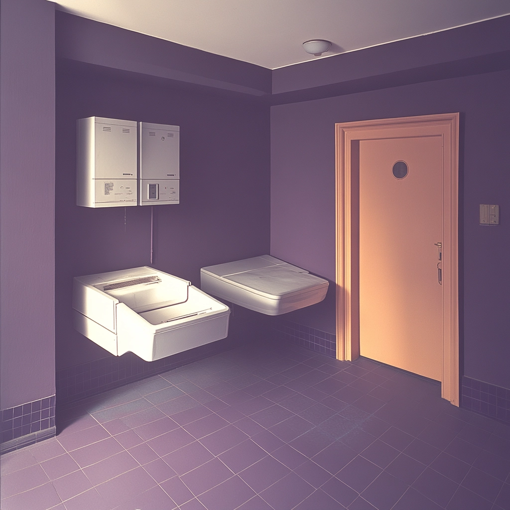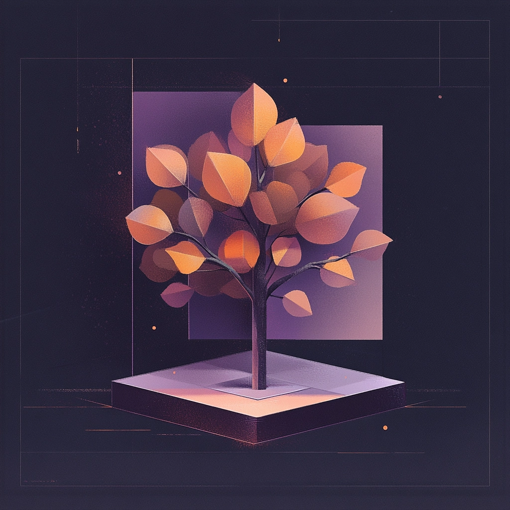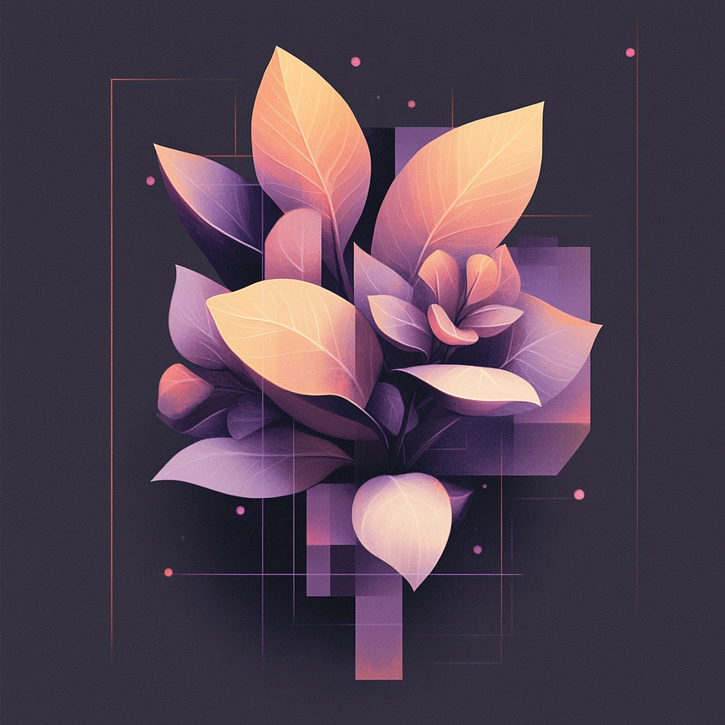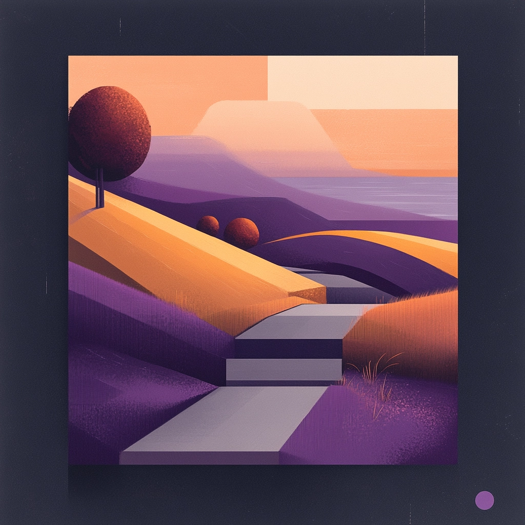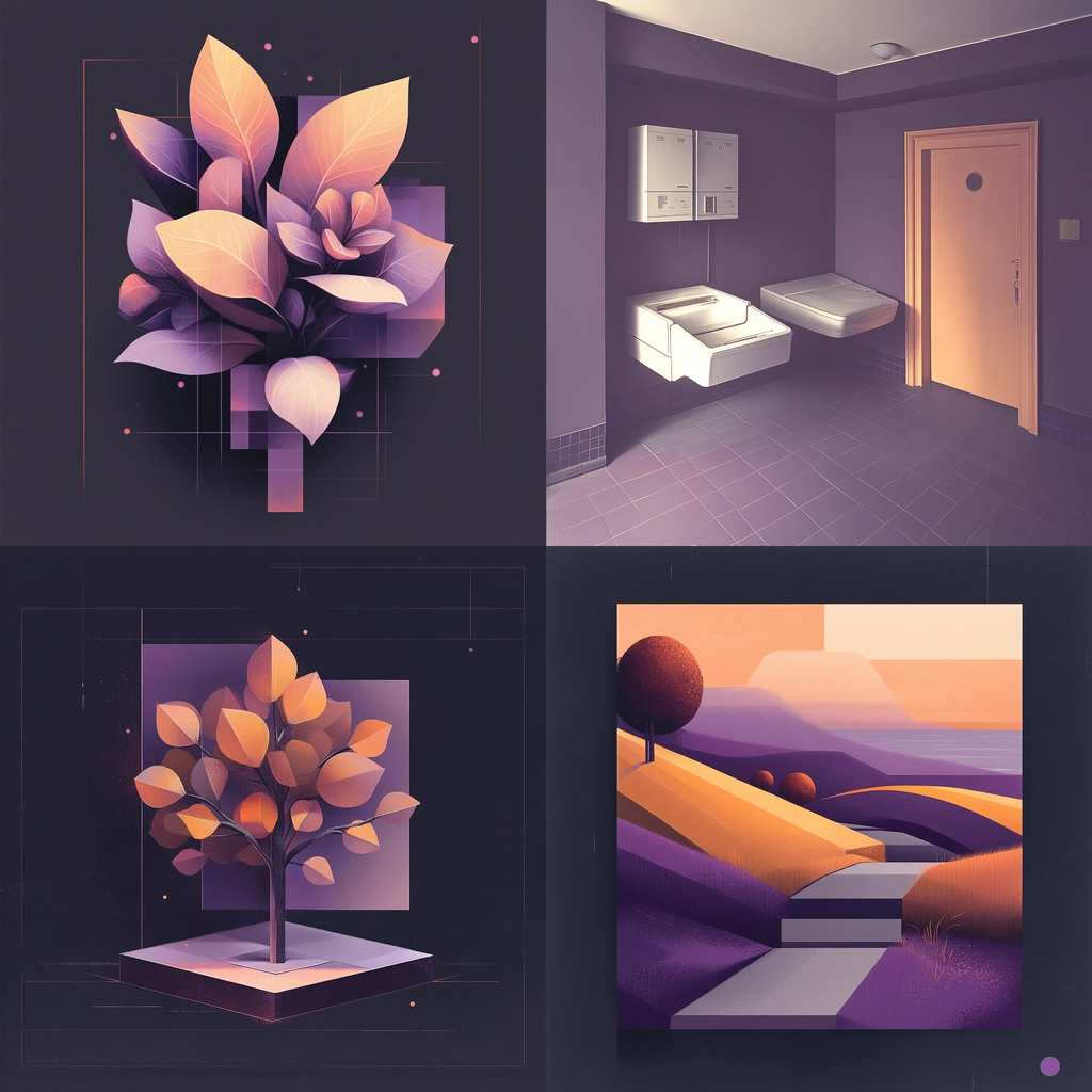 The visual presentation is marked by controlled lighting effects that emphasize a purple palette softened by gradient infusions of orange and beige. A sense of structured spatial arrangement is achieved through the use of geometric shapes and subtle, smooth textures.