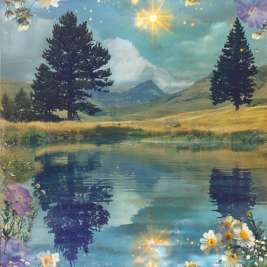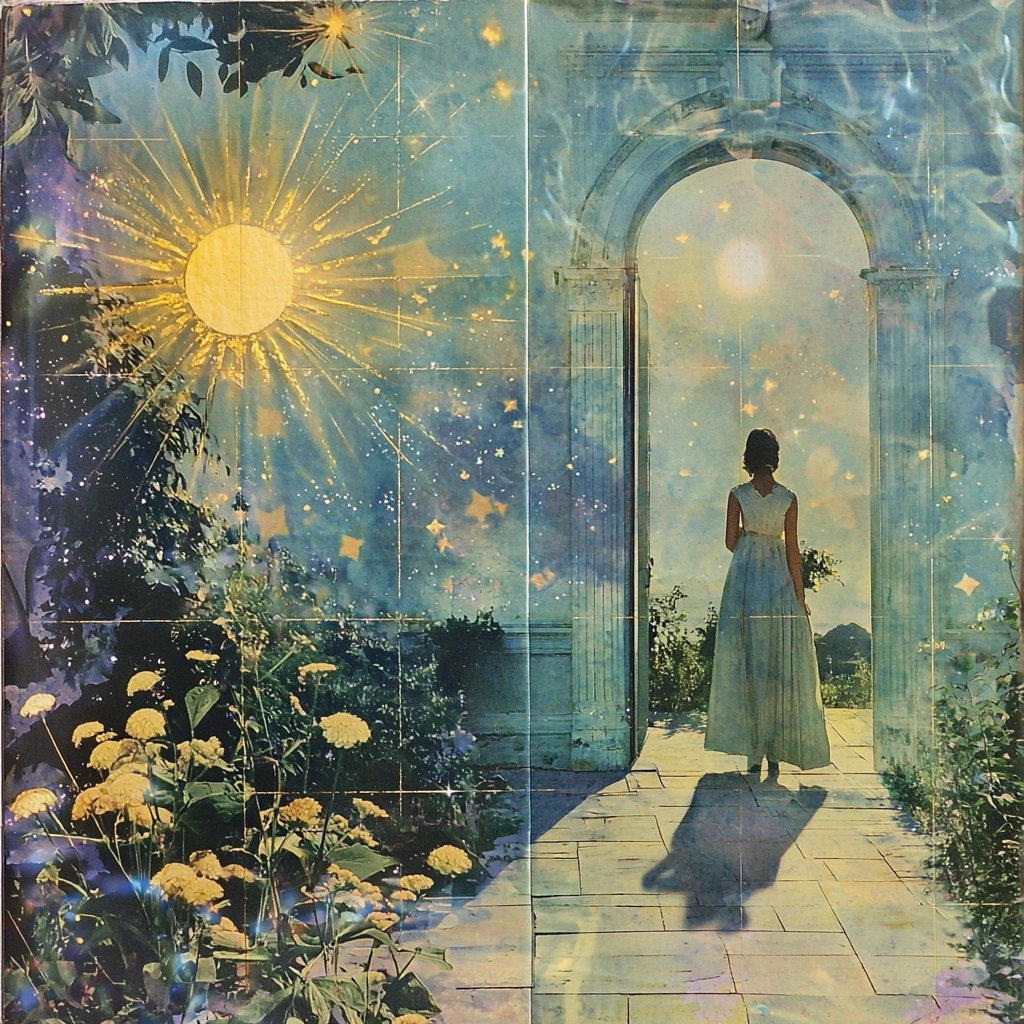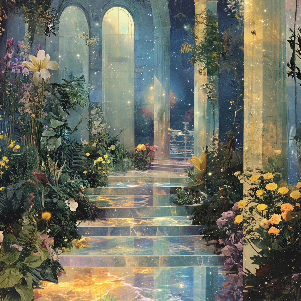 The composition highlights intricate play of light with lush blue tones and golden accents.
