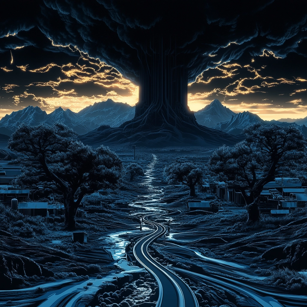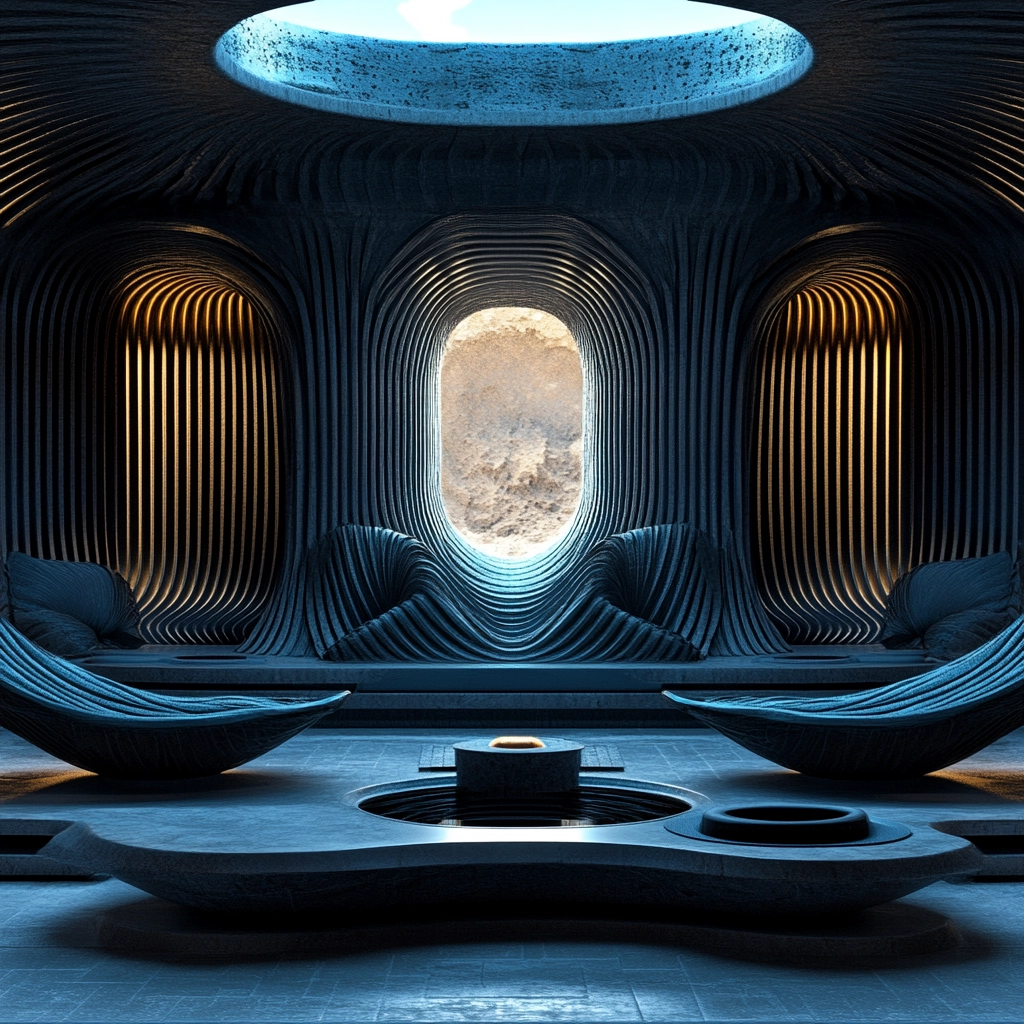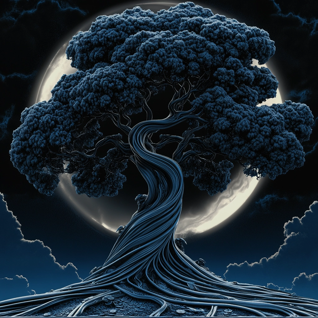 The interplay of light and shadow is pronounced, with dark blue dominating the spatial composition, creating a deep atmospheric mood. Highlights and reflections suggest a nocturnal scene, with textures evoking rugged surfaces and layered luminosity.