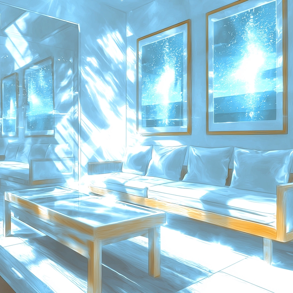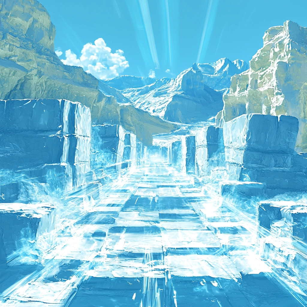 A strong interplay of light and shadow defines this work, emphasizing crisp blues and radiant whites with significant depth. The use of clear and reflective textures enhances the spatial sense, lending a dynamic visual effect.