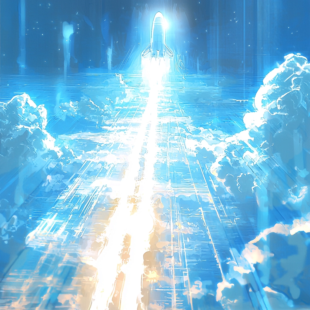 Bright blues and whites create a luminous, expansive scene.