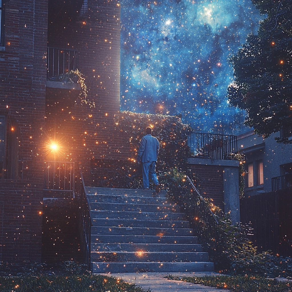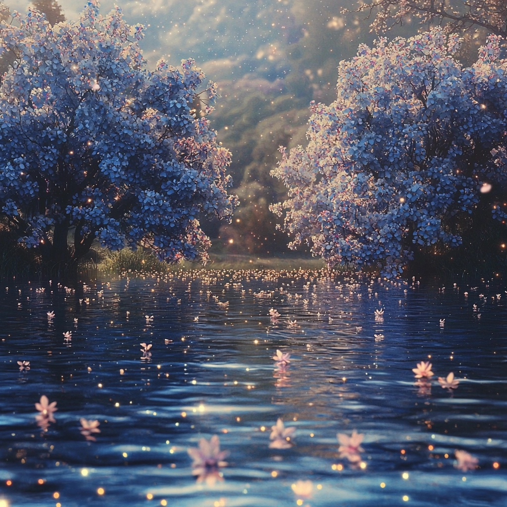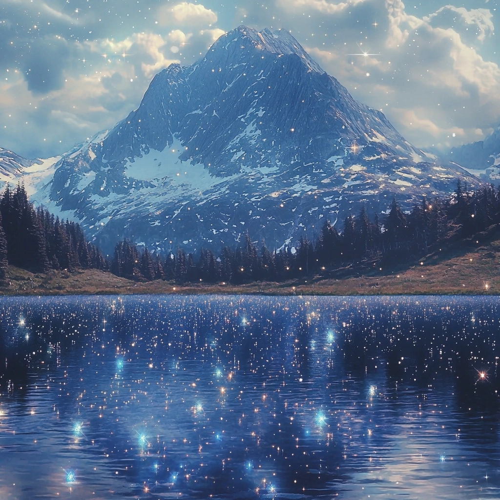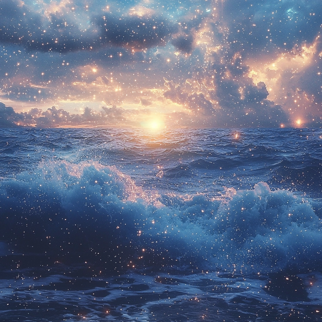The lighting exhibits sparkling effects that simulate starlight, with vibrant dark blue shades enriched by warm golden tones, giving a depth effect and dynamic texture expression.