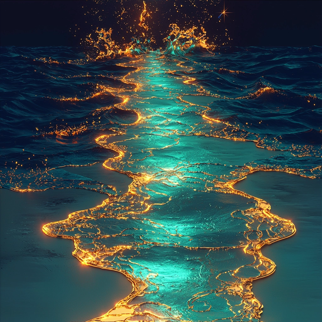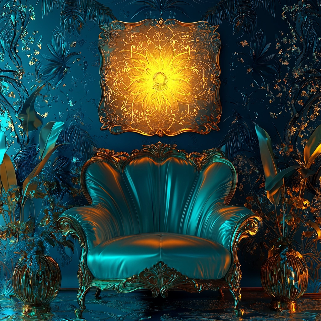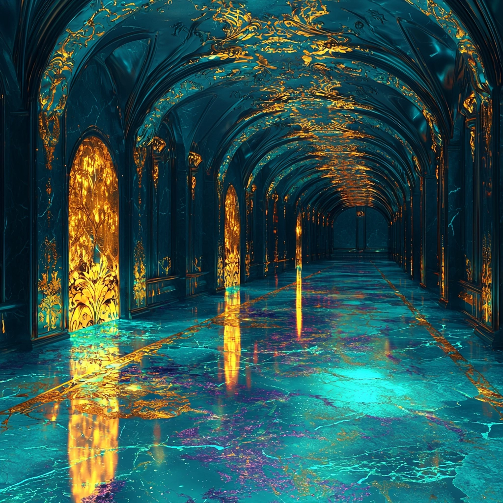 The luminous effect heightens the color contrast, with gold seeming to glow against the dark blue and cyan backdrop, while the intricate patterns create a layered spatial depth that draws the eye through detailed textures.
