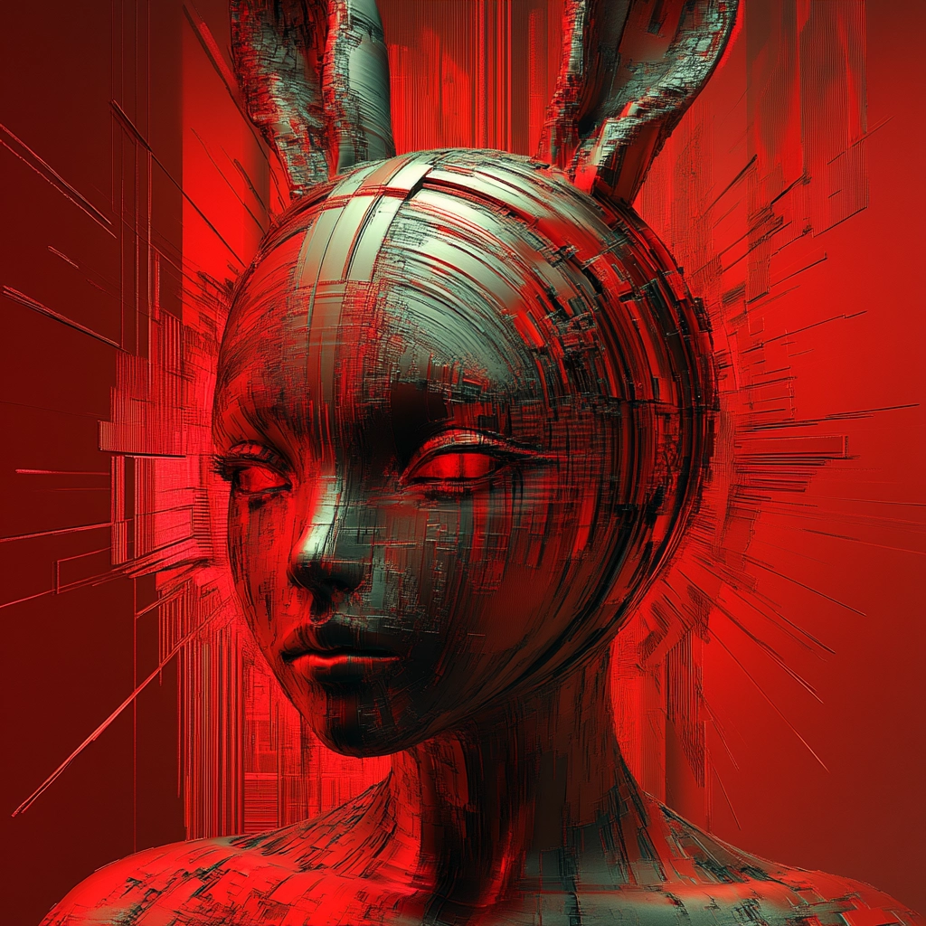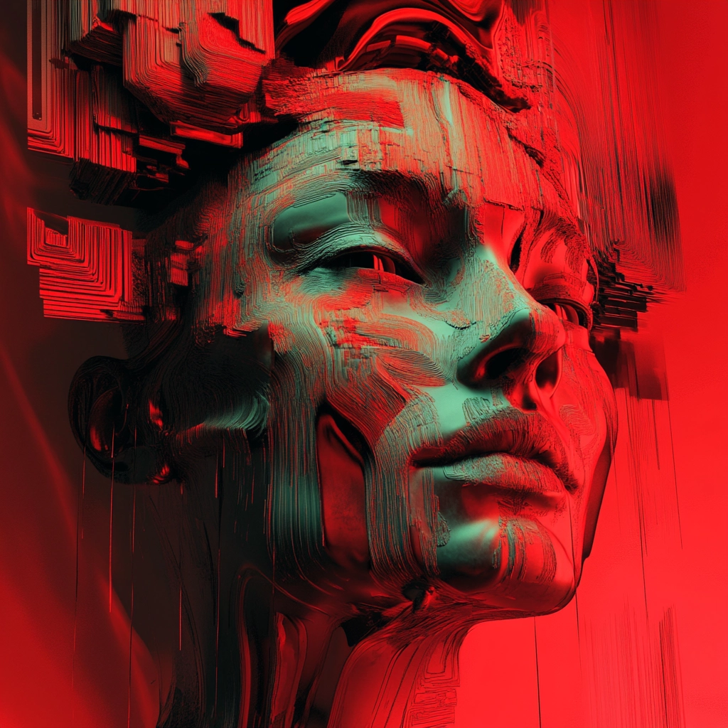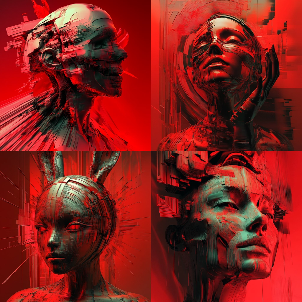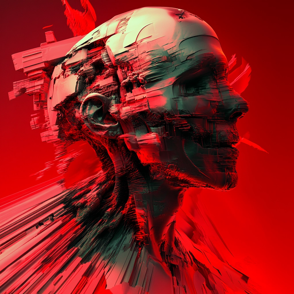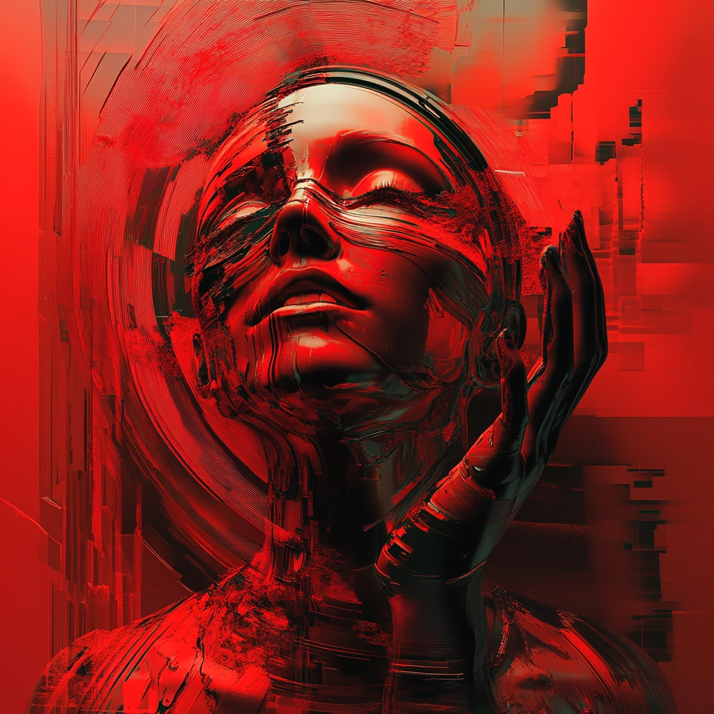 The bold red dominates the visual field, with sharp contrasts against black to create striking patterns. Dynamic fragmentation adds a sense of movement and depth, while intricate textures provide a tactile quality. The illumination emphasizes the complex spatial structures, enhancing the overall intensity.