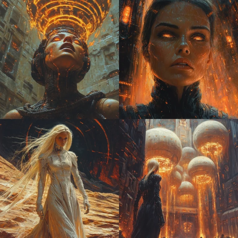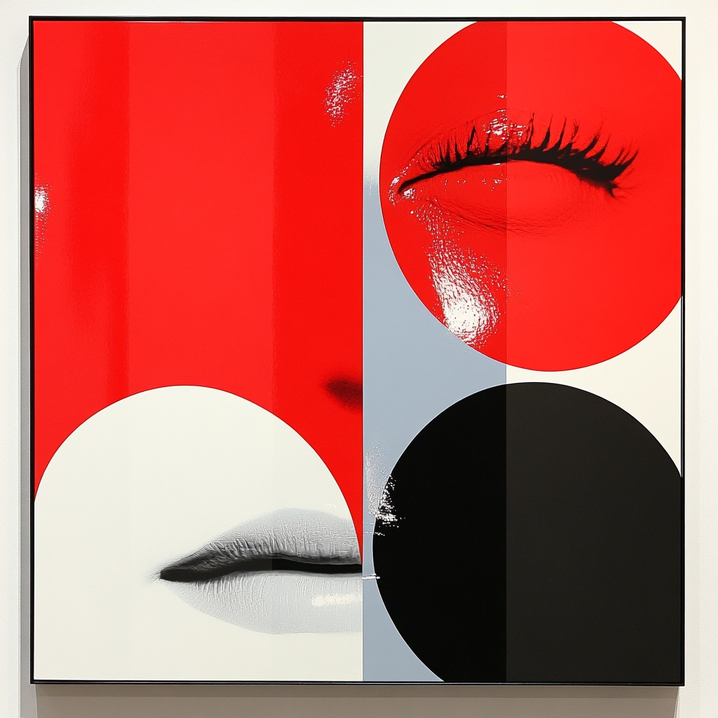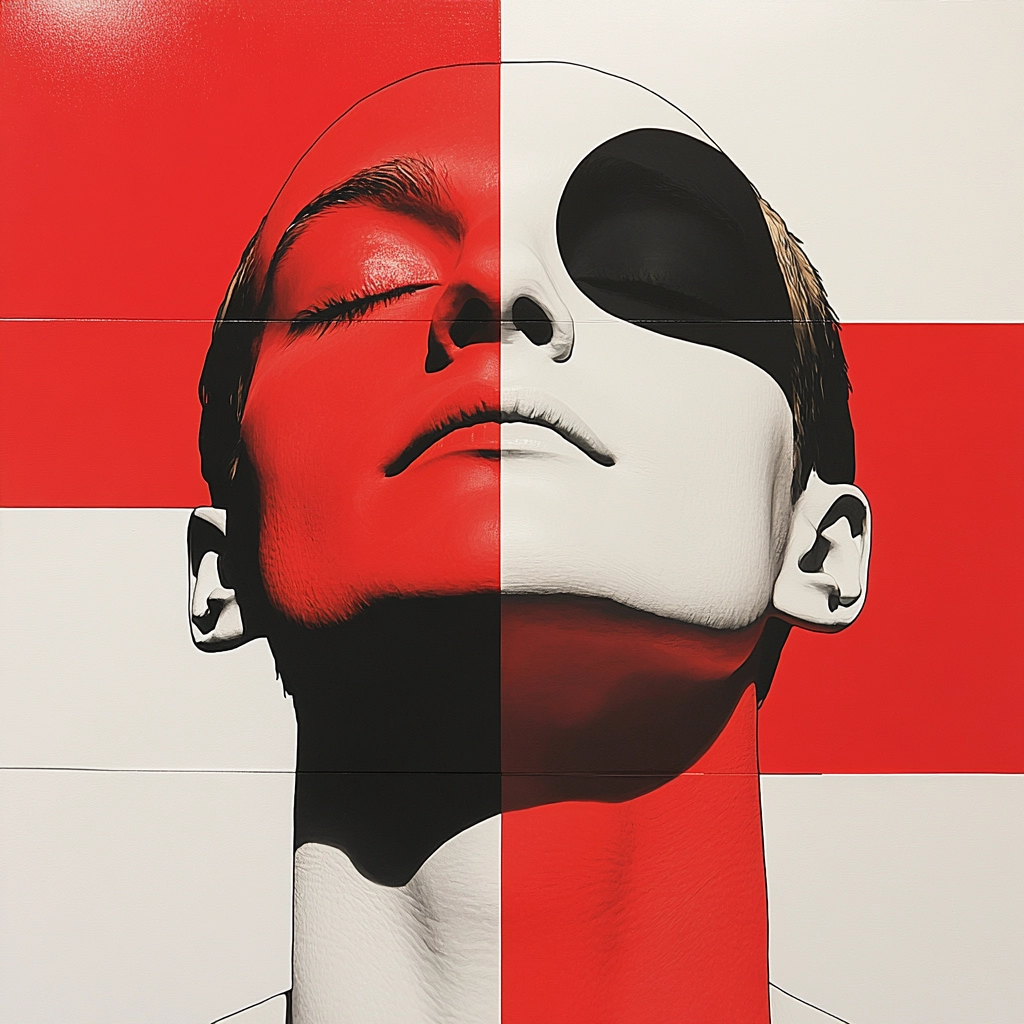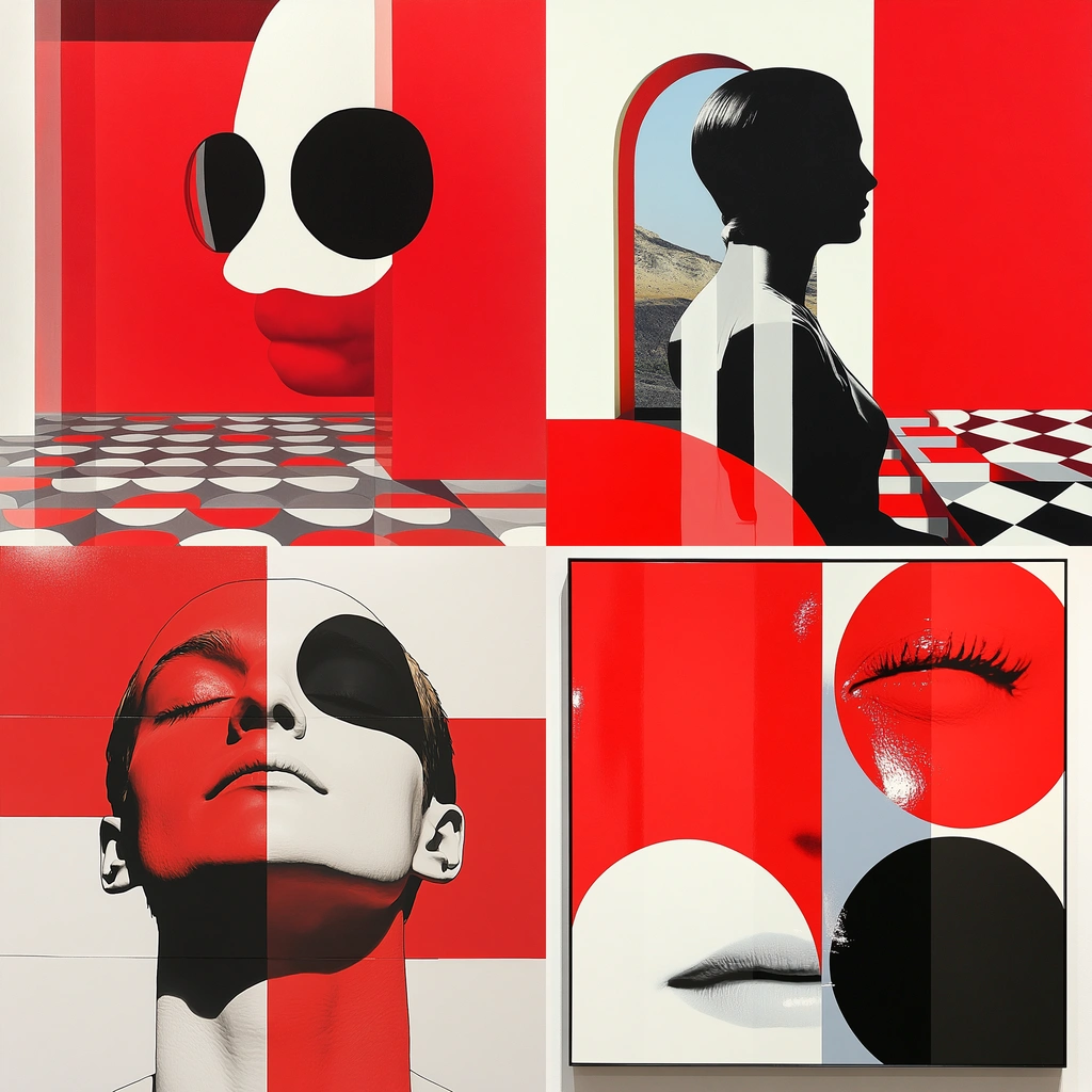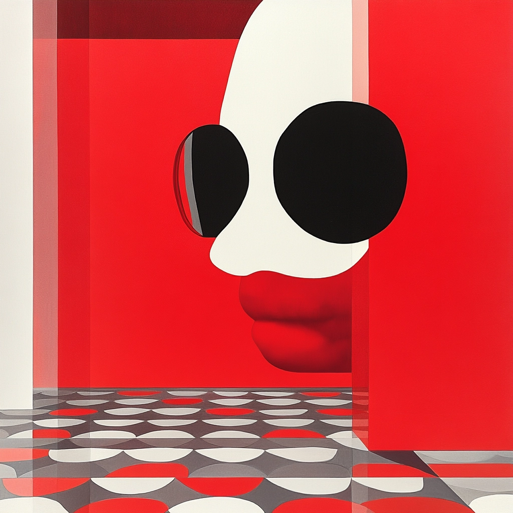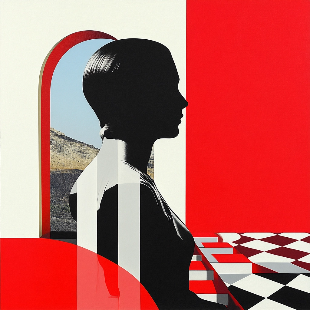 Shadows and highlights create a stark, graphic quality, with crisp lines and saturated colors producing clear sections. The spatial layout is geometrically calculated, emphasizing depth and separations.