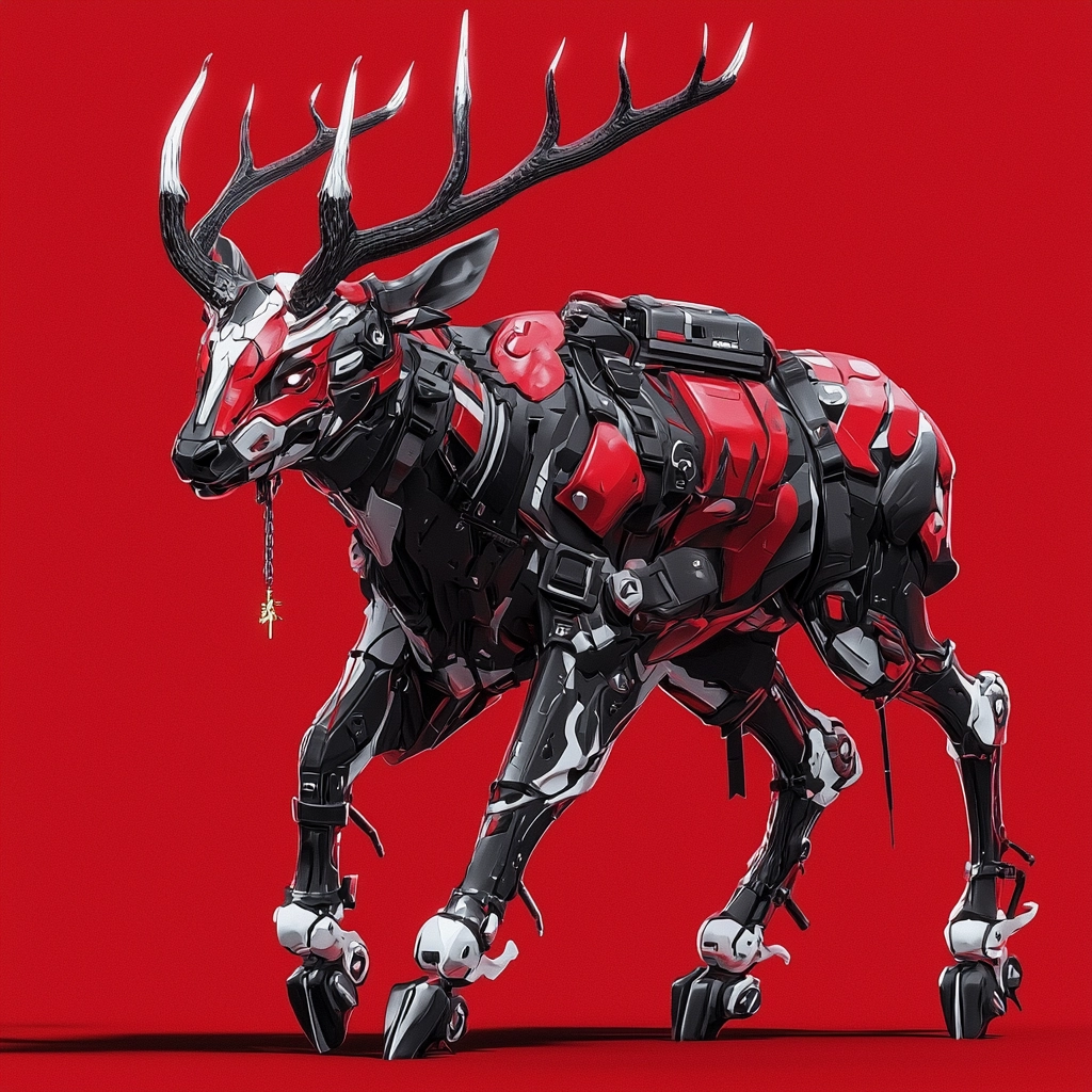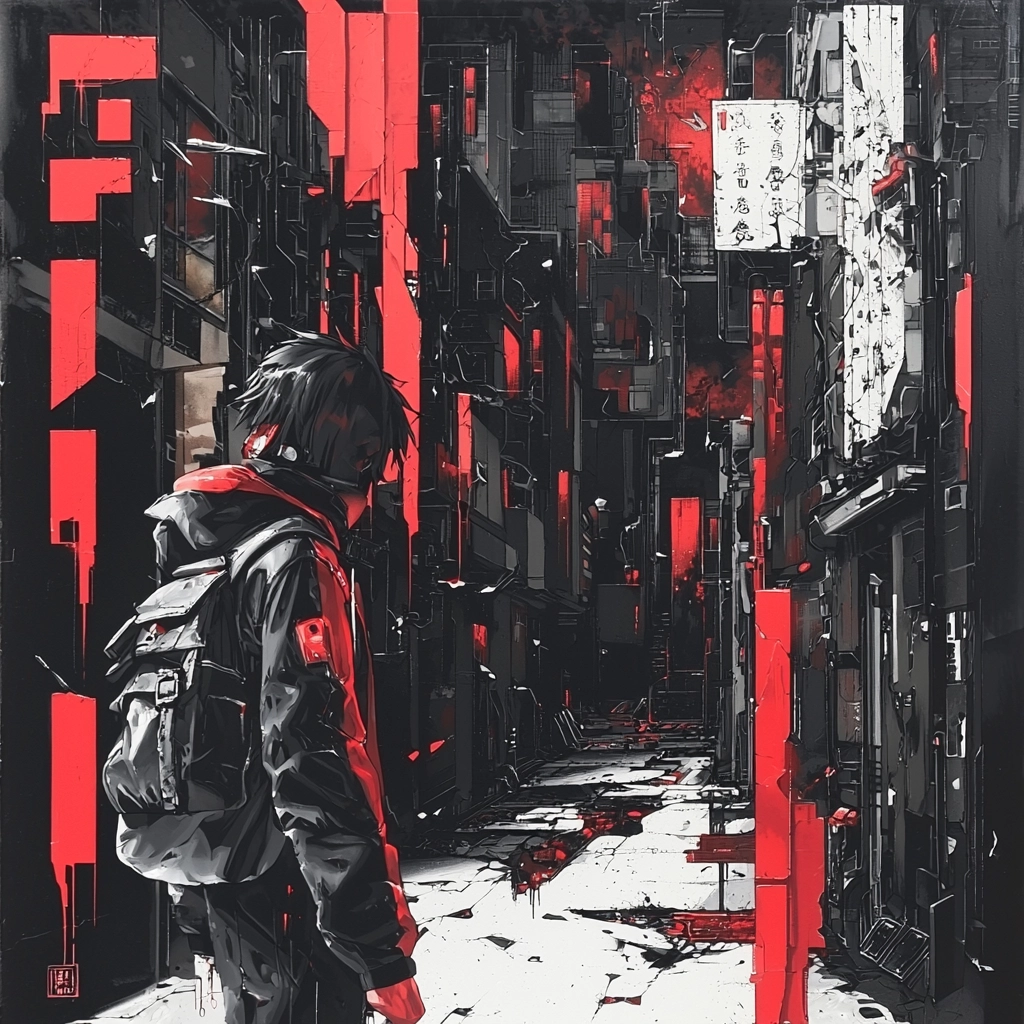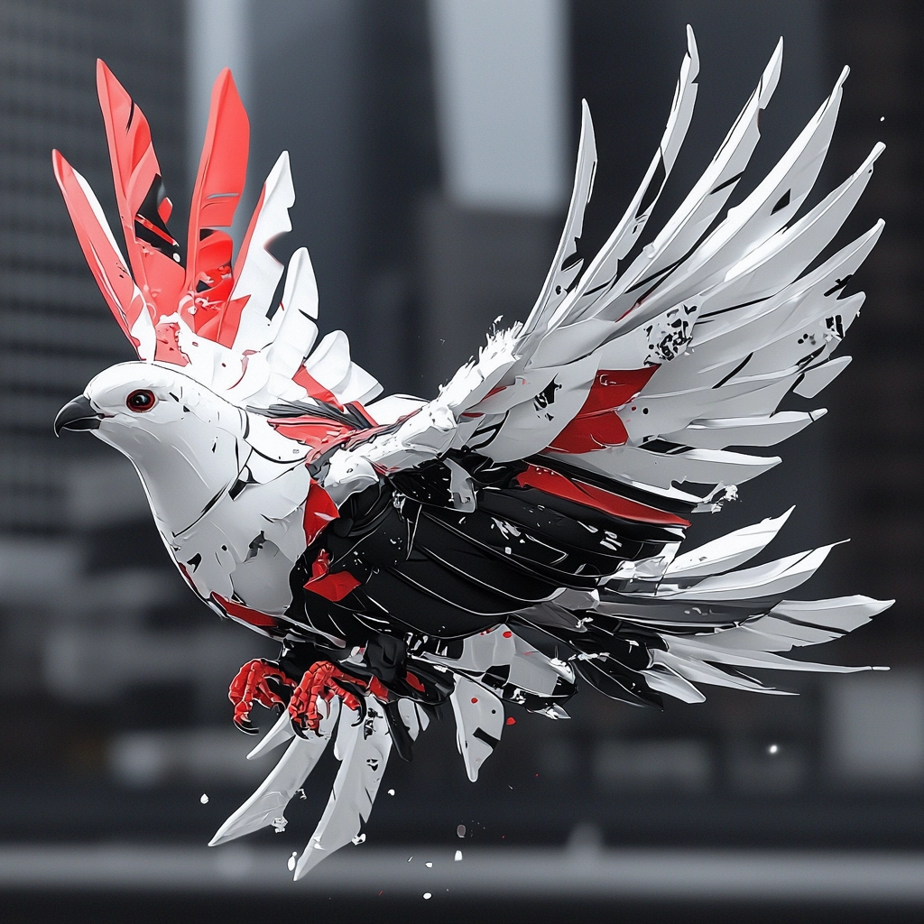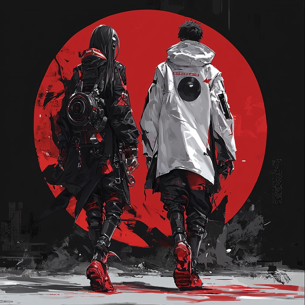 A striking blend of vibrant red, deep black, and bright white, creating a high-contrast futuristic vision with mechanistic elements.