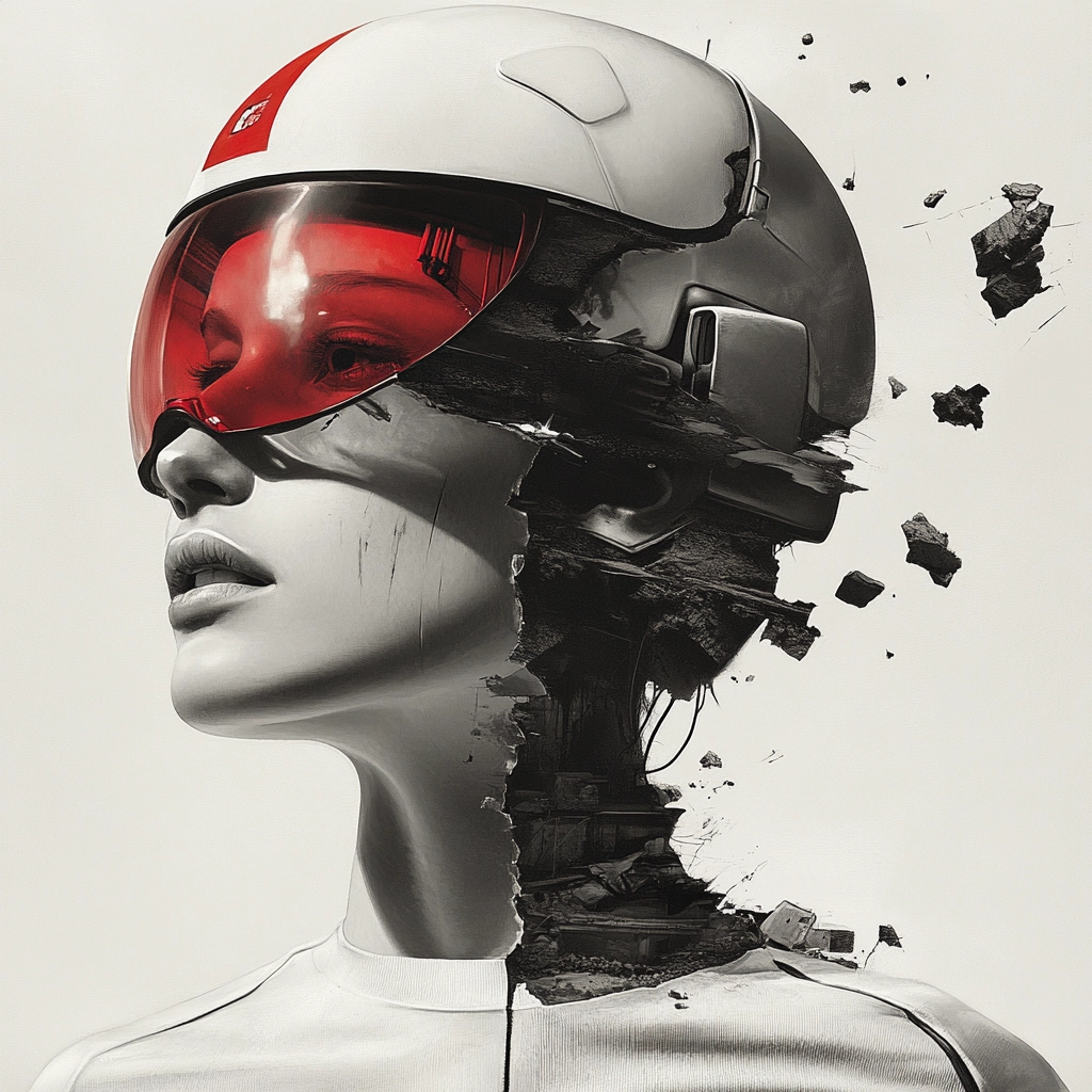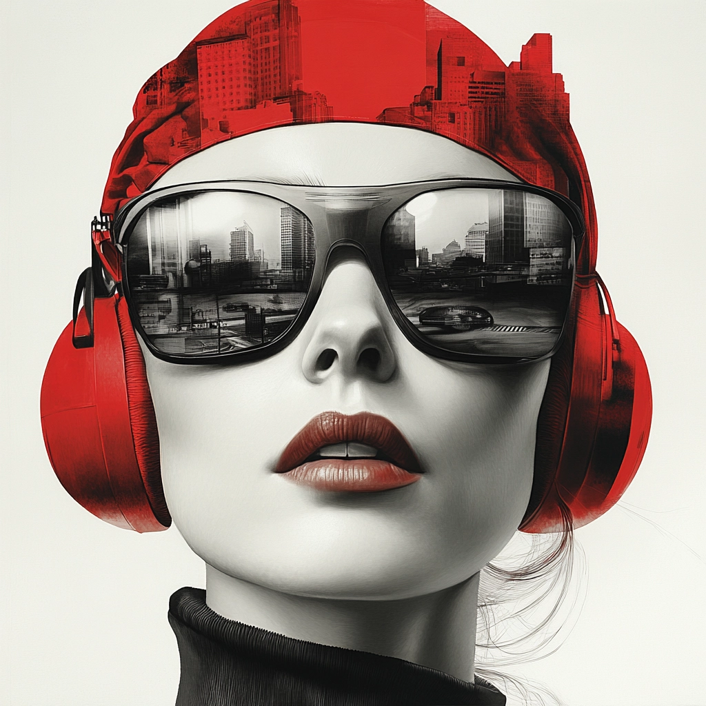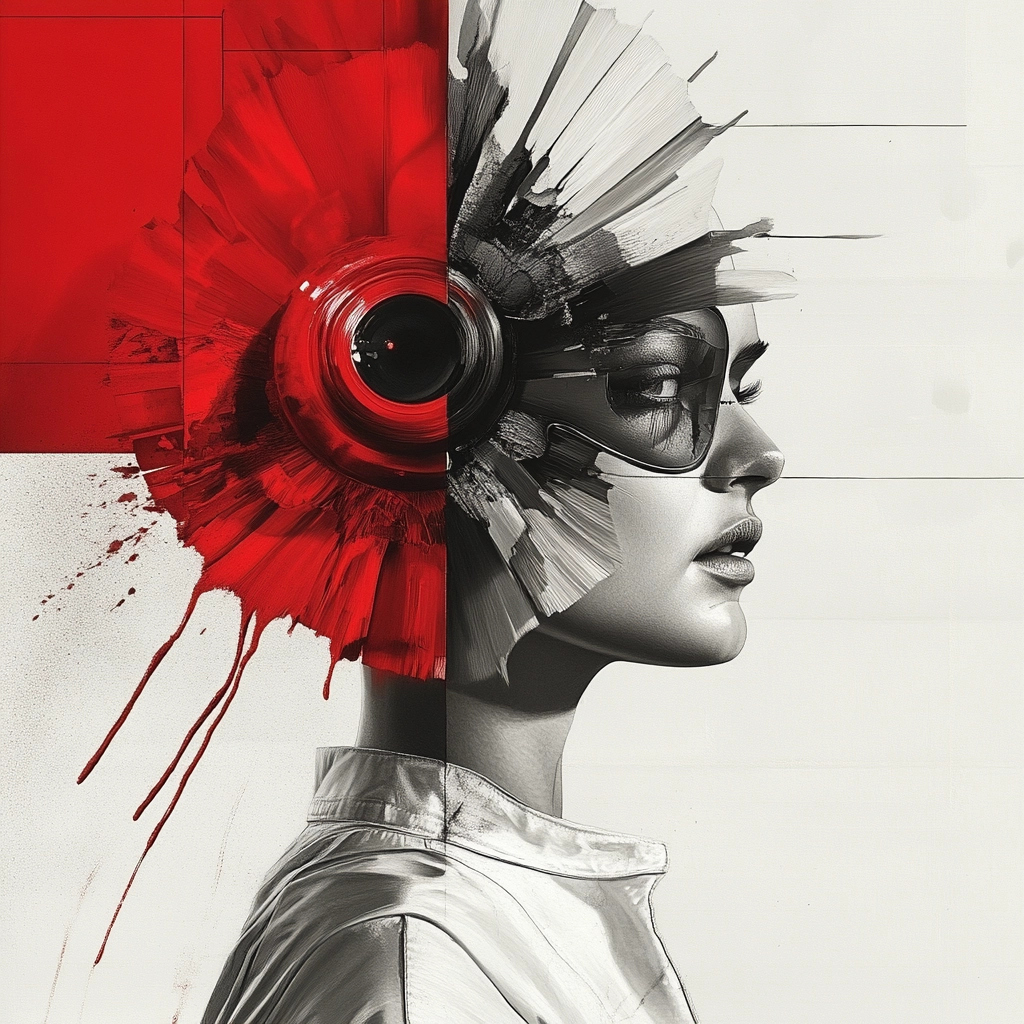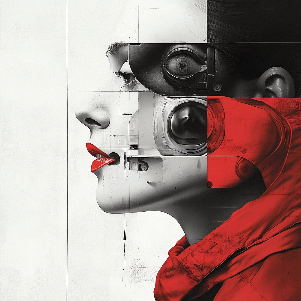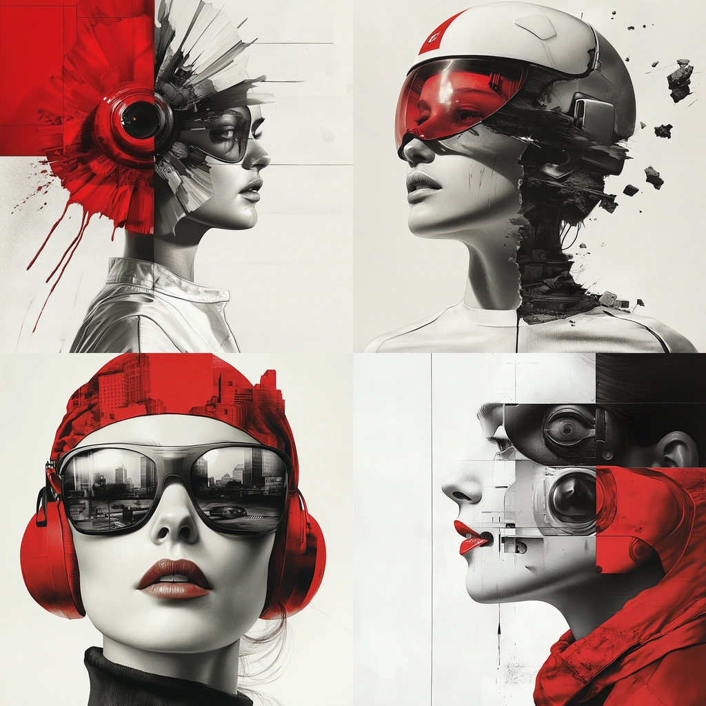 Dominated by strong red and black contrasts with clean white backdrops. Sharp lines and clear spatial separation enhance the modern and bold aesthetic. Minimal textural detail with a focus on clean surfaces.