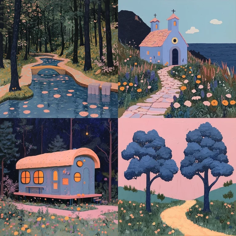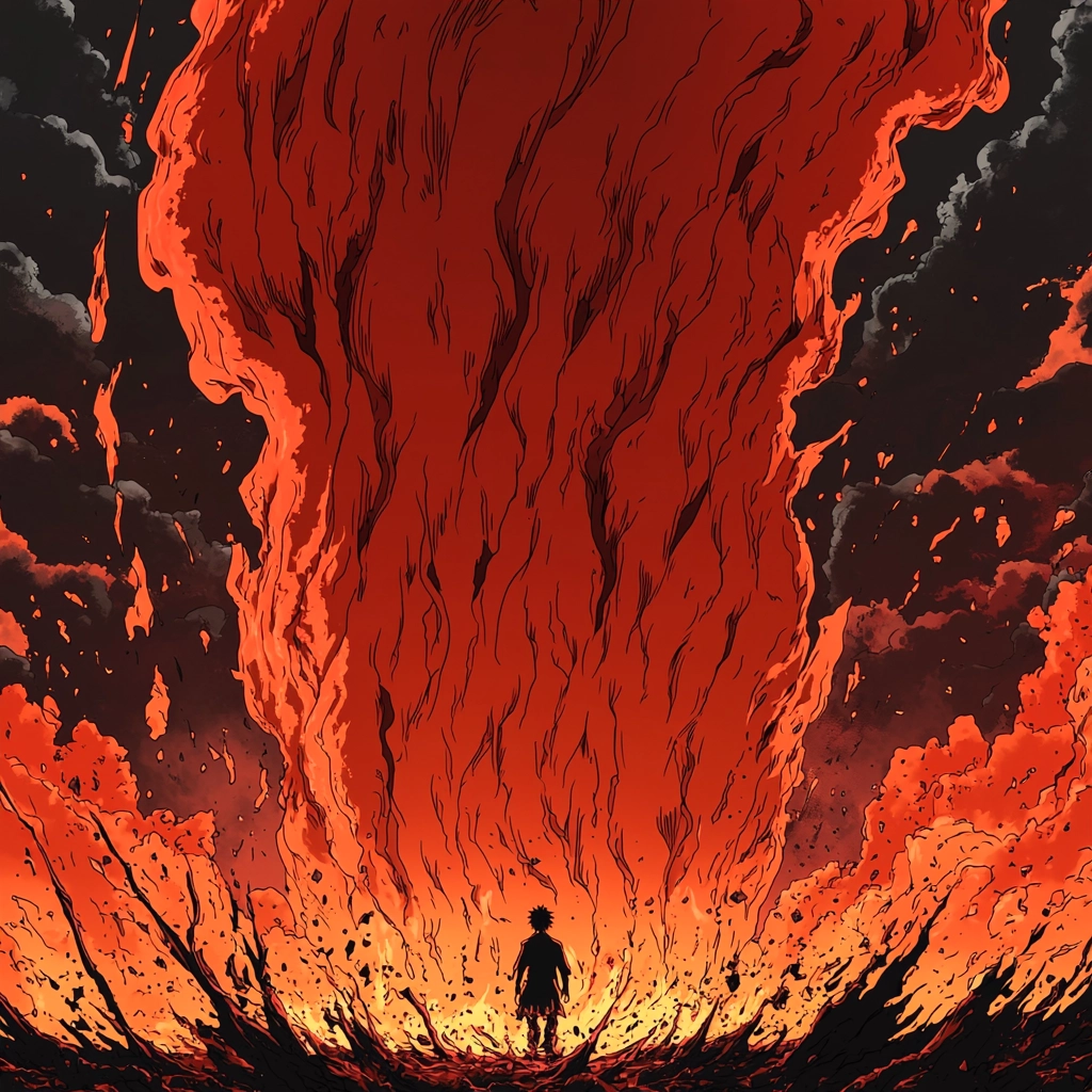 Contrasting fiery reds with deep nighttime blues create a vivid juxtaposition.