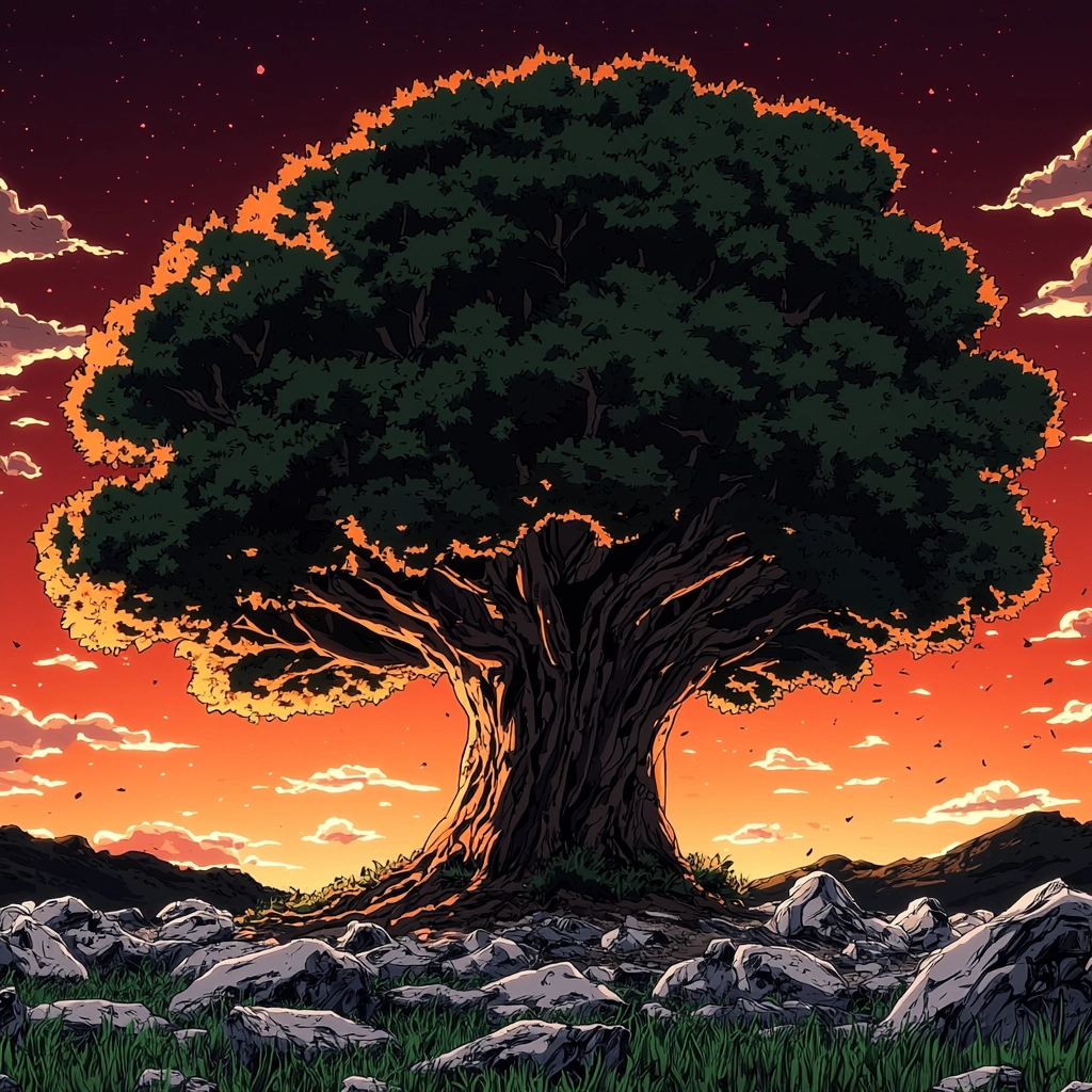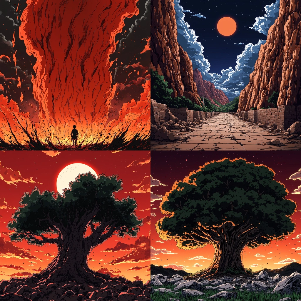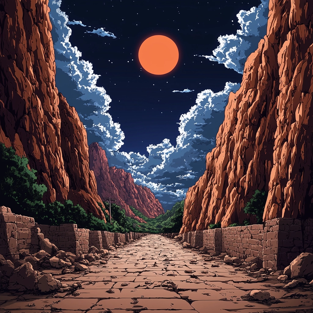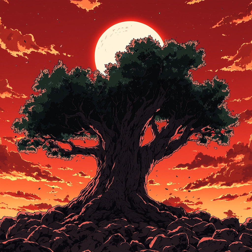 The use of intense red hues against the deep dark blue sky enhances the dramatic effect. The lighting is stark, emphasizing silhouettes and enhancing the textural details. The spatial arrangement guides the eye through dynamic contrasts while balancing the composition harmoniously.