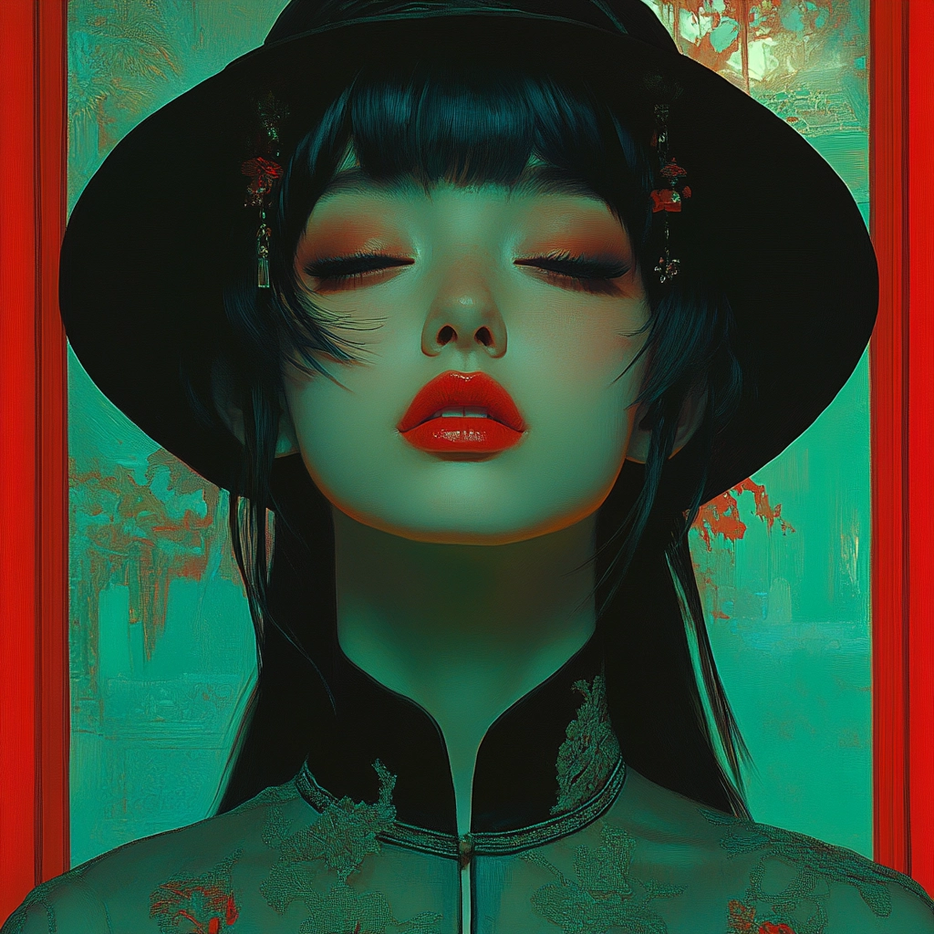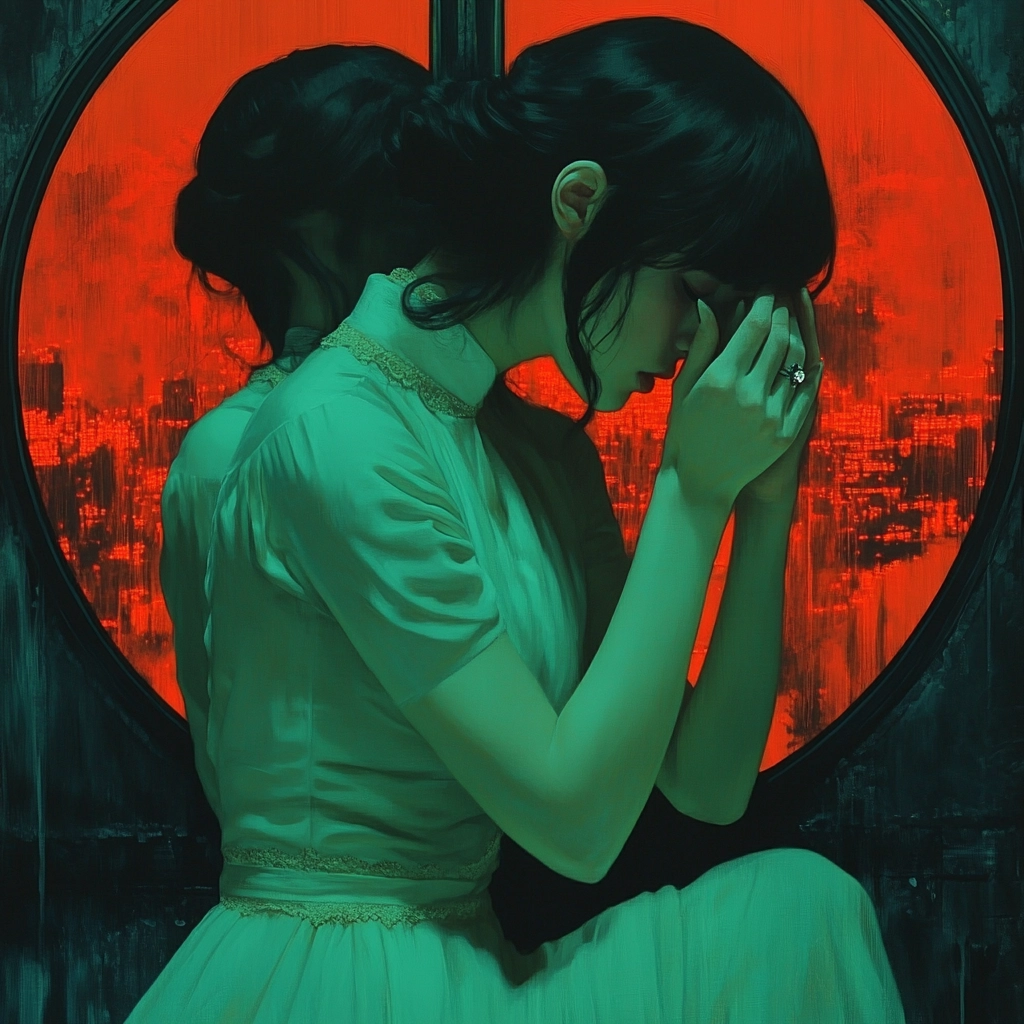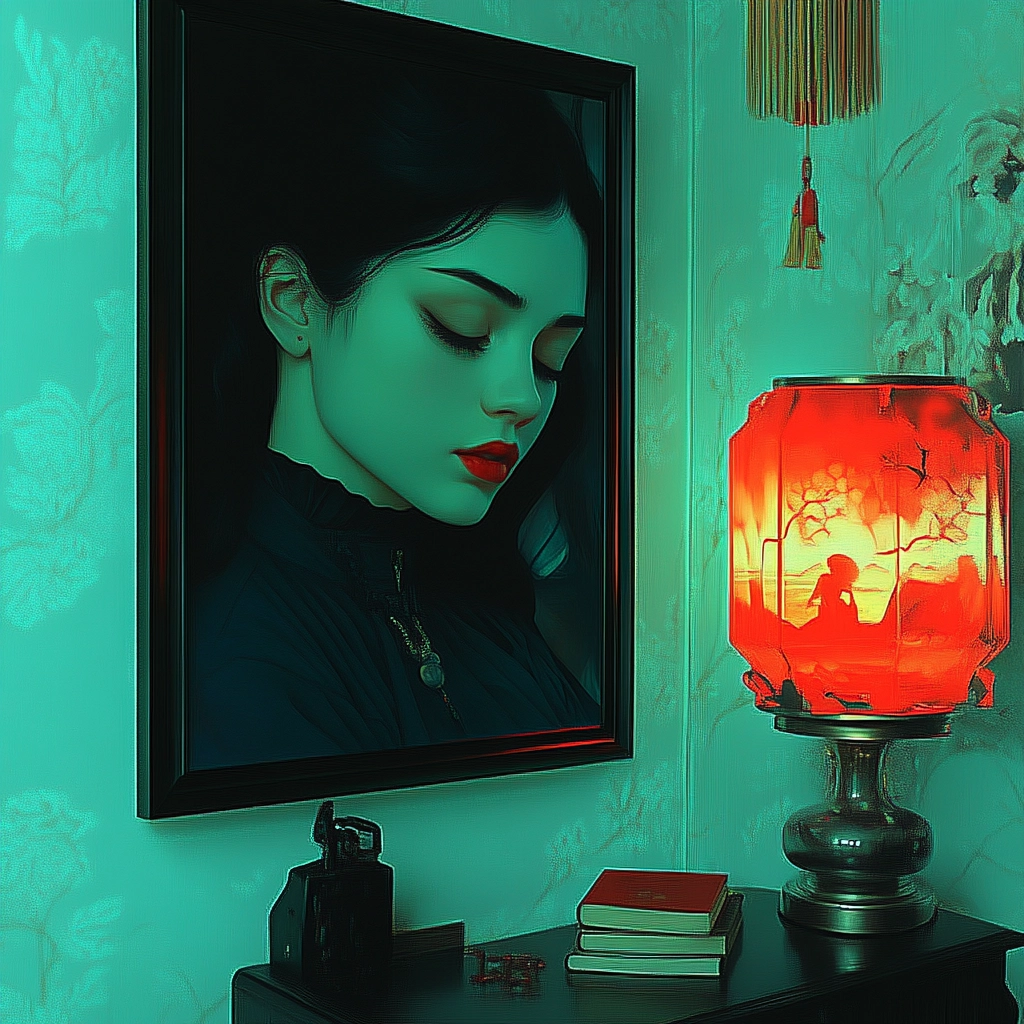 Atmosphere relies on intense lighting for dramatic effects. Red and cyan create striking contrast, enhancing depth and focus. Smooth textures contribute to a refined visual narrative.