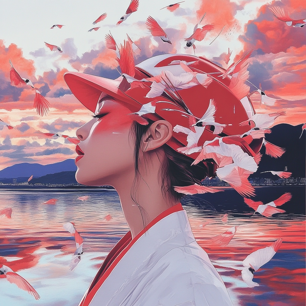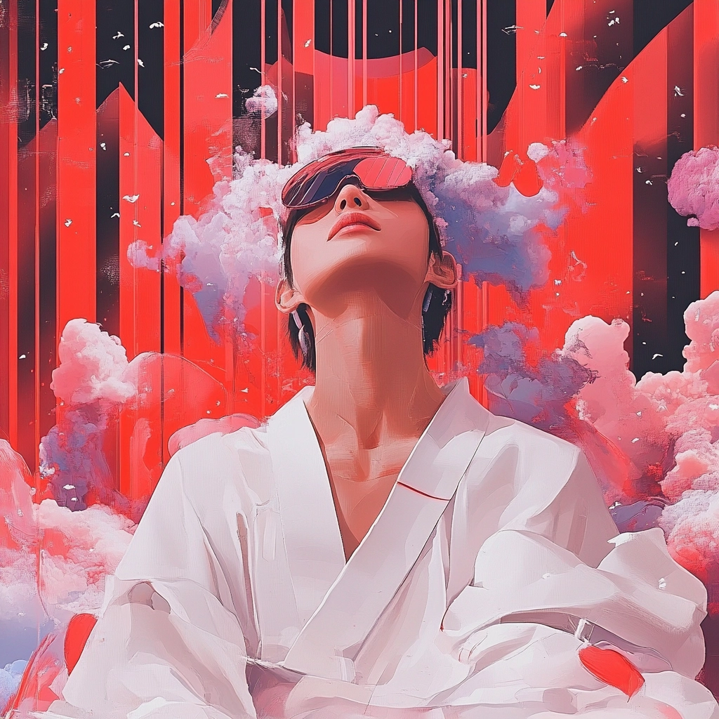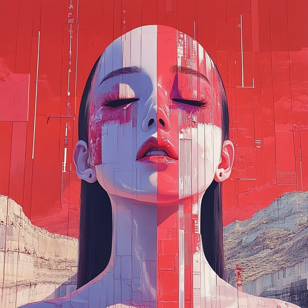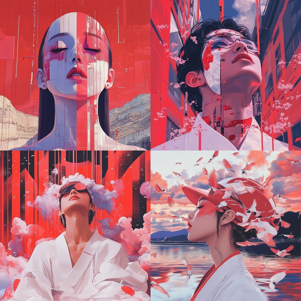 Intense use of vivid red contrasted by clean white elements, creating a striking visual impact.