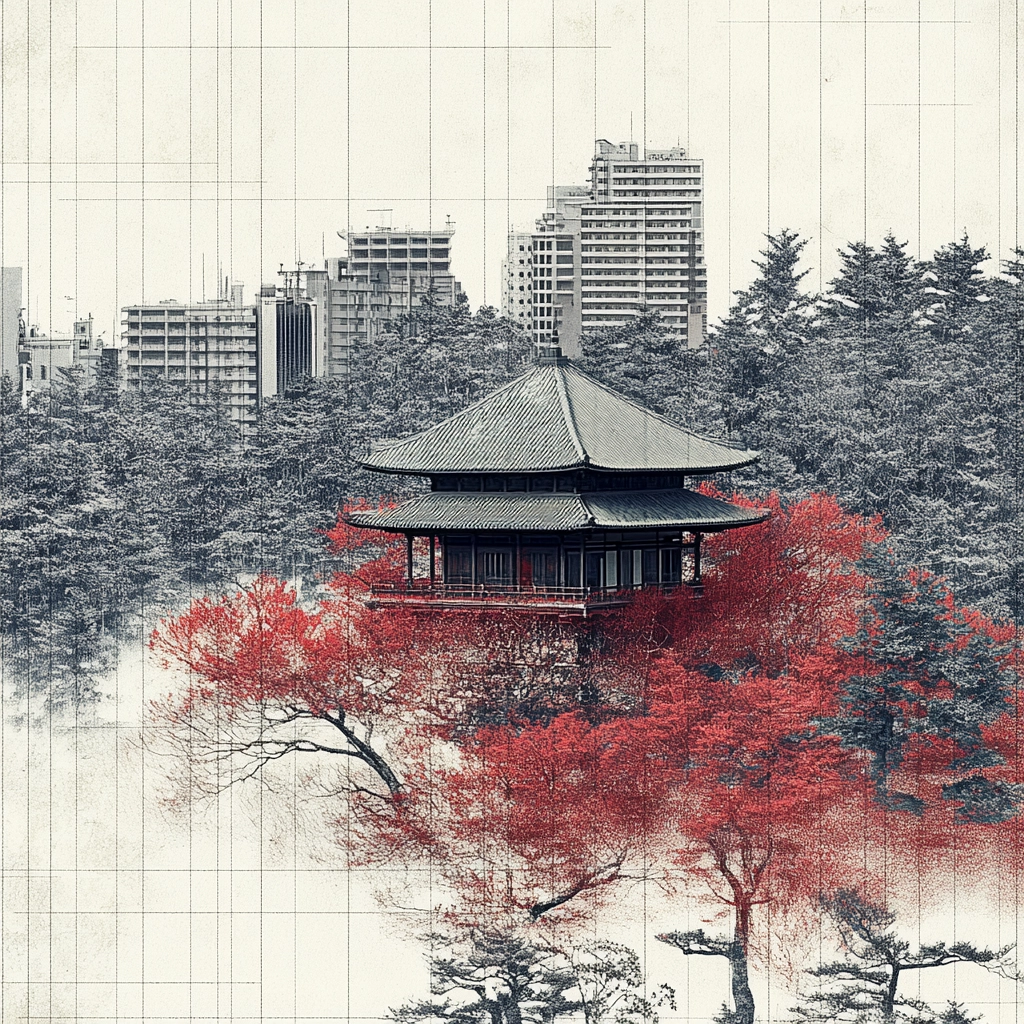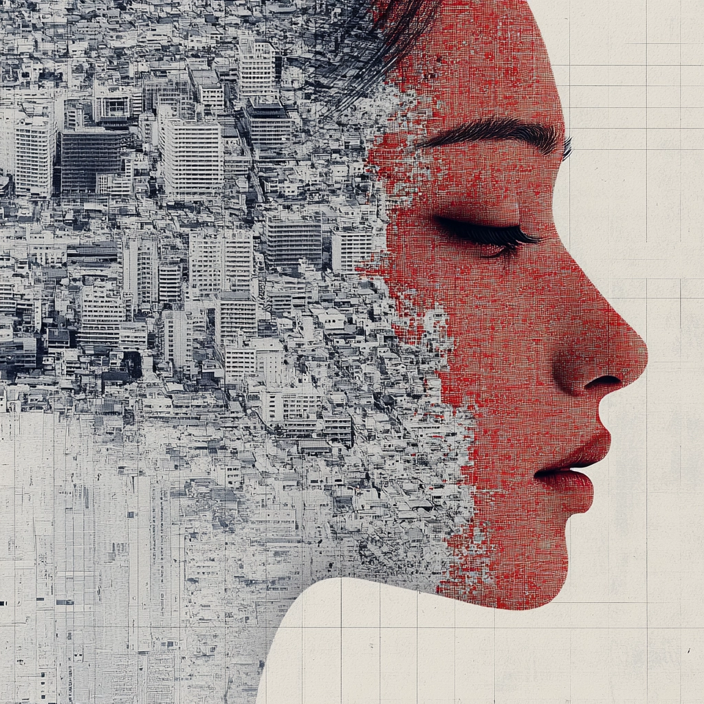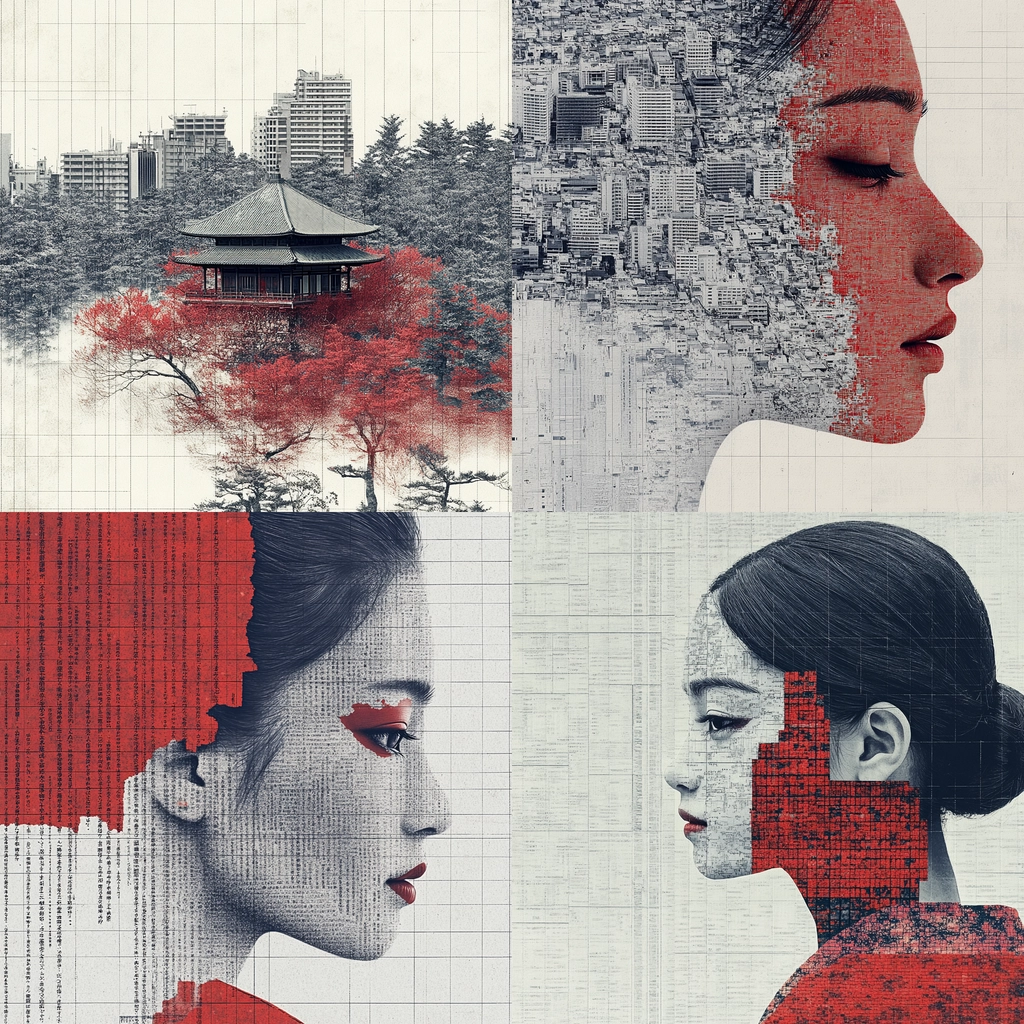 The composition combines architectural details with an overlay of monochromatic and limited color elements, punctuated by contrasting textures.